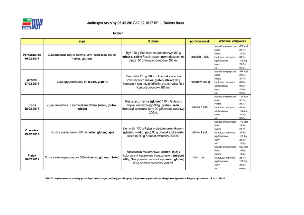 Jadłospis szkolny 06.02.2017-17.02.2017 SP ul.Bulwar Ikara I tydzień zupa Poniedziałek 06.02.2017 Wtorek 07.02.2017 Środa 08.02.2017 Czwartek 09.02.2017 Piątek 10.02.2017 Zupa barszcz biały z ziemniakami i kiełbaską 300 ml (seler, gluten) Zupa grysikowa 300 ml (seler, gluten) Zupa brokułowa z ziemniakami 300ml (seler, gluten, mleko) Rosół z makaronem 300 ml (seler, gluten, jajo) Zupa z zielonego groszku 300 ml (seler, gluten, mleko) II danie Ryż 170 g Sos mięsno-pomidorowy 150 g (gluten, seler) Fasola szparagowa duszona na parze 90 g Kompot owocowy 200 ml. Ziemniaki 170 g Bitka z kurczaka w sosie śmietanowym (seler, gluten,mleko) 90 g Surówka z kapusty pekińskiej z kukurydzą 90 g Kompot owocowy 200 ml. Kasza jęczmienna (gluten) 170 g Gulasz z mięsa wieprzowego 90 g (gluten, seler) Buraczki czerwone tarte 90 g Kompot owocowy 200ml. Ziemniaki 170 g Ryba w cieście naleśnikowym (gluten, mleko, jajo) 90 g Surówka z kapusty kiszonej 90 g Kompot owocowy 200 ml. Zapiekanka makaronowa (gluten, jajo) z kolorowymi warzywami i beszamelem (mleko) 240 g Sos pomidorowo-ziołowy (seler, gluten) 60 g Kompot owocowy 200 ml. Wartości odżywcze podwieczorek gruszka 1 szt. marchew 100 g banan 1 szt. jabłko 1 szt. kiwi 1 szt. wartość energetyczna 672 kcal białko 22,7 g tłuszcz 18,2 g kw.tłuszcz. nasycone 8,21 g węglowodany 116,1 g cukry 24,2 g sól 0,45 g wartość energetyczna 594 kcal białko 22,5 g tłuszcz 23,7 g kw.tłuszcz. nasycone 6,29 g węglowodany 93,5 g cukry 23,8 g sól 0,48 g wartość energetyczna 742 kcal białko 32,1 g tłuszcz 22,1 g kw.tłuszcz. nasycone 4,79 g węglowodany 113,2 g cukry 37,2 g sól 0,52 g wartość energetyczna 773 kcal białko 26,8 g tłuszcz 23,7g kw.tłuszcz. nasycone 3,75 g węglowodany 115,4 g cukry 28,3 g sól 1,02 g wartość energetyczna 630 kcal białko 16,6 g tłuszcz 19,0 g kw.tłuszcz. nasycone 2,51 g węglowodany 111,5 g cukry 28,8 g sól 0,60 g UWAGA! Wytłuszczone zostały produkty i substancje zawierające alergeny lub powodujące reakcje alergiczne zgodnie z Rozporządzeniem UE nr 1169/2011 II tydzień Zupa II danie Wartości odżywcze podwieczorek wartość energetyczna Poniedziałek 13.02.2017 Zupa ogórkowa z ziemniakami 300 ml (seler, gluten, mleko) Ryż 170 g Kurczak w sosie słodko-kwaśnym z ananasem i pomidorami 150g (gluten, seler) Marchew z groszkiem duszona na parze 90 g Kompot owocowy 200 ml. sól 732 kcal 21,6 g 22,8 g 6,10 g 120,6 g 27,4 g 1,22 g 727 kcal 21,9 g 22,8 g 8,20 g 95,2 g 29,2 g 0,70 g 702 kcal 31,6 g 19,9 g 6,8 g 100,9 g 28,5 g 0,96 g 702 kcal 33,6 g 20,8 g 3,98 g 107,7 g 27,0 g 0,69 g wartość energetyczna 784 kcal białko 35,3 g tłuszcz 28,7 g kw.tłuszcz. nasycone 13,73 g węglowodany 111,8 g cukry 27,7 g sól 0,99 g białko tłuszcz gruszka 1 szt. kw.tłuszcz. nasycone węglowodany cukry sól wartość energetyczna białko Wtorek 14.02.2017 Zupa pomidorowa z makaronem 300 ml (seler, gluten, mleko) Ziemniaki 170 g Kotlet mielony (seler, gluten, jajo) 90g Surówka szwedzka 90g Kompot owocowy 200 ml. tłuszcz mandarynka 1 szt. kw.tłuszcz. nasycone węglowodany cukry sól wartość energetyczna białko Środa 15.02.2017 Zupa jarzynowa z ziemniakami 300 ml (seler, gluten, mleko) Kasza gryczana 170 g Bitka wieprzowa w sosie pieczeniowym (seler, gluten) 90 g Buraczki czerwone tarte 90 g Kompot owocowy 200 ml. tłuszcz marchew 100 g kw.tłuszcz. nasycone węglowodany cukry sól wartość energetyczna Czwartek 16.02.2017 Piątek 17.02.2017 Zupa koperkowa z ryżem 300 ml (seler, gluten) Barszcz ukraiński 300 ml (seler, gluten, mleko) Ziemniaki 170 g Ryba pieczona 90 g z salsą pomidorową (gluten, seler) 60 g Surówka z kapusty białej, pora i kukurydzy 90 g Kompot owocowy 200 ml. Leniwe pierogi (gluten, mleko, jajo) 180 g z masełkiem i bułką tartą 20 g Surówka z kapusty czerwonej z rodzynkami 90 g Kompot owocowy 200 ml. białko tłuszcz jabłko 1 szt. kw.tłuszcz. nasycone węglowodany cukry kiwi 1 szt. UWAGA! Wytłuszczone zostały produkty i substancje zawierające alergeny lub powodujące reakcje alergiczne zgodnie z Rozporządzeniem UE nr 1169/2011 Jadłospis szkolny 06.02.2017-17.02.2017 SP ul. Bulwar Ikara 19 Dieta bezmleczna i bezglutenowa I tydzień zupa Poniedziałek 06.02.2017 Wtorek 07.02.2017 Środa 08.02.2017 Czwartek 09.02.2017 Piątek 10.02.2017 Zupa ziemniaczana 300 ml Zupa z kaszą jaglaną 300 ml II danie Ryż 170 g Sos mięsno-pomidorowy 150 g Fasola szparagowa duszona na parze 90 g Kompot owocowy 200 ml. Ziemniaki 170 g Bitka z kurczaka w sosie koperkowym 90 g Surówka z kapusty pekińskiej z kukurydzą 90 g Kompot owocowy 200 ml. Kasza gryczana 170 g Gulasz z mięsa Zupa brokułowa z ziemniakami 300ml Zupa niezabielana wieprzowego 90 g Buraczki czerwone tarte 90 g Kompot owocowy 200ml. Rosół z makaronem 300 ml Dieta beglutenowa: makaron Ziemniaki 170 g Ryba pieczona 90 g Surówka z bezglutenowy kapusty kiszonej 90 g Kompot owocowy 200 ml. Zupa z zielonego groszku 300 ml Zupa niezabielana Ryż zapiekany z jabłkami 240 g Mus owocowy 60 g Surówka z kapusty czerwonej z rodzynkami 90 g Kompot owocowy 200 ml. Wartości odżywcze podwieczorek gruszka 1 szt. marchew 100 g banan 1 szt. jabłko 1 szt. kiwi 1 szt. wartość energetyczna 672 kcal białko 22,7 g tłuszcz 18,2 g kw.tłuszcz. nasycone 8,21 g węglowodany 116,1 g cukry 24,2 g sól 0,45 g wartość energetyczna 594 kcal białko 22,5 g tłuszcz 23,7 g kw.tłuszcz. nasycone 6,29 g węglowodany 93,5 g cukry 23,8 g sól 0,48 g wartość energetyczna 742 kcal białko 32,1 g tłuszcz 22,1 g kw.tłuszcz. nasycone 4,79 g węglowodany 113,2 g cukry 37,2 g sól 0,52 g wartość energetyczna 773 kcal białko 26,8 g tłuszcz 23,7g kw.tłuszcz. nasycone 3,75 g węglowodany 115,4 g cukry 28,3 g sól 1,02 g wartość energetyczna 619 kcal białko 11,5 g tłuszcz 6,8 g kw.tłuszcz. nasycone 2,05 g węglowodany 139,8 g cukry 63,8 g sól 0,73 g UWAGA! Wytłuszczone zostały produkty i substancje zawierające alergeny lub powodujące reakcje