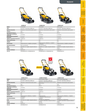 Kosiarki Roboty koszące Autoclip Spis treści Kosiarki ��0 � series Moc �2,22 k� � �,02 ��� � 2�00 rpm �2,22 k� � �,02 ��� � 2�00 rpm �2,12 k� � 2,88 ��� � 2�00 rpm System koszenia zbieranie, mulczowanie, tylny wyrzut zbieranie, mulczowanie, tylny wyrzut zbieranie, mulczowanie, tylny wyrzut Korpus stal stal stal 6]HURNRĝÉNRUSXVX 5HJXODFMDZ\VRNRĝFL koszenia ,ORĝÉSR]\FMLZ\VRNRĝFL koszenia =DNUHVZ\VRNRĝFLNRV]HQLD �8 cm �8 cm �8 cm centralna centralna centralna � pozycji � pozycji � pozycji 27-80 mm 27-80 mm 27-80 mm 3RMHPQRĝÉNRV]D 60 l 60 l 60 l 1DSÛG nie nie Kierownica ergonomiczna, z miękkim uchwytem .RQWURODREURWµZ tak, na uchwycie tak ergonomiczna, składana, z miękkim uchwytem tak, na uchwycie .RĄD 180�2�0 mm, dry�e�, łożyska kulkowe 180�2�0 mm, dry�e�, łożyska kulkowe 180�2�0 mm,dry�e�, łożyska kulkowe :DJD �2 kg �2 kg 26 kg Poziom wibracji 6,�8 m�s� 6,�8 m�s� 6,�8 m�s� Nr art. 2���8�0�8��1�, 2���8�0�8��16 2���860�8��1�, 2���860�8��16 2���8�028��1� Traktory ogrodowe COMBI 48 B �� �� ��� Urządzenia akumulatorowe 48 V / 80V COMBI 48 S �� �� ��� ergonomiczna, z miękkim uchwytem Kosiarki i podcinarki COMBI 48 Silnik Pilarki łańcuchowe Sekatory ustalone Elektryczny rozrusznik INSTART Rozdrabniacze 1RZRĝÉ COMBI 53 SB 67� �� series �n �tart 62� � series �eady �tart Moc �2,12 k� � 2,88 ��� � 2�00 rpm �2,27 k� � �,0� ��� � 2�00 rpm System koszenia zbieranie, mulczowanie, tylny wyrzut Korpus stal �2,�� k� � �,�2 ��� � 2800 rpm zbieranie, mulczowanie, boczny wyrzut, tylny wyrzut stal 6]HURNRĝÉNRUSXVX 5HJXODFMDZ\VRNRĝFL koszenia ,ORĝÉSR]\FMLZ\VRNRĝFL koszenia =DNUHVZ\VRNRĝFLNRV]HQLD �8 cm �8 cm �� cm centralna centralna centralna � pozycji 6 pozycji � pozycji 27-80 mm 2�-�0 mm 27-�0 mm 3RMHPQRĝÉNRV]D 60 l 60 l 60 l 1DSÛG .RQWURODREURWµZ tak ergonomiczna, składana, z miękkim uchwytem ustalone .RĄD 180�2�0 mm, dry�e�, łożyska kulkowe :DJD 28 kg tak ergonomiczna, z wkładkami bębenkowymi ustalone 200�280 mm, plastikowe, z miękkim bieżnikiem, łożyska kulkowe ��,� kg tak ergonomiczna, składana, z miękkim uchwytem ustalone 200�280 mm, rowkowane, z miękkim bieżnikiem, łożyska kulkowe �� kg Poziom wibracji 6,�8 m�s� �,6 m�s� 7,22 m�s� Nr art. 2���86028��1� 2���86628��16 2����6028��1� Kierownica Dmuchawy i odkurzacze COMBI 48 SEQ B ��0 � series zbieranie, mulczowanie, tylny wyrzut stal 17 19 Zamiatarki i materiały Glebogryzarki Wertykulatory eksploatacyjne COMBI 48 S B Silnik