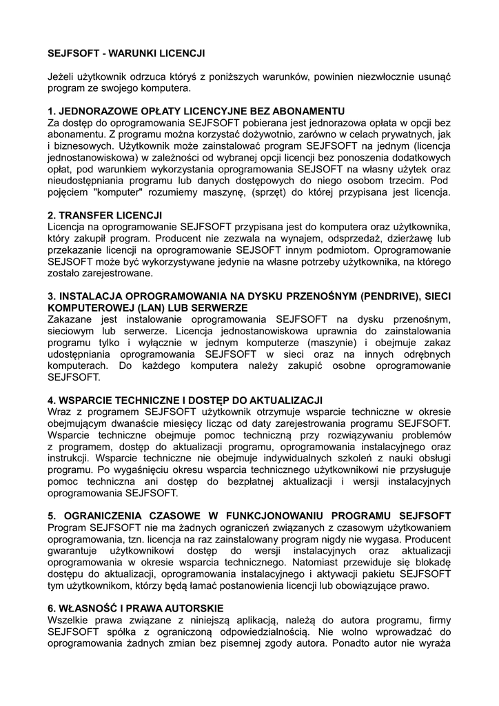 SEJFSOFT - WARUNKI LICENCJI Jeżeli użytkownik odrzuca któryś z poniższych warunków, powinien niezwłocznie usunąć program ze swojego komputera. 1. JEDNORAZOWE OPŁATY LICENCYJNE BEZ ABONAMENTU Za dostęp do oprogramowania SEJFSOFT pobierana jest jednorazowa opłata w opcji bez abonamentu. Z programu można korzystać dożywotnio, zarówno w celach prywatnych, jak i biznesowych. Użytkownik może zainstalować program SEJFSOFT na jednym (licencja jednostanowiskowa) w zależności od wybranej opcji licencji bez ponoszenia dodatkowych opłat, pod warunkiem wykorzystania oprogramowania SEJSOFT na własny użytek oraz nieudostępniania programu lub danych dostępowych do niego osobom trzecim. Pod pojęciem "komputer" rozumiemy maszynę, (sprzęt) do której przypisana jest licencja. 2. TRANSFER LICENCJI Licencja na oprogramowanie SEJFSOFT przypisana jest do komputera oraz użytkownika, który zakupił program. Producent nie zezwala na wynajem, odsprzedaż, dzierżawę lub przekazanie licencji na oprogramowanie SEJSOFT innym podmiotom. Oprogramowanie SEJSOFT może być wykorzystywane jedynie na własne potrzeby użytkownika, na którego zostało zarejestrowane. 3. INSTALACJA OPROGRAMOWANIA NA DYSKU PRZENOŚNYM (PENDRIVE), SIECI KOMPUTEROWEJ (LAN) LUB SERWERZE Zakazane jest instalowanie oprogramowania SEJFSOFT na dysku przenośnym, sieciowym lub serwerze. Licencja jednostanowiskowa uprawnia do zainstalowania programu tylko i wyłącznie w jednym komputerze (maszynie) i obejmuje zakaz udostępniania oprogramowania SEJFSOFT w sieci oraz na innych odrębnych komputerach. Do każdego komputera należy zakupić osobne oprogramowanie SEJFSOFT. 4. WSPARCIE TECHNICZNE I DOSTĘP DO AKTUALIZACJI Wraz z programem SEJFSOFT użytkownik otrzymuje wsparcie techniczne w okresie obejmującym dwanaście miesięcy licząc od daty zarejestrowania programu SEJFSOFT. Wsparcie techniczne obejmuje pomoc techniczną przy rozwiązywaniu problemów z programem, dostęp do aktualizacji programu, oprogramowania instalacyjnego oraz instrukcji. Wsparcie techniczne nie obejmuje indywidualnych szkoleń z nauki obsługi programu. Po wygaśnięciu okresu wsparcia technicznego użytkownikowi nie przysługuje pomoc techniczna ani dostęp do bezpłatnej aktualizacji i wersji instalacyjnych oprogramowania SEJFSOFT. 5. OGRANICZENIA CZASOWE W FUNKCJONOWANIU PROGRAMU SEJFSOFT Program SEJFSOFT nie ma żadnych ograniczeń związanych z czasowym użytkowaniem oprogramowania, tzn. licencja na raz zainstalowany program nigdy nie wygasa. Producent gwarantuje użytkownikowi dostęp do wersji instalacyjnych oraz aktualizacji oprogramowania w okresie wsparcia technicznego. Natomiast przewiduje się blokadę dostępu do aktualizacji, oprogramowania instalacyjnego i aktywacji pakietu SEJFSOFT tym użytkownikom, którzy będą łamać postanowienia licencji lub obowiązujące prawo. 6. WŁASNOŚĆ I PRAWA AUTORSKIE Wszelkie prawa związane z niniejszą aplikacją, należą do autora programu, firmy SEJFSOFT spółka z ograniczoną odpowiedzialnością. Nie wolno wprowadzać do oprogramowania żadnych zmian bez pisemnej zgody autora. Ponadto autor nie wyraża zgody na stosowanie technik inżynierii wstecznej, dekompilowanie, debugowanie ani na próby odkrycia kodu źródłowego programu lub jego części. Kod źródłowy oprogramowania SEJFSOFT stanowi własność intelektualną autora i nie będzie ujawniany. 7. WYKORZYSTANIE PROGRAMU SEJFSOFT Autor nie ponosi żadnej odpowiedzialności za skutki wykorzystania oprogramowania do celów niezgodnych z obowiązującym prawem. Użytkownik ponosi pełną odpowiedzialność za skutki wynikające z używania programu. Autor oprogramowania podejmie wszelkie dostępne środki mające na celu wyeliminowanie z grona użytkowników osób, które będą łamały obowiązujące prawo. 8. DYSTRYBUCJA/ROZPOWSZECHNIANIE Aplikacja rozpowszechniana jest wyłącznie poprzez witrynę sejfsoft.pl. Udostępnianie programu w magazynach komputerowych, nośnikach elektronicznych, sieciach lokalnych i handlowych oraz Internecie wymaga pisemnej zgody autora. Użytkownik może sporządzić jedną kopię programu wyłącznie na swój własny użytek. Autor programu nie wyraża zgodny na sprzedaż lub udostępnianie programu SEJFSOFT. 9. GWARANCJA BEZPIECZNEGO KODU PROGRAMU SEJFSOFT Autor programu SEJFSOFT dołożył wszelkich starań, aby przygotowane oprogramowanie było wolne od błędów oraz usterek. Autor gwarantuje, że program SEJFSOFT nie zawiera żadnego szkodliwego kodu, a w szczególności wirusów, trojanów, szpiegów oraz reklam. Ponadto plik wykonywalny (program) wchodzący w skład programu SEJFSOFT został zabezpieczony kodem przez autora, dzięki czemu można potwierdzić jego autentyczność. 10. OGRANICZENIE ODPOWIEDZIALNOŚCI ZA EWENTUALNE SZKODY W najszerszym zakresie dopuszczonym przez prawo właściwe autor programu nie jest w żadnym wypadku odpowiedzialny za jakiekolwiek powstałe szkody (w tym, bez ograniczeń, szkody wynikłe ze strat w prowadzonej działalności, przerw w prowadzeniu działalności, utraty informacji związanych z prowadzoną działalnością lub inne szkody pieniężne) wynikające z użytkowania lub niemożliwości użytkowania oprogramowania. 11. OGRANICZENIE GWARANCJI Użytkownik przyjmuje do wiadomości, że oprogramowanie jest dostarczane w stanie, „w jakim zostało wytworzone”, bez jakiejkolwiek gwarancji, a w szczególności gwarancji w zakresie przydatności do określonych celów. Producent nie może zagwarantować, że program SEJFSOFT będzie działał prawidłowo w połączeniu z każdym sprzętem komputerowym, systemem operacyjnym lub oprogramowaniem pochodzącym od firm trzecich. Autor programu SEJFSOFT nie może także zagwarantować, że oprogramowanie spełni wszystkie oczekiwania użytkownika, tzn. posiadać będzie funkcjonalność, która nie została wyraźnie opisana w dokumentacji użytkowej, a zdaniem użytkownika powinna być zawarta w programie