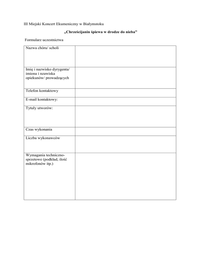 III Miejski Koncert Ekumeniczny w Białymstoku „Chrześcijanin śpiewa w drodze do nieba” Formularz uczestnictwa Nazwa chóru/ scholi Imię i nazwisko dyrygenta/ imiona i nzawiska opiekunów/ prowadzących Telefon kontaktowy E-mail kontaktowy: Tytuły utworów: Czas wykonania Liczba wykonawców Wymagania technicznosprzetowe (podkład, ilość mikrofonów itp.)