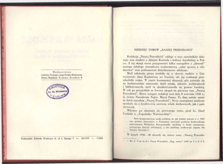 DZIESIĘĆ TOMÓW „NASZEJ PRZESZŁOŚCI” Redakcja „Naszej Przeszłości"’ oddaje w ręce czytelników dzie siąty tom studiów z dziejów Kościoła i kultury katolickiej w Pol sce. Z tej okazji warto przypomnieć kilka szczegółów z „historii” naszego młodego stosunkowo wydawnictwa, „zdać sprawę z włodarstwa” oraz podsumować dotychczasowe zdobycze. Myśl założenia pisma zrodziła się w okresie studiów w Uni wersytecie Jana Kazimierza we Lwowie, ale jej realizacji prze szkodziła wojna. W czasie koszmarnej okupacji, gdy patrzało się na barbarzyńskie niszczenie dzieł sztuki, zbiorów archiwalnych i bibliotecznych, myśl ta skonkretyzowała się jeszcze bardziej. W rok po przyjeździe ze Lwowa ukazał się pierwszy tom „Naszej Przeszłości” . Słowo wstępne redakcji nosi datę 8 września 1946 r., tj. święto Narodzenia Najśw. Maryi Panny. Tę datę należy uznać za dzień narodzin „Naszej Przeszłości” . Nowe czasopismo naukowe spotkało się z życzliwością zarówno władz duchownych, jak i pań stwowych. W ydaw nictw o Instytutu T e o lo g ic z n e g o K s ię ż y M is jo n a rz y A d re s R e d a k c ji: K r a k ó w , S t r a d o m 4 Wkrótce po ukazaniu się pierwszego tomu, pisał ks. Józef Umiński w „Tygodniku Warszawskim” : B yło kom prom itacją nauki polsk iej, że jak trafnie jeszcze w r. 1925 (na zjeździe historyków w Poznaniu) zauważył profesor krakow skiego uniwersytetu Władysław K onopczyń ski, mieliśmy, w kraju czasopism o, pośw ięcone historii reform a cji, a nie mieliśmy naukow ego organu dla dziejów K ościoła *). W latach 1946— 48 ukazały się cztery tomy „Naszej PrzeszłoK ra k o w s k ie Z a k ła d y G ra fic z n e 4, ul. J. S a re g o 7 — 2 6 1 /5 9 — 1 .5 0 0 1 Ks. J. U m i ń s k i , Nasza P rzeszłość, „T y g . warsz.” 1947 nr 1 z cl. 5 I. I K.. ALFONS SCHLETZ 6 [2 ] ści” . Studia nasze spotkały się z uznaniem, czego dowodem liczne recenzje i wzmianki w czasopismach fachowych i tygodnikach. Dla przykładu przytoczymy tu słowa Mariana Tyrowicza, umiesz czone w „Nowinach Literackich"’ : M ylił by się gruntownie każdy, ktoby przypuszczał, że w kraju tak zasadniczo katolickim , jakim jest Polska — dziejopisarstw o K ościoła ka tolick iego — stanęło na należnej mu w yżynie i poziom ie naukowym, zaspakajającym wymagania now oczesnej wiedzy historycznej. D ość stw ier dzić, że dotąd brak jest w naszej literaturze historycznej oryginalnego i pełnego podręcznika dziejów K ościoła w P olsce i — pow iedzm y śmiało — jednostronnością u jęć, których nie brakow ało w dotychczasow ej h istoriografii. Już trzy pierwsze tom y zapowiadają cha” *). „Śmiała inicjatywa" została wkrótce zahamowana na okres dziewięciu lat. Działalność swą wznawia wydawnictwo w r. 1957. Do współpracy zgłaszają się liczni pracownicy naukowi, tak świec cy, jak i duchowni. „Nasza Przeszłość” wychodzi po przerwie w nowej, bardziej estetycznej szacie. Ministerstwo Kultury i Sztu ki przydziela piękny papier. Z pomocą finansową spieszy Prymas Polski Ks. Kard. Stefan Wyszyński. Dzięki przychylności hierar chii kościelnej i władz państwowych pismo może ukazywać się regularnie. Trudno nie wspominać i o autorach. Spotykamy wśród nich nazwiska znanych historyków z wszystkich ośrodków naukowych. Współpracują z nami prawie wszyscy historycy Kościoła w Polsce. Nie brak wśród nich i początkujących pracowników naukowych, którym otwieramy łamy naszych studiów. Autorzy — powiedzmy to szczerze — są naszymi oddanymi przyjaciółmi i zarazem do brodziejami, gdyż piszą bezinteresownie. Z konieczności idziemy za przykładem Zachodu, gdzie autorom drukującym swe prace 2 7 w czasopismach naukowych, nie zawsze wypłaca się honorarium. Może przy większej ilości prenumeratorów będziemy mogli wy wiązać się należycie z tego obowiązku. Ciągle jeszcze brak nam ludzi. Całą redakcję i administrację prowadzą dwie osoby. Na powiększenie personelu nie ma fun duszów. Podnoszą nas na duchu słowa Ks. Kard. Wyszyńskiego, napisane z okazji złotego jubileuszu „Ateneum Kapłańskiego” , a które w brzmieniu dosłownym pragnęlibyśmy odnieść i do „N a szej Przeszłości” . Doświadczenia trudnej drogi są błogosławieństwem dla w ydawnictwa, gdyż kształcą charaktery łudzi, uczą ich serdecznej m iłości Praw dy, o fia ry i cierpienia dla niej. Łatwizna życiow a rodzi spłycenie myśli i wysiłku zdobyw czego *). obecną, rzucenia za gadnień ściśle religijno-historycznych na „w ielk ie drogi ludzkiego du M. T y r o w i c z, T rzy tom y „N aszej P rzeszłości” , „N ow iny Literackie” 1947 nr 35 z d. 16 X I. DZIESIĘĆ TOMÓW „NASZEJ PRZESZŁOŚCI" [...] Trzy pierwsze tom y „N aszej Przeszłości” — to zaledw ie zapow iedź śmiałej inicjatyw y, utrudnionej katastrofą pożaru i rozsypki archiw ów, bibliotek i m uzeów, kierunek n ow y: pow iązanie przeszłości z chw ilą [3 ] Zaciekawi zapewne czytelników, jak przedstawia się bilans do tychczasowej działalności naszego wydawnictwa. W „Naszej Prze szłości’" drukowało rozprawy, miscellanea, recenzje czy sprawo zdania 99 autorów, w tej liczbie 47 świeckich autorów, 3 biskupów, 25 kapłanów diecezjalnych, 21 członków zakonów i zgromadzeń, 3 zakonnice. Podajemy ich nazwiska w porządku alfabetycznym: Arcab Jan ks. (Łódź) Banaś Beatrix s. urszulanka (Częstochowa) Bar Joachim o. 0 . F. M. Conv. (Kraków) Bartel W ojciech (Kraków) Barycz Henryk (Kraków) Bazielich Antoni o. C. SS. R. (Toruń) Bazielich Wiktor (Katowice) Bogdan Franciszek ks. S. A. C. (Ołtarzew) Bogdanowicz Piotr (Zakopane) Bracha Franciszek ks. C. M. (Kraków) Budkowa Zofia (Kraków) Czapiewski Paweł ks. (Turze) Drzymała Kazimierz ks. T. J. (Kraków) 3 Prymas Polski na Z loty Jubileusz A ten eum K apłańskiego, „A ten . Kapł."’ R. 51: 1959 s. 