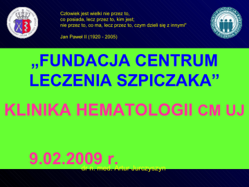 Człowiek jest wielki nie przez to, co posiada, lecz przez to, kim jest; nie przez to, co ma, lecz przez to, czym dzieli się z innymi" Jan Paweł II (1920 - 2005) „FUNDACJA CENTRUM LECZENIA SZPICZAKA” KLINIKA HEMATOLOGII CM UJ 9.02.2009 r. dr n. med. Artur Jurczyszyn Kalendarz szczepień po auto-PBSCT dzięki uprzejmości prof. A. Prof. Andrzej Lange konsultant krajowy w zakresie immunologii klinicznej Po allo-PBSCT WWW.SZPICZAK.ORG W dniach od 20 do22 lutego 2009 roku odbędzie się w Olsztynie IV ZJAZD POLSKIEGO STOWARZYSZENIA POMOCY CHORYM NA SZPICZAKA mgr Halina Lebiedowicz z Kliniki Hematologii SU będzie tam miała dwa wykłady 2. Kompleksowa terapia szpiczaka na miarę XXI wieku – idea Centrum Leczenia Szpiczaka w Polsce 3. W chorym ciele – chory duch – Czy to prawda? Rysunek ideowy przyszłego CENTRUM LECZENIA SZPICZAKA – budynek dwupiętrowy około 2000 metrów kwadratowych Pokoje hotelowe dla gości i pracowników Kaplica dla pacjentów Laboratorium oraz Centrum Badawcze Pokój Fundacji Gabinet psychologa Oddział dzienny: 20-25 łóżek Sale operacyjne (vertebroplastyka oraz kyfoplastyka) Oddział dializacyjny – 5 stanowisk Stanowiska intensywnej terapii Gabinety konsultacyjne oraz Dzienny Ośrodek Leczenia Gabinet neurologa oraz Pracownia Neurofizjologiczna Sale konferencyjne Pracownia RTG oraz RADIOTERAPIA Gabinet echo serca i USG Na budynek oraz wyposażenie potrzebujemy minimum około 12 mln USD 23 marzec 2009 roku – /poniedziałek/ godzina 16.00 Klinika Hematologii CM UJ Zaburzenie białkowe u chorych ze szpiczakiem mnogim. Najnowsza diagnostyka i doświadczenia własne dr hab. med. Ryszard Drożdż Zakład Diagnostyki 27 kwietnia 2009 roku – /poniedziałek/ godzina 16.00 Klinika Hematologii CM UJ USZKODZENIE MIĘŚNIA SERCOWEGO U CHORYCH PO CHEMIOTERAPII - ZASADY PREWENCJI I LECZENIA Prof. Krzysztof J. Filipiak I Katedra i Klinika Kardiologii WUM 02-097 Warszawa, ul. Banacha 1a 11 maj 2009 roku – /poniedziałek/ godzina 16.00 Klinika Hematologii CM UJ ZABIEGI NEUROCHIRURGICZNE i ORTOPEDYCZNE u CHORYCH ze SZPICZAKIEM MNOGIM – doświadczenia własne dr hab. med. Ryszard Czepko Podhalański Szpital Specjalistyczny w Nowym Targu Problemy kostne u chorych ze SZPICZAKIEM MNOGIM – doświadczenia własne dr med. Piotr Wojciechowski Katedra i Klinika Ortopedii i Traumtologii Narządu Ruchu ŚAM 15 czerwca 2009 roku – /poniedziałek/ godzina 16.00 Klinika Hematologii CM UJ Problemy pacjentów z przewlekłą chorobą nowotworową mgr Halina Lebiedowicz Klinika Hematologii CM UJ dr Mariola Kosowicz PICIE ZIELONEJ HERBATY PODCZAS TERAPII SZPICZAKA Z WYKORZYSTANIEM BORTEZOMIBU JEST ZDECYDOWANIE ZABRONIONE Z UWAGI NA MOŻLIWOŚĆ ZABLOKOWANIA EFEKTU P-NOWOTWOROWEGO BORTEZOMIBU PRZEZ ZIELONĄ HERBATĘ !!!