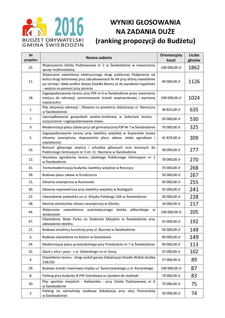 WYNIKI GŁOSOWANIA NA ZADANIA DUŻE (ranking propozycji do