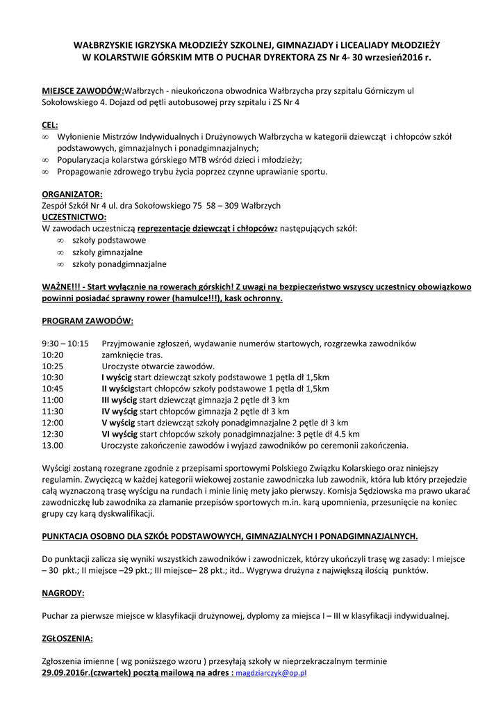 WAŁBRZYSKIE IGRZYSKA MŁODZIEŻY SZKOLNEJ, GIMNAZJADY i LICEALIADY MŁODZIEŻY W KOLARSTWIE GÓRSKIM MTB O PUCHAR DYREKTORA ZS Nr 4- 30 wrzesień2016 r. MIEJSCE ZAWODÓW:Wałbrzych - nieukończona obwodnica Wałbrzycha przy szpitalu Górniczym ul Sokołowskiego 4. Dojazd od pętli autobusowej przy szpitalu i ZS Nr 4 CEL: • Wyłonienie Mistrzów Indywidualnych i Drużynowych Wałbrzycha w kategorii dziewcząt i chłopców szkół podstawowych, gimnazjalnych i ponadgimnazjalnych; • Popularyzacja kolarstwa górskiego MTB wśród dzieci i młodzieży; • Propagowanie zdrowego trybu życia poprzez czynne uprawianie sportu. ORGANIZATOR: Zespół Szkół Nr 4 ul. dra Sokołowskiego 75 58 – 309 Wałbrzych UCZESTNICTWO: W zawodach uczestniczą reprezentacje dziewcząt i chłopcówz następujących szkół: • szkoły podstawowe • szkoły gimnazjalne • szkoły ponadgimnazjalne WAŻNE!!! - Start wyłącznie na rowerach górskich! Z uwagi na bezpieczeństwo wszyscy uczestnicy obowiązkowo powinni posiadać sprawny rower (hamulce!!!), kask ochronny. PROGRAM ZAWODÓW: 9:30 – 10:15 10:20 10:25 10:30 10:45 11:00 11:30 12:00 12:30 13.00 Przyjmowanie zgłoszeń, wydawanie numerów startowych, rozgrzewka zawodników zamknięcie tras. Uroczyste otwarcie zawodów. I wyścig start dziewcząt szkoły podstawowe 1 pętla dł 1,5km II wyścigstart chłopców szkoły podstawowe 1 pętla dł 1,5km III wyścig start dziewcząt gimnazja 2 pętle dł 3 km IV wyścig start chłopców gimnazja 2 pętle dł 3 km V wyścig start dziewcząt szkoły ponadgimnazjalne 2 pętle dł 3 km VI wyścig start chłopców szkoły ponadgimnazjalne: 3 pętle dł 4.5 km Uroczyste zakończenie zawodów i wyjazd zawodników po ceremonii zakończenia. Wyścigi zostaną rozegrane zgodnie z przepisami sportowymi Polskiego Związku Kolarskiego oraz niniejszy regulamin. Zwycięzcą w każdej kategorii wiekowej zostanie zawodniczka lub zawodnik, która lub który przejedzie całą wyznaczoną trasę wyścigu na rundach i minie linię mety jako pierwszy. Komisja Sędziowska ma prawo ukarać zawodniczkę lub zawodnika za złamanie przepisów sportowych m.in. karą upomnienia, przesunięcie na koniec grupy czy karą dyskwalifikacji. PUNKTACJA OSOBNO DLA SZKÓŁ PODSTAWOWYCH, GIMNAZJALNYCH I PONADGIMNAZJALNYCH. Do punktacji zalicza się wyniki wszystkich zawodników i zawodniczek, którzy ukończyli trasę wg zasady: I miejsce – 30 pkt.; II miejsce –29 pkt.; III miejsce– 28 pkt.; itd.. Wygrywa drużyna z największą ilością punktów. NAGRODY: Puchar za pierwsze miejsce w klasyfikacji drużynowej, dyplomy za miejsca I – III w klasyfikacji indywidualnej. ZGŁOSZENIA: Zgłoszenia imienne ( wg poniższego wzoru ) przesyłają szkoły w nieprzekraczalnym terminie 29.09.2016r.(czwartek) pocztą mailową na adres : [email protected] Lp Imię, nazwisko zawodnika Nazwa szkoły. Rocznik Imię, nazwisko opiekuna 1. + ilość opiekunów i osób towarzyszących POSTANOWIENIA KOŃCOWE: • za bezpieczeństwo uczestników podczas zawodów odpowiadają opiekunowie ekip; • zawody odbędą się bez względu na pogodę; • za zaginione rzeczy i sprzęt pozostawiony bez opieki podczas trwania zawodów oraz inne, niezawinione przez organizatora zdarzenia organizator nie ponosi odpowiedzialności; • organizator zastrzega sobie prawo do ewentualnych zmian w programie wyścigu • organizator zapewnia opiekę medyczną: pielęgniarka • zawodnik ma obowiązek zapoznać się z trasą przed rozpoczęciem zawodów; • zabrania się rozgrzewania w czasie trwania wyścigu innych kategorii; • wszyscy uczestnicy zobowiązani są do przestrzegania zaleceń służb porządkowych;