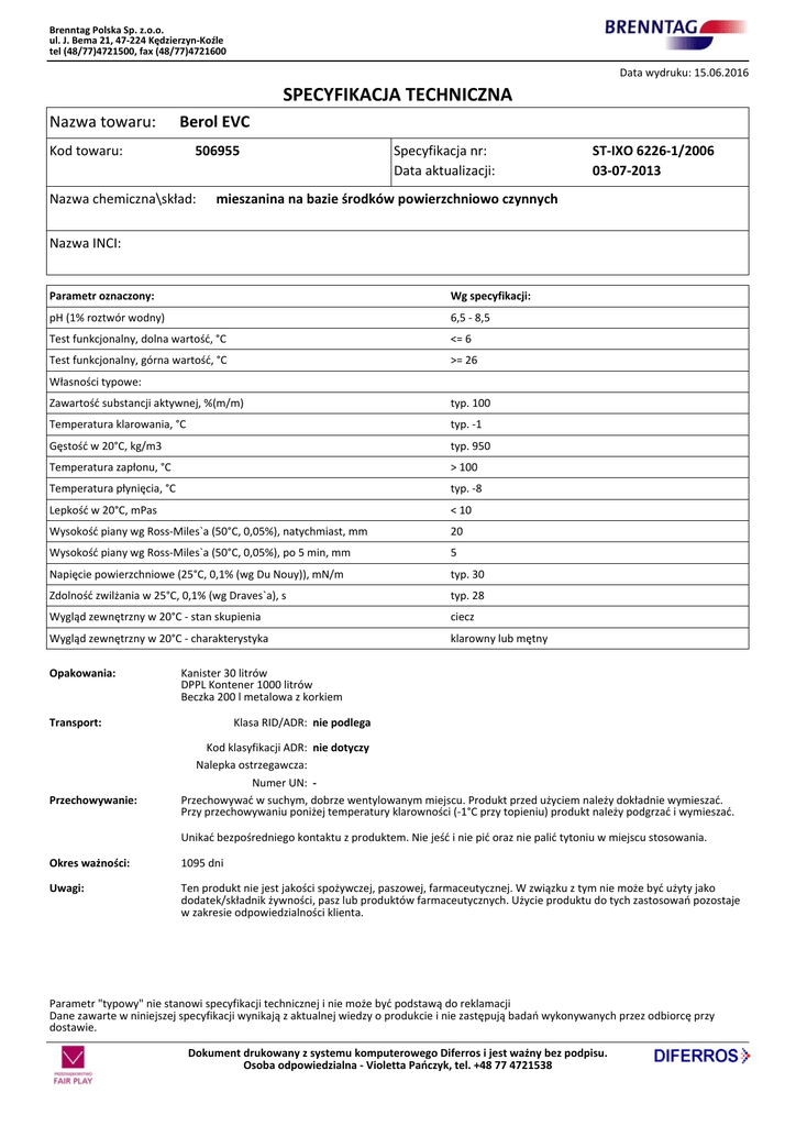 Brenntag Polska Sp. z.o.o. ul. J. Bema 21, 47-224 Kędzierzyn-Koźle tel (48/77)4721500, fax (48/77)4721600 Data wydruku: 15.06.2016 SPECYFIKACJA TECHNICZNA Nazwa towaru: Berol EVC Kod towaru: 506955 Nazwa chemiczna\skład: Specyfikacja nr: Data aktualizacji: ST-IXO 6226-1/2006 03-07-2013 mieszanina na bazie środków powierzchniowo czynnych Nazwa INCI: Parametr oznaczony: Wg specyfikacji: pH (1% roztwór wodny) 6,5 - 8,5 Test funkcjonalny, dolna wartość, °C <= 6 Test funkcjonalny, górna wartość, °C >= 26 Własności typowe: Zawartość substancji aktywnej, %(m/m) typ. 100 Temperatura klarowania, °C typ. -1 Gęstość w 20°C, kg/m3 typ. 950 Temperatura zapłonu, °C > 100 Temperatura płynięcia, °C typ. -8 Lepkość w 20°C, mPas < 10 Wysokość piany wg Ross-Miles`a (50°C, 0,05%), natychmiast, mm 20 Wysokość piany wg Ross-Miles`a (50°C, 0,05%), po 5 min, mm 5 Napięcie powierzchniowe (25°C, 0,1% (wg Du Nouy)), mN/m typ. 30 Zdolność zwilżania w 25°C, 0,1% (wg Draves`a), s typ. 28 Wygląd zewnętrzny w 20°C - stan skupienia ciecz Wygląd zewnętrzny w 20°C - charakterystyka klarowny lub mętny Opakowania: Kanister 30 litrów DPPL Kontener 1000 litrów Beczka 200 l metalowa z korkiem Transport: Przechowywanie: Klasa RID/ADR: nie podlega Kod klasyfikacji ADR: nie dotyczy Nalepka ostrzegawcza: Numer UN: Przechowywać w suchym, dobrze wentylowanym miejscu. Produkt przed użyciem należy dokładnie wymieszać. Przy przechowywaniu poniżej temperatury klarowności (-1°C przy topieniu) produkt należy podgrzać i wymieszać. Unikać bezpośredniego kontaktu z produktem. Nie jeść i nie pić oraz nie palić tytoniu w miejscu stosowania. Okres ważności: 1095 dni Uwagi: Ten produkt nie jest jakości spożywczej, paszowej, farmaceutycznej. W związku z tym nie może być użyty jako dodatek/składnik żywności, pasz lub produktów farmaceutycznych. Użycie produktu do tych zastosowań pozostaje w zakresie odpowiedzialności klienta. Parametr "typowy" nie stanowi specyfikacji technicznej i nie może być podstawą do reklamacji Dane zawarte w niniejszej specyfikacji wynikają z aktualnej wiedzy o produkcie i nie zastępują badań wykonywanych przez odbiorcę przy dostawie. Dokument drukowany z systemu komputerowego Diferros i jest ważny bez podpisu. Osoba odpowiedzialna - Violetta Pańczyk, tel. +48 77 4721538