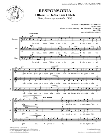 numer katalogowy: 295a-1/XX/A/0505/SAB RESPONSORIA Ołtarz I - Dałeś nam Chleb (data pierwszego wydania: 1930) muzyka: ks. Eugeniusz GRUBERSKI (1870 - 1923) adaptacja tekstu polskiego: ks. Hieronim CHAMSKI (ur. 1932) słowa: Mt 26,17-19, 26-29 bb b cF œ œ œ œ & b Moderato Sopran bb b b cF œ œ œ œ & Da - łeś Alt nam F ? bb b c œ œ œ œ b Da - łeś Bas nam Da - łeś S bbb 5 œ b & nam œ œ J œ J bb &bb œ j œ j œ œ œ ? bb b œ b œ J œ J œ œ gdy wśród pus - tyn - nych S b & b bb ˙ gło A - b & b bb œ œ ˙ gło B ˙ ? bb b ˙ b gło - ˙ - 10 U w Chleb z nie - ba, œ œ œ ˙ Chleb œ z nie - ba, Chleb z nie - ba, œ œ ˙ ˙ ˙ pia - sków Più mosso ∑ du. ∑ w U w fœ œ Jœ œ œ J du. A du. 2009 © Federacja Caecilianum Zarząd Główny: ul. Dewajtis 3 , 01-815 Warszawa tel./fax: (22) 561 01 38 , http://www.caecilianum.eu mailto: [email protected] po - si - lo - E - lia - szo - œ œœ jak œ œ œ œ ˙ E - lia - szo - jak E - lia - szo - | œ œ œ œj œ J ˙ wi, i rit. œ œ | i œ nœ œ | œ rit. i f œ œœœ œ JJ po-si - lo - ny f jj œ œœœ œ ze - sła-nym Chle - ˙ A po-si - lo - ny œ Jœ Jœ œ Œ ze - sła-nym Chle œ œ œ J J - œ œœ ze - sła-nym Chle - ny | rit. œ œ œ |œ cze - kał śmier - ci z pra - gnie - nia Ó | wi, ˙ cze - kał śmier - ci z pra - gnie - nia | | wi, œ œ ˙ j j œ œ œ œ œ ˙ | A U jak | œ œ ˙ œ œ cze - kał śmier - ci z pra - gnie - nia pia - sków ˙ ˙ | œ œ œ Jœ œJ | pia - sków ˙ œ gdy wśród pus - tyn - nych B œ œ ˙ œ nœ ˙ gdy wśród pus - tyn - nych A œ œ Jœ Jœ ˙ Do uŜytku publicznego. http://www.biblioteka.caecilianum.eu Dałeś nam Chleb - ks. Eugeniusz GRUBERSKI S b œ & b bb | œ œ œ 15 ˙ ˙ bem, po - wsze - dnim Chle - bem A bb &bb œ | œ œ ˙ œ ˙ B | œ bœ œ ˙ rit. ˙ 20 S p Kto A bb b b p˙ po p ? bb b ˙ b po & wstą - pił na S & - bb & b b œ. po - B œ J si - żył j œ. œ œ œ | la la żył œ J b œ & b bb œ J wie żył œ J na wie ˙ 30 - b & b b b œ Jœ œ J ˙ ? b b b œ Jœ b œ J œ œ œ A - niel - skim Chle œ - - rę. œ œ œ œ ˙ | | | na bę - dzie żył wie - na na œ nœ ˙ | ˙ | ki, ˙ wie - ki, po - si - lo - ny ∑ ˙ œf œ œ œ œ J J A po - si - lo - ny ki. A ny œ œ po - si - lo œ œ œ œ œ bœ œ bem, Twym świę - tym -2- ˙ œ - ˙ Chle - bem, ˙ ˙ Chle - bem, ˙ ˙ Chle - bem, | ki, wie - œ œ œ œ bę - dzie żył ˙ A bem, Twym świę - tym œ - U w ˙ f œ bem, Twym świę - tym œ Gó ˙ ∑ ki. - w rę. ki. - Gó U - Più mosso œ œ ˙ na ˙ ˙ n˙ rę. f œ œ nœ ˙ œ œ œ ˙ cresc. ˙ p ww - œ œ œ œ tym Chle - bem, - ˙ bę - dzie żył tym Chle - bem, się wie | tym Chle - bem, się œ j œ œ œ A - niel - skim Chle B œ | na A - niel - skim Chle A œ œ . n œj œ cresc. bę - dzie S - ˙ p U ˙ ˙ Gó Świę - tą się œ œ cresc. bę - dzie ? bb b œ . b si wstą - pił na la ˙. bę - dzie A - œ œ œ ˙ Świę - tą œ . œj œ ˙. ˙ Kto bb b b 25œ . si ˙ Kto B - œ œ ˙ p Świę - tą œ ˙. ˙ ˙ rit. bem, po - wsze - dnim Chle - bem bb &bb ˙ ˙ œ œ wstą - pił na bem, po - wsze - dnim Chle - bem ? bb b œ b ˙ rit. œ œ œ œ J J j œj œ œ œ Œ rit. Ó ˙ œ œ doj - dzie do rit. ˙ œ œ doj - dzie do rit. ˙ œ œ doj - dzie do http://www.biblioteka.caecilianum.eu Dałeś nam Chleb - ks. Eugeniusz GRUBERSKI S A b ˙ & b bb & bbbb p ˙ ˙ do - mu ˙ Oj - B ˙ p ˙ do - mu S A bb &bb œ i B S Oj - - ca. Chwa - ła Oj - cu - ca. Chwa - ła Oj - cu œ œ ˙ - ˙ - i Du - cho - wi Świę - te - ˙ œ J œ - œ J ˙ ? b b b œ œJ b œ J œ œ œ œ b ˙ ˙ & b bb b & b bb ˙ ˙ ? bb b ˙ ˙ b do - mu - - U Oj - ca. ˙ ˙ w Oj ˙ mu. | œ A œ œ | œ œ œ | œ bœ œ po - si - lo ˙ - - œ œ ˙ no no - - | wi, | wi, f œ œ œ œ œ J J - ˙ A po - si - lo - ny A po - si - lo - ny f j j œ œ œ œ œ œ Œ ˙ ˙ Chle - bem, Ó ny | ˙ 45 rit. œ œ doj - dzie do | Chle - bem, ˙ wi, œ œ ˙ Chle - bem, ˙ - ˙ rit. œ œ doj - dzie do | ˙ rit. œ œ doj - dzie do U ca. ˙ ˙ w - Sy no | w - Oj œ fœ œ œ œ œ J J bem, Twym świę - tym ˙ ˙ Sy ∑ mu. - œ ∑ bem, Twym świę - tym œ Sy Più mosso 40 bem, Twym świę - tym b & b b b œ œJ i œ œ ˙ œ mu. œ œ J J ? bb b œ b Du - cho - wi Świę - te b œ & b bb œ J i fœ œ œ J J J Jœ œ U w œ œ i fj j j œ œ œ œj œ j j œ œ œ œ ˙ do - mu B Chwa - ła Oj - cu œ œ œ do - mu A - Du - cho - wi Świę - te A - niel - skim Chle S ww w œ œ J J A - niel - skim Chle B U U - A - niel - skim Chle A fj j j œ œ œ œj œ Lento - ca. ˙ œ J œ i n˙ Oj - ˙ b œ. & b bb - p ˙ do - mu ? bb ˙ bb ˙ 35 U ca. -3- http://www.biblioteka.caecilianum.eu
