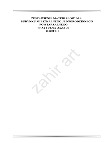 za hi ra rt ZESTAWIENIE MATERIAŁÓW DLA BUDYNKU MIESZKALNEGO JEDNORODZINNEGO POWTARZALNEGO PRZYTULNA OAZA 76 model 076 UWAGI: I. Podstawę opracowania stanowi projekt architektoniczny i konstrukcyjny II. Obliczenia materiałów przeprowadzono bez uwzględniania zapasów III. W obliczeniach nie uwzględniono: • • • hi ra rt Każda zmiana rodzaju materiału, a także jego ilości wymaga skorygowania wyliczeń. za IV. materiałów do izolacji przeciwwilgociowej pionowej na fundamentach stali zbrojeniowej wykończeniowych np.: tynki. parkiety Obliczenia ilości materiałów dla budynku mieszkalnego jednorodzinnego powtarzalnego PRZYTULNA OAZA 76 1. Fundamenty • • Chudy beton – 2,60 m3 Ławy fundamentowe beton B-15 – 10,50 m3 2. Ściany fundamentowe. • Ściany fundamentowe beton B-15 – 15,30 m3 Podsypka piaskowa – 8,00 m3 Chudy beton – 8,00 m3 Izolacja przeciwwilgociowa – 2 x folia PCV – 183,20 m2 Styropian – 6,40 m3 Izolacja przeciwwilgociowa – folia PCV – 80,00 m2 Wylewka cementowa – 3,20 m3 4. Ściany. Ściany zewnętrzne pustak POROTHERM gr. 30 cm – 2677 szt. Ściany wewnętrzne pustak POROTHERM gr. 25 cm – 855 szt. Ściany działowe pustak POROTHERM gr. 12 cm – 412 szt. Styropian – 25,10 m3 Zaprawa – 3,70 m3 za • • • • • hi ra • • • • • • rt 3. Posadzka na gruncie. 5. Wieńce i podciągi. • • Wieńce beton B-20 – 3,20 m3 Podciąg beton B-20 – 0,50 m3 6. Strop nad parterem. • • • • • Wylewka cementowa – 3,05 m3 Izolacja przeciwwilgociowa – folia PCV – 75,40 m2 Styropian – 3,05 m3 Izolacja przeciwwilgociowa – folia PCV – 75,40 m2 Beton B-20 – 11,35 m3 7. Strop nad poddaszem. • • • • Folia paroprzepuszczalna PCV – 102,90 m2 Wełna mineralna – 25,75 m3 Folia paroizolacyjna PCV – 102,90 m2 Strop żelbetowy – 12,40 m3 8. Dach - wyliczenia szacunkowe. • • • • • • • Dachówka ceramiczna – 177,6 m2 Łaty 4 x 4 cm – 0,90 m3 Kontr łaty 2 x 4 cm – 0,18 m3 Folia paroprzepuszczalna wiatroizolacyjna PCV – 177,6 m2 Krokwie – 2,27 m3 Jętki – 0,70 m3 Murłaty – 070 m3 9. Kominy. hi ra rt Kształtki ceramiczne na przewody wentylacyjne – 198,0 szt. Kształtki ceramiczne na przewody dymowe – 33,0 szt. Kształtki ceramiczne na przewody spalinowe – 33,0 szt. Cegła pełna – 7,3 m3 za • • • • koniec obliczeń.