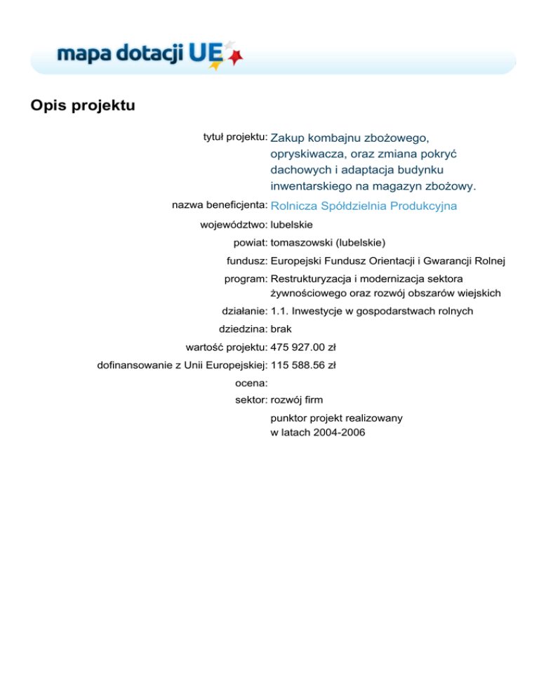 Opis projektu tytuł projektu: Zakup kombajnu zbożowego, opryskiwacza, oraz zmiana pokryć dachowych i adaptacja budynku inwentarskiego na magazyn zbożowy. nazwa beneficjenta: Rolnicza Spółdzielnia Produkcyjna województwo: lubelskie powiat: tomaszowski (lubelskie) fundusz: Europejski Fundusz Orientacji i Gwarancji Rolnej program: Restrukturyzacja i modernizacja sektora żywnościowego oraz rozwój obszarów wiejskich działanie: 1.1. Inwestycje w gospodarstwach rolnych dziedzina: brak wartość projektu: 475 927.00 zł dofinansowanie z Unii Europejskiej: 115 588.56 zł ocena: sektor: rozwój firm punktor projekt realizowany w latach 2004-2006