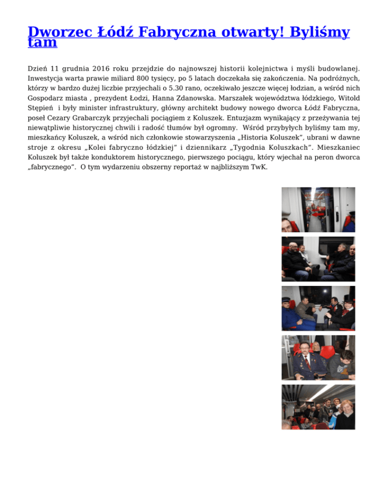 Dworzec Łódź Fabryczna otwarty! Byliśmy tam Dzień 11 grudnia 2016 roku przejdzie do najnowszej historii kolejnictwa i myśli budowlanej. Inwestycja warta prawie miliard 800 tysięcy, po 5 latach doczekała się zakończenia. Na podróżnych, którzy w bardzo dużej liczbie przyjechali o 5.30 rano, oczekiwało jeszcze więcej łodzian, a wśród nich Gospodarz miasta , prezydent Łodzi, Hanna Zdanowska. Marszałek województwa łódzkiego, Witold Stępień i były minister infrastruktury, główny architekt budowy nowego dworca Łódź Fabryczna, poseł Cezary Grabarczyk przyjechali pociągiem z Koluszek. Entuzjazm wynikający z przeżywania tej niewątpliwie historycznej chwili i radość tłumów był ogromny. Wśród przybyłych byliśmy tam my, mieszkańcy Koluszek, a wśród nich członkowie stowarzyszenia „Historia Koluszek”, ubrani w dawne stroje z okresu „Kolei fabryczno łódzkiej” i dziennikarz „Tygodnia Koluszkach”. Mieszkaniec Koluszek był także konduktorem historycznego, pierwszego pociągu, który wjechał na peron dworca „fabrycznego”. O tym wydarzeniu obszerny reportaż w najbliższym TwK.