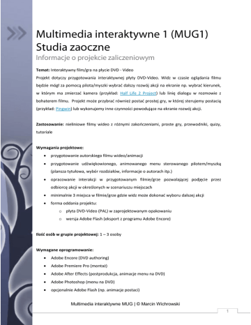 Temat: Interaktywny film/gra na płycie DVD - Video Projekt dotyczy przygotowania interaktywnej płyty DVD-Video. Widz w czasie oglądania filmu będzie mógł za pomocą pilota/myszki wybrad dalszy rozwój akcji na ekranie np. wybrad kierunek, w którym ma zmierzad kamera (przykład: Half Life 2 Project) lub linię dialogu w rozmowie z bohaterem filmu. Projekt może przybrad również postad prostej gry, w której sterujemy postacią (przykład: Pingwin) lub wykonujemy inne czynności powodujące na ekranie rozwój akcji. Zastosowanie: nieliniowe filmy wideo z różnymi zakooczeniami, proste gry, przewodniki, quizy, tutoriale Wymagania projektowe: przygotowanie autorskiego filmu wideo/animacji przygotowanie udźwiękowionego, animowanego menu sterowanego pilotem/myszką (plansza tytułowa, wybór rozdziałów, informacje o autorach itp.) opracowanie interakcji w przygotowanym filmie/grze pozwalającej podjęcie przez odbiorcę akcji w określonych w scenariuszu miejscach minimalnie 3 miejsca w filmie/grze gdzie widz może dokonad wyboru dalszej akcji forma oddania projektu: o płyta DVD-Video (PAL) w zaprojektowanym opakowaniu o wersja Adobe Flash (eksport z programu Adobe Encore) Ilość osób w grupie projektowej: 1 – 3 osoby Wymagane oprogramowanie: Adobe Encore (DVD authoring) Adobe Premiere Pro (montaż) Adobe After Effects (postprodukcja, animacje menu na DVD) Adobe Photoshop (menu na DVD) opcjonalnie Adobe Flash (np. animacje postaci) Multimedia interaktywne MUG | © Marcin Wichrowski 1 Polecane źródła wiedzy: http://www.adobe.com/designcenter/video_workshop/ http://www.videocopilot.net/basic/ http://www.videocopilot.net/tutorials/ http://www.smashingmagazine.com/category/tutorials/ Multimedia interaktywne MUG | © Marcin Wichrowski 2
