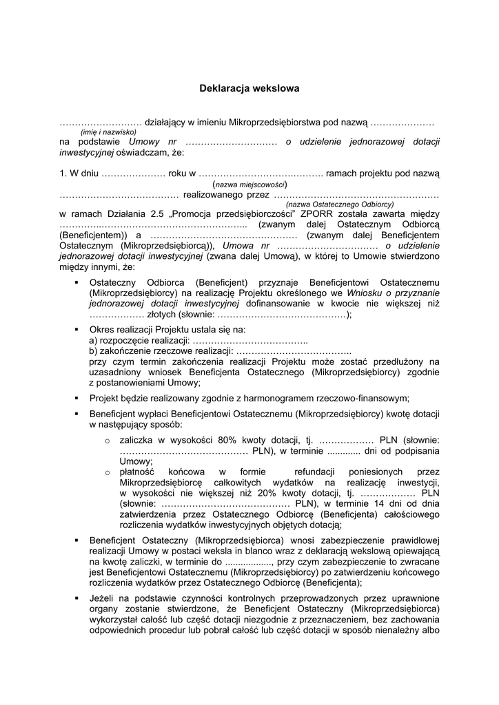 Deklaracja wekslowa ……………………… działający w imieniu Mikroprzedsiębiorstwa pod nazwą ………………… (imię i nazwisko) na podstawie Umowy nr ………………………… o udzielenie jednorazowej dotacji inwestycyjnej oświadczam, że: 1. W dniu ………………… roku w ………………………….………. ramach projektu pod nazwą (nazwa miejscowości) ………………………………… realizowanego przez ……………………………………………… (nazwa Ostatecznego Odbiorcy) w ramach Działania 2.5 „Promocja przedsiębiorczości” ZPORR została zawarta między …………..………………………………………... (zwanym dalej Ostatecznym Odbiorcą (Beneficjentem)) a ………………………………………… (zwanym dalej Beneficjentem Ostatecznym (Mikroprzedsiębiorcą)), Umowa nr …………………………… o udzielenie jednorazowej dotacji inwestycyjnej (zwana dalej Umową), w której to Umowie stwierdzono między innymi, że: Ostateczny Odbiorca (Beneficjent) przyznaje Beneficjentowi Ostatecznemu (Mikroprzedsiębiorcy) na realizację Projektu określonego we Wniosku o przyznanie jednorazowej dotacji inwestycyjnej dofinansowanie w kwocie nie większej niż ……………… złotych (słownie: ……………………………………); Okres realizacji Projektu ustala się na: a) rozpoczęcie realizacji: ……………………………….. b) zakończenie rzeczowe realizacji: ……………………………….. przy czym termin zakończenia realizacji Projektu może zostać przedłużony na uzasadniony wniosek Beneficjenta Ostatecznego (Mikroprzedsiębiorcy) zgodnie z postanowieniami Umowy; Projekt będzie realizowany zgodnie z harmonogramem rzeczowo-finansowym; Beneficjent wypłaci Beneficjentowi Ostatecznemu (Mikroprzedsiębiorcy) kwotę dotacji w następujący sposób: o o zaliczka w wysokości 80% kwoty dotacji, tj. ……………… PLN (słownie: …………………………………… PLN), w terminie ............. dni od podpisania Umowy; płatność końcowa w formie refundacji poniesionych przez Mikroprzedsiębiorcę całkowitych wydatków na realizację inwestycji, w wysokości nie większej niż 20% kwoty dotacji, tj. ……………… PLN (słownie: …………………………………… PLN), w terminie 14 dni od dnia zatwierdzenia przez Ostatecznego Odbiorcę (Beneficjenta) całościowego rozliczenia wydatków inwestycyjnych objętych dotacją; Beneficjent Ostateczny (Mikroprzedsiębiorca) wnosi zabezpieczenie prawidłowej realizacji Umowy w postaci weksla in blanco wraz z deklaracją wekslową opiewającą na kwotę zaliczki, w terminie do .................., przy czym zabezpieczenie to zwracane jest Beneficjentowi Ostatecznemu (Mikroprzedsiębiorcy) po zatwierdzeniu końcowego rozliczenia wydatków przez Ostatecznego Odbiorcę (Beneficjenta); Jeżeli na podstawie czynności kontrolnych przeprowadzonych przez uprawnione organy zostanie stwierdzone, że Beneficjent Ostateczny (Mikroprzedsiębiorca) wykorzystał całość lub część dotacji niezgodnie z przeznaczeniem, bez zachowania odpowiednich procedur lub pobrał całość lub część dotacji w sposób nienależny albo w nadmiernej wysokości, zobowiązany jest on do zwrotu tych środków odpowiednio w całości lub w części wraz z odsetkami w wysokości określonej jak dla zaległości podatkowych, w terminie i na rachunek wskazany przez Ostatecznego Odbiorcę (Beneficjenta) lub inny podmiot – organ uprawniony do kontroli w zakresie prawidłowości wydatkowania środków dotacji; W przypadku, gdy Beneficjent Ostateczny (Mikroprzedsiębiorca) nie dokona w wyznaczonym terminie zwrotu dofinansowania, o którym mowa w § 4 ust. 7 i 8; § 5 ust. 2 oraz § 7 ust. 3 Umowy, Ostateczny Odbiorca (Beneficjent) podejmie czynności zmierzające do odzyskania należnych środków, z wykorzystaniem dostępnych środków prawnych, w szczególności zabezpieczenia, o którym mowa w § 4 ust. 2 pkt 2 Umowy. Koszty czynności zmierzających do odzyskania nieprawidłowo wykorzystanej dotacji obciążają Beneficjenta Ostatecznego (Mikroprzedsiębiorcę). 2. Zgodnie z § 4 ust. 2 pkt 2 Umowy zabezpieczenie zwracane jest Beneficjentowi Ostatecznemu (Mikroprzedsiębiorcy) po zatwierdzeniu końcowego rozliczenia wydatków przez Ostatecznego Odbiorcę (Beneficjenta). 3. ……………………………………: (imię i nazwisko BO) - składa niniejszą deklarację wekslową na zabezpieczenie Umowy opisanej w pkt 1 do kwoty w wysokości ……………… złotych (słownie: …………………………………… złotych) na okres do czasu zatwierdzenia końcowego rozliczenia wydatków przez Ostatecznego Odbiorcę (Beneficjenta). - składa do dyspozycji Ostatecznego Odbiorcy (Beneficjenta) weksel in blanco. Ostateczny Odbiorca (Beneficjent) w przypadku, gdy Beneficjent Ostateczny (Mikroprzedsiębiorca) nie dokonał w wyznaczonym terminie zwrotu dotacji – stosownie do treści § 4 ust. 7 i 8; § 5 ust. 2 oraz § 7 ust. 3 Umowy, jest upoważniony do wypełnienia przedłożonego weksla in blanco na kwotę określoną w odpowiednim wezwaniu do zwrotu, nie większą jednak niż ……………… złotych (słownie: …………………………………… złotych), oraz opatrzenia weksla datą płatności według własnego uznania i przedłożenia go do zapłaty Beneficjentowi Ostatecznemu (Mikroprzedsiębiorcy) tj. …………………………….. w ten sposób, aby data płatności nie była krótsza aniżeli 21 dni od daty jego przedłożenia. Wystawca