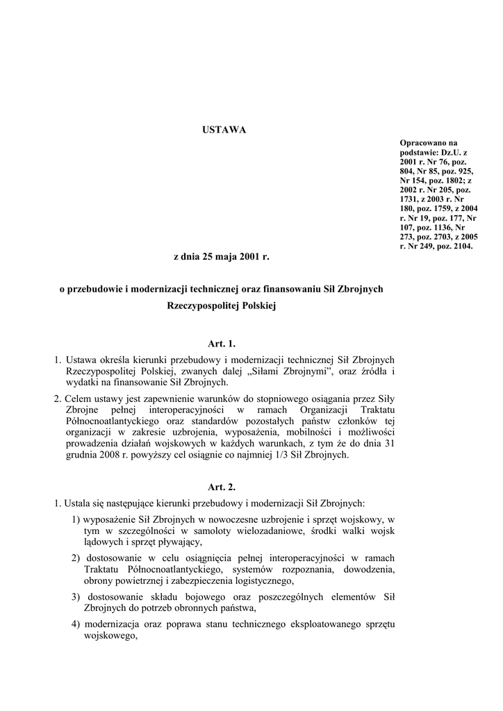 USTAWA z dnia 25 maja 2001 r. o przebudowie i modernizacji technicznej oraz finansowaniu Sił Zbrojnych Rzeczypospolitej Polskiej Art. 1. 1. Ustawa określa kierunki przebudowy i modernizacji technicznej Sił Zbrojnych Rzeczypospolitej Polskiej, zwanych dalej „Siłami Zbrojnymi”, oraz źródła i wydatki na finansowanie Sił Zbrojnych. 2. Celem ustawy jest zapewnienie warunków do stopniowego osiągania przez Siły Zbrojne pełnej interoperacyjności w ramach Organizacji Traktatu Północnoatlantyckiego oraz standardów pozostałych państw członków tej organizacji w zakresie uzbrojenia, wyposażenia, mobilności i możliwości prowadzenia działań wojskowych w każdych warunkach, z tym że do dnia 31 grudnia 2008 r. powyższy cel osiągnie co najmniej 1/3 Sił Zbrojnych. Art. 2. 1. Ustala się następujące kierunki przebudowy i modernizacji Sił Zbrojnych: 1) wyposażenie Sił Zbrojnych w nowoczesne uzbrojenie i sprzęt wojskowy, w tym w szczególności w samoloty wielozadaniowe, środki walki wojsk lądowych i sprzęt pływający, 2) dostosowanie w celu osiągnięcia pełnej interoperacyjności w ramach Traktatu Północnoatlantyckiego, systemów rozpoznania, dowodzenia, obrony powietrznej i zabezpieczenia logistycznego, 3) dostosowanie składu bojowego oraz poszczególnych elementów Sił Zbrojnych do potrzeb obronnych państwa, 4) modernizacja oraz poprawa stanu technicznego eksploatowanego sprzętu wojskowego, Opracowano na podstawie: Dz.U. z 2001 r. Nr 76, poz. 804, Nr 85, poz. 925, Nr 154, poz. 1802; z 2002 r. Nr 205, poz. 1731, z 2003 r. Nr 180, poz. 1759, z 2004 r. Nr 19, poz. 177, Nr 107, poz. 1136, Nr 273, poz. 2703, z 2005 r. Nr 249, poz. 2104. 5) modernizacja oraz poprawa stanu technicznego infrastruktury wojskowej, 6) zwiększenie możliwości manewrowych wojsk oraz możliwości ich przerzutu w oddalone rejony działań, 7) stopniowe odtwarzanie zapasów środków bojowych i materiałowych, 8) wycofanie przestarzałego i nieperspektywicznego sprzętu wojskowego, 9) przekazanie Agencji Mienia Wojskowego zbędnej dla Sił Zbrojnych infrastruktury wojskowej, 10) zmiana struktury etatowych stanowisk służbowych, w tym zmniejszenie liczby stanowisk przeznaczonych dla oficerów, 11) dostosowanie systemu szkolnictwa wojskowego do potrzeb Sił Zbrojnych. 2. Rada Ministrów uwzględniając potrzeby obronne Rzeczypospolitej Polskiej co 2 lata określa szczegółowe kierunki przebudowy i modernizacji Sił Zbrojnych na kolejny 6 letni okres planistyczny, stosownie do zasad planowania obronnego w Organizacji Traktatu Północnoatlantyckiego na podstawie: 1) głównych kierunków rozwoju Sił Zbrojnych oraz ich przygotowań do obrony państwa określanych przez Prezydenta Rzeczypospolitej Polskiej, 2) zobowiązań Rzeczypospolitej Polskiej przyjętych w ramach planowania obronnego w Organizacji Traktatu Północnoatlantyckiego. Art. 3. 1. Liczebność Sił Zbrojnych wynosi nie więcej niż sto pięćdziesiąt tysięcy stanowisk etatowych żołnierzy. 2. W ramach liczby stanowisk, o których mowa w ust. 1, nie mniej niż 1/2 stanowisk przeznacza się dla żołnierzy zawodowych, z czego nie więcej niż 1/3 dla oficerów. Art. 4. 1. Minister Obrony Narodowej wprowadzi program przebudowy i modernizacji technicznej Sił Zbrojnych w latach 2001-2006, zwany dalej „programem”, uwzględniający w szczególności zadania poszczególnych rodzajów Sił Zbrojnych. 2. Program określa w szczególności: 1) zadania dotyczące modernizacji wyposażenia Sił Zbrojnych przede wszystkim w zakresie: a) sprzętu rozpoznania i walki radioelektronicznej, b) sprzętu dowodzenia i łączności, c) sprzętu i wyposażenia systemu obrony powietrznej, d) zestawów przeciwpancernych pocisków kierowanych, e) kołowych transporterów opancerzonych, f) średnich samolotów transportowych, g) okrętów i sprzętu morskiego, h) sprzętu elektronicznego, w związku ze zwolnieniem częstotliwości na potrzeby operatorów telefonii ruchomej typu komórkowego trzeciej generacji, i) czołgów, 2) zamierzenia w zakresie: a) systemów obronnych Sił Zbrojnych, b) zobowiązań wynikających z umów międzynarodowych, c) gromadzenia i utrzymywania materiałowych dla Sił Zbrojnych, zapasów środków bojowych i d) szkolenia Sił Zbrojnych, e) dyslokacji jednostek wojskowych i infrastruktury wojskowej, f) polityki kadrowej, rekonwersyjnej, kształcenia kadr w systemie szkolnictwa wojskowego, 3) liczebność oraz skład bojowy poszczególnych elementów Sił Zbrojnych. 3. Minister Obrony Narodowej, w drodze zarządzenia, na podstawie kierunków przebudowy i modernizacji Sił Zbrojnych, o których mowa w art. 2, wprowadza na kolejny okres planistyczny program rozwoju Sił Zbrojnych, stosownie do zasad planowania obronnego w Organizacji Traktatu Północnoatlantyckiego. Art. 5. 1. Realizację programu powierza się Ministrowi Obrony Narodowej. W trakcie realizacji programu Minister Obrony Narodowej zasięga opinii odpowiednio ministra właściwego do spraw gospodarki oraz ministra właściwego do spraw nauki, w zakresie zadań, o których mowa w art. 4 ust. 2 pkt 1. 2. W celu realizacji programu: 1) mogą być zawierane umowy wieloletnie, do których nie stosuje się przepisu art. 36 ust. 1 ustawy z dnia 30 czerwca 2005 r. o finansach publicznych (Dz.U. Nr 249, poz. 2104) i art. 143 ustawy z dnia 29 stycznia 2004 r. Prawo zamówień publicznych (Dz.U. Nr 19, poz. 177, Nr 96, poz. 959 i Nr 116, poz. 1207), 2) nie stosuje się art. 21 ust. 3 ustawy o finansach publicznych, w zakresie konieczności uzgadniania z ministrem właściwym do spraw Skarbu Państwa decyzji o przeznaczeniu mienia likwidowanych jednostek budżetowych w przypadku, gdy mienie to jest przekazywane między jednostkami budżetowymi Ministerstwa Obrony Narodowej. 3. Minister Obrony Narodowej, po upływie każdego roku realizacji programu, przedstawia ministrowi właściwemu do spraw Skarbu Państwa informację z realizacji decyzji o przeznaczeniu mieni