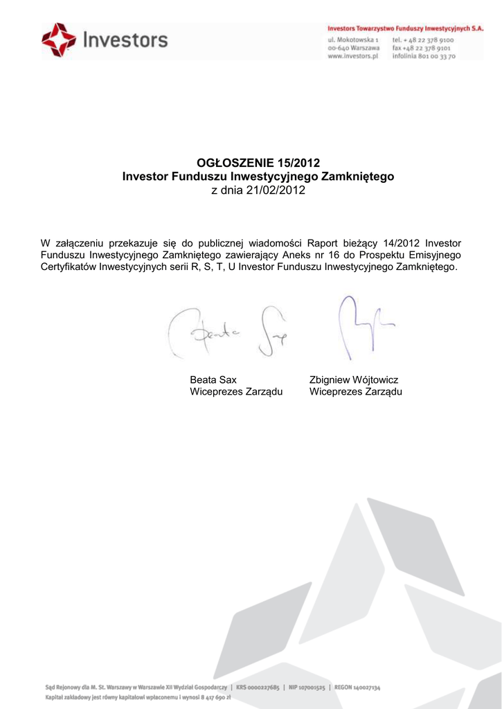 OGŁOSZENIE 15/2012 Investor Funduszu Inwestycyjnego Zamkniętego z dnia 21/02/2012 W załączeniu przekazuje się do publicznej wiadomości Raport bieżący 14/2012 Investor Funduszu Inwestycyjnego Zamkniętego zawierający Aneks nr 16 do Prospektu Emisyjnego Certyfikatów Inwestycyjnych serii R, S, T, U Investor Funduszu Inwestycyjnego Zamkniętego. Beata Sax Wiceprezes Zarządu Zbigniew Wójtowicz Wiceprezes Zarządu INVESTOR FIZ RB_FI_E 14 2012 korekta KOMISJANADZORUFINANSOWEGO Raport bieżący funduszu inwestycyjnego nr 14 / 2012 (numer kol ejny raportu / rok) Data przekazania: 2012-02-21 Nazwa podmiotu: INVESTOR FUNDUSZ INWESTYCYJNY ZAMKNIĘTY Temat raportu: Aneks do Prospektu emisyjnego c ertyfikatów inwestyc yjnych serii R, S, T, U Investor Funduszu Inwestycyjnego Zamkniętego Podstawa prawna § 42 ust. 1 pkt 37 oie - inne zdarzenia, przewi dzi ane statutem funduszu WIADOMOŚĆ W załączeniu przekazujemy Aneks nr 16 do Prospektu emisyjnego certyfikatów inwestycyjnych serii R, S, T, U Investor Funduszu Inwestycyjnego Zamkniętego zatwierdzony przez Komisję Nadzoru Finansowego w dniu 20 lutego 2012 r. Pli k Opi s Aneks16.pdf PODPISYOSÓBREPREZENTUJĄCYCHPODMIOT Data Imię i Nazwi sko Stanowisko/Funkcja 2012-02-21 Beata Sax Wiceprezes Zarządu 2012-02-21 Piotr Dzi adek Wiceprezes Zarządu Podpis Komisja Nadzoru Finansowego 1 Aneks nr 16 z dnia 16 lutego 2012 r. do Prospektu Emisyjnego Certyfikatów Inwestycyjnych serii R, S, T, U Investor Funduszu Inwestycyjnego Zamkniętego W Prospekcie emisyjnym Certyfikatów Inwestycyjnych serii R, S, T, U Investor Funduszu Inwestycyjnego Zamkniętego zatwierdzonym przez Komisję Nadzoru Finansowego w dniu 28 kwietnia 2011 r. wprowadza się następujące zmiany: 1) w związku z przekazaniem raportu kwartalnego Funduszu za 4 kwartał 2011 r., w rozdziale 4 w pkt 4.2.2 dodaje się akapity i tabele w brzmieniu: Na podstawie raportu kwartalnego Funduszu za okres od 1 października 2011 r. do 31 grudnia 2011 r. (dane nieaudytowane) Wybrane informacje finansowe Funduszu w tyś. zł, chyba że wskazano inaczej. Pozycja bilansu 2011/12/31 Aktywa 2010/12/31 233 997 Zobowiązania 435 063 8 632 16 018 Aktywa netto 225 365 419 045 Kapitał funduszu 254 922 348 652 47 875 67 948 Dochody zatrzymane Wzrost (spadek) wartości lokat w odniesieniu do ceny nabycia - 77 432 2 445 Kapitał funduszu i zakumulowany wynik z operacji 225 365 419 045 Liczba zarejestrowanych certyfikatów inwestycyjnych 124 075 165 605 1 816,36 2 530,39 Wartość aktywów netto na certyfikat inwestycyjny Źródło: raport kwartalny Funduszu (dane nieaudytowane) 2011/12/31 SKŁADNIKI LOKAT Wartość według ceny nabycia w tys. Wartość według wyceny na dzień bilansowy w tys. Procentowy Wartość udział w według ceny aktywach nabycia w ogółem tys. Wartość według wyceny na dzień bilansowy w tys. Procentowy udział w aktywach ogółem 110 147 47,07 236 083 225 299 2 495 -1,07 1 310 13 0,00 Certyfikaty inwestycyjne 78 097 51 886 22,17 77 715 92 241 21,20 Depozyty 55 512 55 512 23,72 50 102 50 102 11,52 293 062 215 050 Razem Źródło: raport kwartalny Funduszu (dane nieaudytowane) 91,89 365 210 367 655 84,51 Akcje Instrumenty pochodne 159 453 2010/12/31 nie dotyczy - 51,79 Rachunek wyniku z operacji od 2011/10/01 do 2011/12/31 Przychody z lokat Koszty funduszu Koszty funduszu netto od 2010/10/01 do 2010/12/31 262 61 3 629 3 806 3 629 - Zrealizowany i niezrealizowany zysk (strata) - 24 967 44 034 Wynik z operacji - 28 334 40 289 -228,36 243,28 Wynik z operacji przypadający na certyfikat inwestycyjny w PLN Źródło: raport kwartalny Funduszu (dane nieaudytowane) Rachunek przepływów pieniężnych Przepływy środków pieniężnych z działalności operacyjnej Przepływy środków pieniężnych z działalności finansowej Skutki zmian kursów wymiany środków pieniężnych i ekwiwalentów środków pieniężnych Zmiana stanu środków pieniężnych netto Środki pieniężne i ekwiwalenty środków pieniężnych na początek okresu sprawozdawczego Środki pieniężne i ekwiwalenty środków pieniężnych na koniec okresu sprawozdawczego Źródło: raport kwartalny Funduszu (dane nieaudytowane) 3 367 3 806 Przychody z lokat netto od 2011/10/01 do 2011/12/31 - 3 745 od 2010/10/01 do 2010/12/31 9 356 70 968 -33 329 -27 488 0 2 298 -23 972 43 480 98 245 70 492 74 272 113 971 2) w związku z przekazaniem raportu kwartalnego Funduszu za 4 kwartał 2011 r., w rozdziale 4 w pkt 4.2.3 dodaje się akapity i tabele w brzmieniu: Na podstawie raportu kwartalnego Funduszu za okres od 1 października 2011 r. do 31 grudnia 2011 r. (dane nieaudytowane) Na dzień 31 grudnia 2011 r. Aktywa Funduszu wynosiły 233.977 tys. zł, na co składały się akcje o wartości 110.147 tys. zł, certyfikaty inwestycyjne o wartości 51.886 tys. zł oraz środki pieniężne i ich ekwiwalenty o wartości 74.272 tys. zł. Akcje spółek stanowiły 47,07% Aktywów Funduszu, certyfikaty inwestycyjne 22,17%, należności 0,08%, a środki pieniężne i ich ekwiwalenty 31,74% Aktywów Funduszu. (obliczenia własne nieaudytowane). Z akcji 60.844 tys. zł ulokowanych było w akcjach spółek notowanych na GPW oraz w akcjach polskiej spółki notowanej na rynku NewConnect, 42.124 tys. zł w akcjach spółek notowanych w Indiach a 7.179 tys. zł w akcjach spółek notowanych w USA. Z certyfikatów 51.886 tys. zł ulokowanych było w certyfikatach funduszu Renaissance Russia Infrastructure Equities. (obliczenia własne nieaudytowane). Akcje spółek notowanych na GPW oraz NewConnect stanowiły 26,00% aktywów ogółem Funduszu, akcje spółek notowanych w Indiach 18,00% a akcje spółek notowanych w USA 3,07%. (obliczenia własne nieaudytowane) Jeżeli chodzi o branże to 36.617 tys. zł ulokowane było w akcjach spółek sektora przemysłowego, 2.564 tys. zł w akcjach spółek z sektora media, 41.629 tys. zł w akcjach spółek z sektora budowlanego, 5.598 tys. zł. w akcjach spółek z sektora usługi, 6.813 tys. zł w ak