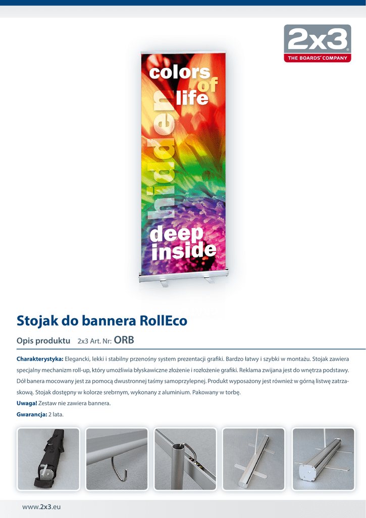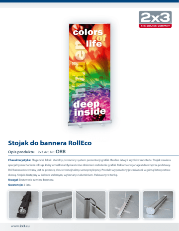 Stojak do bannera RollEco Opis produktu 2x3 Art. Nr: ORB Charakterystyka: Elegancki, lekki i stabilny przenośny system prezentacji grafiki. Bardzo łatwy i szybki w montażu. Stojak zawiera specjalny mechanizm roll-up, który umożliwia błyskawiczne złożenie i rozłożenie grafiki. Reklama zwijana jest do wnętrza podstawy. Dół banera mocowany jest za pomocą dwustronnej taśmy samoprzylepnej. Produkt wyposażony jest również w górną listwę zatrzaskową. Stojak dostępny w kolorze srebrnym, wykonany z aluminium. Pakowany w torbę. Uwaga! Zestaw nie zawiera bannera. Gwarancja: 2 lata. www.2x3.eu SPECYFIKACJA TECHNICZNA Stojak do bannera RollEco 2x3 Art.Nr ORB850 ORB1000 Rozmiar bannera [cm] 85×200 100×200 Zwijanie reklamy do wnętrza podstawy (mechanizm Roll-up) 209 Całkowita wysokość [cm] Wymiary kasety [cm] 86×9×9 101×9×9 Długość nóżek [cm] 39 Mocowanie nadruku dół bannera za pomoca taśmy dwustronnej, góra – listwa zatrzaskowa konstrukcja i nóżki aluminiowe Materiał srebrny Kolor Waga netto [kg] Torba 2,4 3,0 wymiary: 89×10×10 wymiary: 104×10×10 2 lata Poster Size 209 cm Gwarancja 39 cm 44 / 60 cm 86 / 101 cm 2x3 S.A. 73-231 Krzęcin, ul. Słoneczna 3, Polska [i]: 801 23 00 23 [t]: +48 95 765 3848 [f]: +48 95 765 3850 [e]: [email protected] [w]: www.2x3.eu innowacje w komunikacji wizualnej