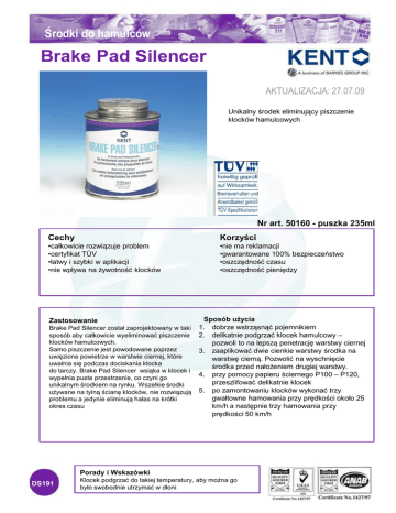 Środki do hamulców Brake Pad Silencer AKTUALIZACJA: 27.07.09 Unikalny środek eliminujący piszczenie klocków hamulcowych Nr art. 50160 - puszka 235ml Cechy Korzyści •całkowicie rozwiązuje problem •certyfikat TÜV •łatwy i szybki w aplikacji •nie wpływa na żywotność klocków •nie ma reklamacji •gwarantowane 100% bezpieczeństwo •oszczędność czasu •oszczędność pieniędzy Zastosowanie Brake Pad Silencer został zaprojektowany w taki sposób aby całkowicie wyeliminować piszczenie klocków hamulcowych. Samo piszczenie jest powodowane poprzez uwięzione powietrze w warstwie ciernej, które uwalnia się podczas dociskania klocka do tarczy. Brake Pad Silencer wsiąka w klocek i wypełnia puste przestrzenie, co czyni go unikalnym środkiem na rynku. Wszelkie środki używane na tylną ścianę klocków, nie rozwiązują problemu a jedynie eliminują hałas na krótki okres czasu Sposób użycia 1. dobrze wstrząsnąć pojemnikiem 2. delikatnie podgrzać klocek hamulcowy – pozwoli to na lepszą penetrację warstwy ciernej 3. zaaplikować dwie cienkie warstwy środka na warstwę cierną. Pozwolić na wyschnięcie środka przed nałożeniem drugiej warstwy. 4. przy pomocy papieru ściernego P100 – P120, przeszlifować delikatnie klocek 5. po zamontowaniu klocków wykonać trzy gwałtowne hamowania przy prędkości około 25 km/h a następnie trzy hamowania przy prędkości 50 km/h Porady i Wskazówki DS191 Klocek podgrzać do takiej temperatury, aby można go było swobodnie utrzymać w dłoni Środki do hamulców Brake Pad Silencer Dane Techniczne Nr art. : 50160 Chemical Bas: etenyl Nazwa : Brake Pad Silencer Lepkość : 15-50cps Okres ważności: 12 miesięcy Gęstość : 0.95g/ml VOC 672 g/l Jednostka sprzedaży: szt. Kod magazynowy: BT72 Kod taryfy celnej : 3403 99 90 Produkty Pokrewne Rynek Zbytu Anti Seize Grease, Ceramic 1200, Brake Parts Cleaner, Pro Brake, K44 Wtórny Podstawowy Bezpieczeństwo i Higiena SKRAJNIE ŁATWOPALNY DRAŻNIĄCY R36 R67 S7/9 S16 S24/25 S26 lekarza. Działa drażniąco na oczy. Pary mogą wywoływać uczucie senności i zawroty głowy. Przechowywać pojemnik szczelnie zamknięty w miejscu dobrze wentylowanym. Nie przechowywać w pobliżu źródeł zapłonu — nie palić tytoniu Unikać zanieczyszczenia skóry i oczu. Zanieczyszczone oczy przemyć natychmiast dużą ilością wody i zasięgnąć porady W celu zapewnienia Państwu odpowiednich środków bezpieczeństwa podczas używania naszych produktów, firma KENT prosi o dokładne zapoznanie się z informacjami na opakowaniu przed użyciem produktu. Zawarte tam wytyczne są przeznaczone dla Państwa Ochrony Osobistej. Firma KENT posiada szereg produktów do ochrony osobistej takich jak odzież, okulary, osłony twarzy i dróg oddechowych, które spełniają najnowsze dyrektywy Unii Europejskiej. Jeżeli macie Państwo jakiekolwiek pytania prosimy o kontakt telefoniczny lub e-mailowy. Warunki Żadna część tej publikacji nie może być powielana, przekazywana, przechowywana, kopiowana elektronicznie lub powielana w formie papierowej bez uprzedniej zgody firmy Barnes Group KENT Ltd. Karta produktu i informacje w niej zawarte są własnością firmy Barnes Group KENT Ltd. Nie udziela się licencji na korzystanie z niej w innych niż informacyjnych celach dotyczących produktu opisanego w tym dokumencie. Nie przyznaje się licencji na wszelkie prawa własności intelektualnej. Informacje mogą ulec zmianie bez powiadomienia i zastępują one wszelkie dotychczasowe wydane karty produktów. Dostarczona informacja jest uznana za dokładną lecz Barnes Sprzedaż i dystrybucja: Group KENT Ltd. nie ponosi odpowiedzialności za popełnione błędy. Użytkownicy tego arkusza danych powinni sami sprawdzić informację oraz stopień przydatności produktu do celu w jakim zamierzają go stosować a nie dokonywać żadnych założeń w oparciu o zamieszczone informacje. Odpowiedzialność za straty lub szkody będące wynikiem jakiegokolwiek oparcia się na informacjach zawartych w dokumencie lub użycie ich (w tym odpowiedzialności wynikającej z zaniedbania lub gdy Barnes Group KENT Ltd. była świadoma powstania takiej straty lub szkody) jest wykluczone. Nie będzie to zawężać lub ograniczać odpowiedzialności Grupy za śmierć lub uszkodzenie ciała wynikające z zaniedbania. KENT jest nazwą handlową Barnes Group KENT Ltd. Centrala: Barnes Group KENT Ltd. Registered in England. Pitreavie Crescent, Pitreavie Business Park, Dunfermline Fife KY11 8UQ. Registered in England Nº: 1164516 VAT Registration Nº: 887 1228 94 Wszelkie prawa zastrzeżone. Petro-Res Sp. z o.o. 35-082 Rzeszów, ul. Wetlinska 3a tel: 17 850 44 60-61, fax: 17 850 44 63 [email protected] www.petrores.pl DS191