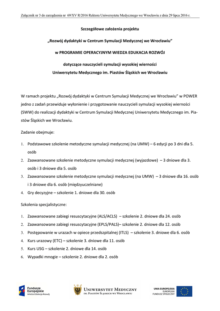 Załącznik nr 3 do zarządzenia nr 69/XV R/2016 Rektora Uniwersytetu Medycznego we Wrocławiu z dnia 29 lipca 2016 r. Szczegółowezałożeniaprojektu „RozwójdydaktykiwCentrumSymulacjiMedycznejweWrocławiu” wPROGRAMIEOPERACYJNYMWIEDZAEDUKACJAROZWÓJ dotyczącenauczycielisymulacjiwysokiejwierności UniwersytetuMedycznegoim.PiastówŚląskichweWrocławiu Wramachprojektu„RozwójdydaktykiwCentrumSymulacjiMedycznejweWrocławiu”wPOWER jednozzadańprzewidujewyłonienieiprzygotowanienauczycielisymulacjiwysokiejwierności (SWW)dorealizacjidydaktykiwCentrumSymulacjiMedycznejUniwersytetuMedycznegoim.PiastówŚląskichweWrocławiu. Zadanieobejmuje: 1. Podstawoweszkoleniemetodycznesymulacjimedycznej(naUMW)–6edycjipo3dnidla5. osób 2. Zaawansowaneszkoleniemetodycznesymulacjimedycznej(wyjazdowe)–3dniowedla3. osóbi3dniowedla5.osób 3. Zaawansowaneszkoleniemetodycznesymulacjimedycznej(naUMW)–3dniowedla16.osób i3dniowedla6.osób(międzyuczelniane) 4. Grydecyzyjne–szkolenie1.dniowedla30.osób Szkoleniaspecjalistyczne: 1. Zaawansowanezabiegiresuscytacyjne(ALS/ACLS)–szkolenie2.dniowedla24.osób 2. Zaawansowanezabiegiresuscytacyjne(EPLS/PALS)–szkolenie2.dniowedla12.osób 3. Postępowaniewurazachwopieceprzedszpitalnej(ITLS)–szkolenie3.dniowedla6.osób 4. Kursurazowy(ETC)–szkolenie3.dniowedla11.osób 5. KursUSG–szkolenie2.dniowedla14.osób 6. Wypadkimnogie–szkolenie2.dniowedla2.osób