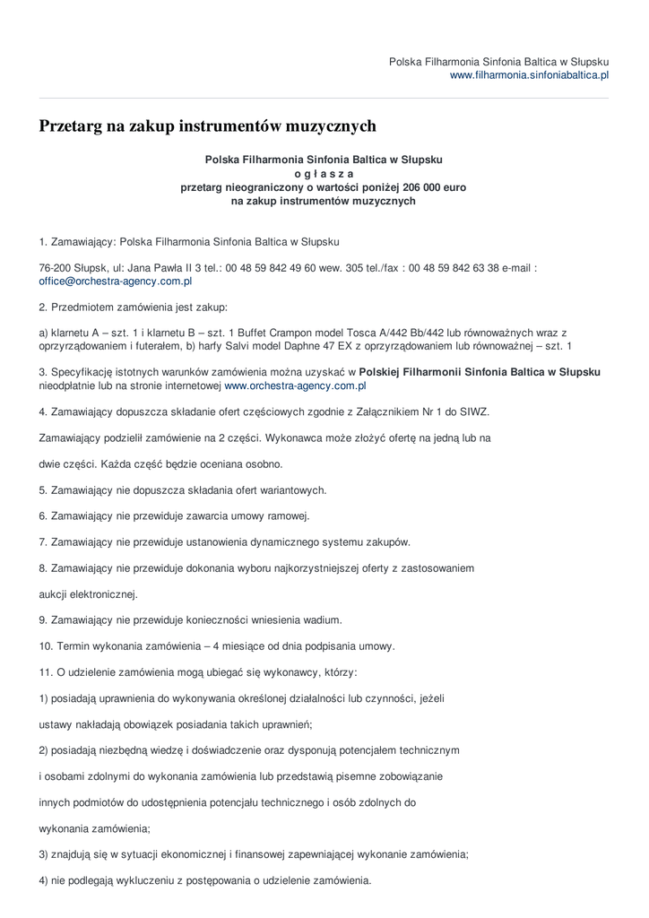 Polska Filharmonia Sinfonia Baltica w Słupsku www.filharmonia.sinfoniabaltica.pl Przetarg na zakup instrumentów muzycznych Polska Filharmonia Sinfonia Baltica w Słupsku ogłasza przetarg nieograniczony o wartości poniżej 206 000 euro na zakup instrumentów muzycznych 1. Zamawiający: Polska Filharmonia Sinfonia Baltica w Słupsku 76-200 Słupsk, ul: Jana Pawła II 3 tel.: 00 48 59 842 49 60 wew. 305 tel./fax : 00 48 59 842 63 38 e-mail : [email protected] 2. Przedmiotem zamówienia jest zakup: a) klarnetu A – szt. 1 i klarnetu B – szt. 1 Buffet Crampon model Tosca A/442 Bb/442 lub równoważnych wraz z oprzyrządowaniem i futerałem, b) harfy Salvi model Daphne 47 EX z oprzyrządowaniem lub równoważnej – szt. 1 3. Specyfikację istotnych warunków zamówienia można uzyskać w Polskiej Filharmonii Sinfonia Baltica w Słupsku nieodpłatnie lub na stronie internetowej www.orchestra-agency.com.pl 4. Zamawiający dopuszcza składanie ofert częściowych zgodnie z Załącznikiem Nr 1 do SIWZ. Zamawiający podzielił zamówienie na 2 części. Wykonawca może złożyć ofertę na jedną lub na dwie części. Każda część będzie oceniana osobno. 5. Zamawiający nie dopuszcza składania ofert wariantowych. 6. Zamawiający nie przewiduje zawarcia umowy ramowej. 7. Zamawiający nie przewiduje ustanowienia dynamicznego systemu zakupów. 8. Zamawiający nie przewiduje dokonania wyboru najkorzystniejszej oferty z zastosowaniem aukcji elektronicznej. 9. Zamawiający nie przewiduje konieczności wniesienia wadium. 10. Termin wykonania zamówienia – 4 miesiące od dnia podpisania umowy. 11. O udzielenie zamówienia mogą ubiegać się wykonawcy, którzy: 1) posiadają uprawnienia do wykonywania określonej działalności lub czynności, jeżeli ustawy nakładają obowiązek posiadania takich uprawnień; 2) posiadają niezbędną wiedzę i doświadczenie oraz dysponują potencjałem technicznym i osobami zdolnymi do wykonania zamówienia lub przedstawią pisemne zobowiązanie innych podmiotów do udostępnienia potencjału technicznego i osób zdolnych do wykonania zamówienia; 3) znajdują się w sytuacji ekonomicznej i finansowej zapewniającej wykonanie zamówienia; 4) nie podlegają wykluczeniu z postępowania o udzielenie zamówienia. 4) nie podlegają wykluczeniu z postępowania o udzielenie zamówienia. oraz załączą następujące dokumenty i oświadczenia potwierdzające spełnienie tych warunków: a) oświadczenie z art. 22 ust. 1 ustawy Pzp zgodnie z Zał. Nr 3 do SIWZ, b) aktualny odpis z właściwego rejestru albo aktualne zaświadczenie o wpisie do ewidencji działalności gospodarczej, jeżeli odrębne przepisy wymagają wpisu do rejestru lub zgłoszenia do ewidencji działalności gospodarczej, wystawiony nie wcześniej niż 6 miesięcy przed upływem terminu składania wniosku o dopuszczenie do udziału w postępowaniu o udzielenie zamówienia, Uwaga: Jeżeli Wykonawca prowadzi działalność gospodarczą w formie spółki cywilnej do oferty należy dołączyć umowę spółki cywilnej, c) aktualne zaświadczenia właściwego naczelnika urzędu skarbowego oraz właściwego oddziału Zakładu Ubezpieczeń Społecznych lub Kasy Rolniczego Ubezpieczenia Społecznego potwierdzających odpowiednio, że wykonawca nie zalega z opłacaniem podatków, opłat oraz składek na ubezpieczenie zdrowotne i społeczne lub zaświadczenie bądź zaświadczenia, że uzyskał przewidziane prawem zwolnienie, odroczenie lub rozłożenie na raty zaległych płatności lub wstrzymanie w całości wykonania decyzji właściwego organu - wystawione nie wcześniej niż 3 miesiące przed upływem terminu składania wniosków o dopuszczenie do udziału w postępowaniu, d) aktualną informację z Krajowego Rejestru Karnego (KRK) w zakresie określonym w art. 24 ust. 1 pkt 4-8 ustawy Pzp wystawioną nie wcześniej niż 6 miesięcy przed upływem terminu składania wniosków o dopuszczenie do udziału w niniejszym postępowaniu, e) aktualną informację z KRK dla podmiotów zbiorowych w zakresie wskazanym w art. 24 ust. 1 pkt 9 ustawy, wystawioną nie wcześniej niż 6 miesięcy przed upływem terminu składania wniosków o dopuszczenie do udziału w niniejszym postępowaniu, Pozostałe wymagane dokumenty: a) opis przedmiotu zamówienia uwzględniający wymagane parametry techniczne zawarte w pkt.II SIWZ, b) wypełniony formularz oferty (zgodny z załącznikiem nr 2 do SIWZ) zawierający oferowaną cenę sporządzony wg załączonego wzoru, c) oświadczenie o zgodności przedmiotu oferty z przedmiotem zamówienia złożone na druku zgodnym z formularzem oferty (załącznik nr 2 do SIWZ), d) oświadczenie_o przyjęciu projektu umowy stanowiącej integralną część SIWZ bez zastrzeżeń, złożone na druku zgodnym z formularzem oferty (załącznik nr 2 do SIWZ), Ocena spełniania powyższych warunków dokonana zostanie na podstawie przedłożonych przez Wykonawcę dokumentów określonych w SIWZ. 12. Kryteria oceny ofert - cena - 100% 13.Termin związania ofertą: 30 dni od terminu składania ofert. 14.Uprawnieni do kontaktów z wykonawcami : Jerzy Mazurek tel. - 059 8426338 Tadeusz Szemryk - 059 8488440 15. Ogłoszenie opublikowano w Biuletynie Zamówień Publicznych oraz na tablicy ogłoszeń i stronie internetowej Zamawiającego www.orchestra-agency.com.pl w dniu 19 czerwca 2009r. 16.CPV– 36310000-7 Instrumenty muzyczne 36320000-0 Części i akcesoria do instrumentów muzycznych Termin składania ofert: 30 czerwca 2009r. do godz.11.00 w siedzibie Zamawiającego, pok. Nr 5 (Sekretariat) Otwarcie ofert nastąpi w dniu 30 czerwca 2009r. o godz. 11.15 w siedzibie Zamawiającego, pok. Nr 5 (Sekretariat) Słupsk, dnia, 18 czerwca 2009r. Specyfikacja SIWZ - doc Data publikacji: 22.06.2009 (09:58) Data aktualizacji: 22.06.2009 (11:52) 41.22 kB 186 kB Osoba publikująca: Joanna Kubacka Osoba modyfikująca: Jerzy Mazurek Autor: Joanna Kubacka Polska Filharmonia Sinfonia Baltica w Słupsku Jana Pawła II 