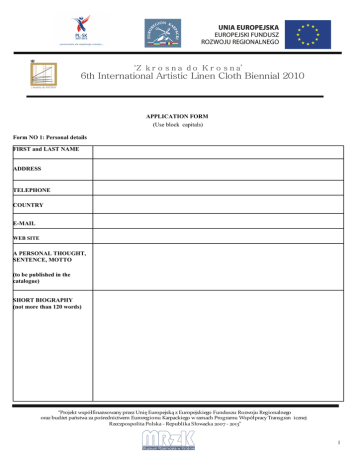 ‘Z k r o s n a d o K r o s n a’ 6th International Artistic Linen Cloth Biennial 2010 APPLICATION FORM (Use block capitals) Form NO 1: Personal details FIRST and LAST NAME ADDRESS TELEPHONE COUNTRY E-MAIL WEB SITE A PERSONAL THOUGHT, SENTENCE, MOTTO (to be published in the catalogue) SHORT BIOGRAPHY (not more than 120 words) “Projekt współfinansowany przez Unię Europejską z Europejskiego Funduszu Rozwoju Regionalnego oraz budżet państwa za pośrednictwem Euroregionu Karpackiego w ramach Programu Współpracy Transgran icznej Rzeczpospolita Polska - Republika Słowacka 2007 - 2013” 1 ‘Z k r o s n a d o K r o s n a’ 6th International Artistic Linen Cloth Biennial 2010 Form NO 2: Submitted artworks TITLE YEAR OF CREATION TECHNIQUE DIMENSIONS AUTHOR'S PRICE (PLN lub EURO) I DONATE THE ARTWORK (YES or NO) 1. I hereby give my consent/ do not give my consent* for publishing my biography in the exhibition catalogue. 2. I hereby accept the rules and conditions of the Biennial and I bind myself to obey them. ...................................................................................... (Signature) * Delete as applicable “Projekt współfinansowany przez Unię Europejską z Europejskiego Funduszu Rozwoju Regionalnego oraz budżet państwa za pośrednictwem Euroregionu Karpackiego w ramach Programu Współpracy Transgran icznej Rzeczpospolita Polska - Republika Słowacka 2007 - 2013” 2