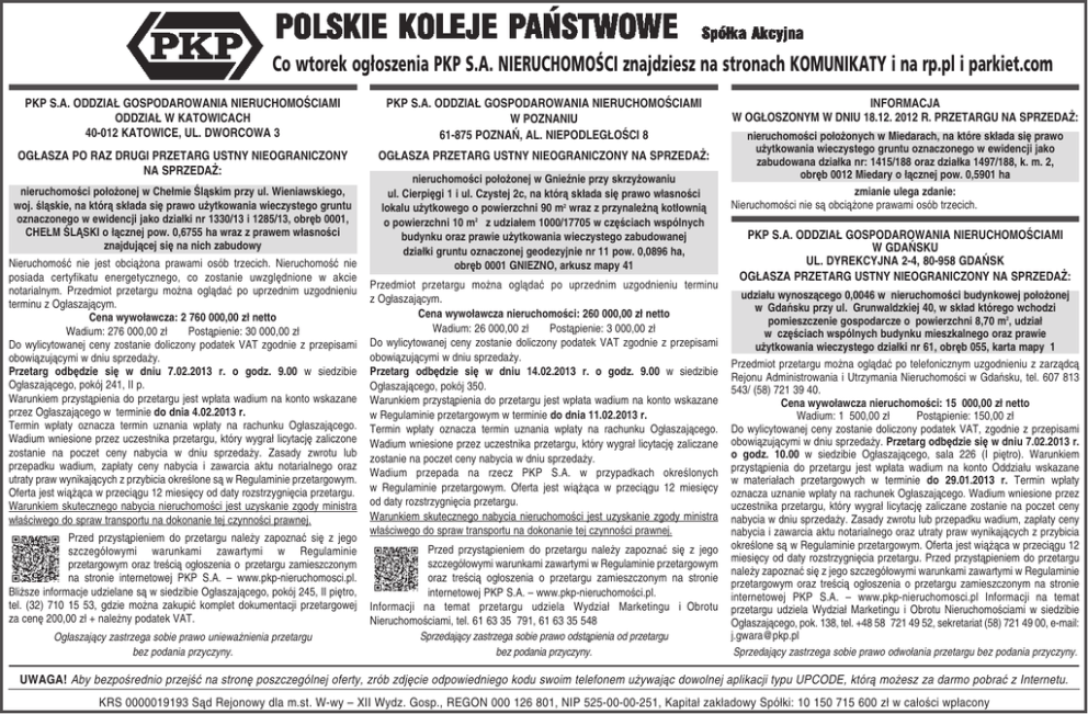 Co wtorek ogłoszenia PKP S.A. NIERUCHOMOŚCI znajdziesz na stronach KOMUNIKATY i na rp.pl i parkiet.com PKP S.A. ODDZIAŁ GOSPODAROWANIA NIERUCHOMOŚCIAMI ODDZIAŁ W KATOWICACH 40-012 KATOWICE, UL. DWORCOWA 3 PKP S.A. ODDZIAŁ GOSPODAROWANIA NIERUCHOMOŚCIAMI W POZNANIU 61-875 POZNAŃ, AL. NIEPODLEGŁOŚCI 8 OGŁASZA PO RAZ DRUGI PRZETARG USTNY NIEOGRANICZONY NA SPRZEDAŻ: OGŁASZA PRZETARG USTNY NIEOGRANICZONY NA SPRZEDAŻ: nieruchomości położonej w Chełmie Śląskim przy ul. Wieniawskiego, woj. śląskie, na którą składa się prawo użytkowania wieczystego gruntu oznaczonego w ewidencji jako działki nr 1330/13 i 1285/13, obręb 0001, CHEŁM ŚLĄSKI o łącznej pow. 0,6755 ha wraz z prawem własności znajdującej się na nich zabudowy Nieruchomość nie jest obciążona prawami osób trzecich. Nieruchomość nie posiada certyfikatu energetycznego, co zostanie uwzględnione w akcie notarialnym. Przedmiot przetargu można oglądać po uprzednim uzgodnieniu terminu z Ogłaszającym. Cena wywoławcza: 2 760 000,00 zł netto Wadium: 276 000,00 zł Postąpienie: 30 000,00 zł Do wylicytowanej ceny zostanie doliczony podatek VAT zgodnie z przepisami obowiązującymi w dniu sprzedaży. Przetarg odbędzie się w dniu 7.02.2013 r. o godz. 9.00 w siedzibie Ogłaszającego, pokój 241, II p. Warunkiem przystąpienia do przetargu jest wpłata wadium na konto wskazane przez Ogłaszającego w terminie do dnia 4.02.2013 r. Termin wpłaty oznacza termin uznania wpłaty na rachunku Ogłaszającego. Wadium wniesione przez uczestnika przetargu, który wygrał licytację zaliczone zostanie na poczet ceny nabycia w dniu sprzedaży. Zasady zwrotu lub przepadku wadium, zapłaty ceny nabycia i zawarcia aktu notarialnego oraz utraty praw wynikających z przybicia określone są w Regulaminie przetargowym. Oferta jest wiążąca w przeciągu 12 miesięcy od daty rozstrzygnięcia przetargu. Warunkiem skutecznego nabycia nieruchomości jest uzyskanie zgody ministra właściwego do spraw transportu na dokonanie tej czynności prawnej. Przed przystąpieniem do przetargu należy zapoznać się z jego szczegółowymi warunkami zawartymi w Regulaminie przetargowym oraz treścią ogłoszenia o przetargu zamieszczonym na stronie internetowej PKP S.A. – www.pkp-nieruchomosci.pl. Bliższe informacje udzielane są w siedzibie Ogłaszającego, pokój 245, II piętro, tel. (32) 710 15 53, gdzie można zakupić komplet dokumentacji przetargowej za cenę 200,00 zł + należny podatek VAT. Ogłaszający zastrzega sobie prawo unieważnienia przetargu bez podania przyczyny. nieruchomości położonej w Gnieźnie przy skrzyżowaniu ul. Cierpięgi 1 i ul. Czystej 2c, na którą składa się prawo własności lokalu użytkowego o powierzchni 90 m2 wraz z przynależną kotłownią o powierzchni 10 m2ā z udziałem 1000/17705 w częściach wspólnych budynku oraz prawie użytkowania wieczystego zabudowanej działki gruntu oznaczonej geodezyjnie nr 11 pow. 0,0896 ha, obręb 0001 GNIEZNO, arkusz mapy 41 Przedmiot przetargu można oglądać po uprzednim uzgodnieniu terminu z Ogłaszającym. Cena wywoławcza nieruchomości: 260 000,00 zł netto Wadium: 26 000,00 zł Postąpienie: 3 000,00 zł Do wylicytowanej ceny zostanie doliczony podatek VAT zgodnie z przepisami obowiązującymi w dniu sprzedaży. Przetarg odbędzie się w dniu 14.02.2013 r. o godz. 9.00 w siedzibie Ogłaszającego, pokój 350. Warunkiem przystąpienia do przetargu jest wpłata wadium na konto wskazane w Regulaminie przetargowym w terminie do dnia 11.02.2013 r. Termin wpłaty oznacza termin uznania wpłaty na rachunku Ogłaszającego. Wadium wniesione przez uczestnika przetargu, który wygrał licytację zaliczane zostanie na poczet ceny nabycia w dniu sprzedaży. Wadium przepada na rzecz PKP S.A. w przypadkach określonych w Regulaminie przetargowym. Oferta jest wiążąca w przeciągu 12 miesięcy od daty rozstrzygnięcia przetargu. Warunkiem skutecznego nabycia nieruchomości jest uzyskanie zgody ministra właściwego do spraw transportu na dokonanie tej czynności prawnej. Przed przystąpieniem do przetargu należy zapoznać się z jego szczegółowymi warunkami zawartymi w Regulaminie przetargowym oraz treścią ogłoszenia o przetargu zamieszczonym na stronie internetowej PKP S.A. – www.pkp-nieruchomości.pl. Informacji na temat przetargu udziela Wydział Marketingu i Obrotu Nieruchomościami, tel. 61 63 35 791, 61 63 35 548 Sprzedający zastrzega sobie prawo odstąpienia od przetargu bez podania przyczyny. INFORMACJA W OGŁOSZONYM W DNIU 18.12. 2012 R. PRZETARGU NA SPRZEDAŻ: nieruchomości położonych w Miedarach, na które składa się prawo użytkowania wieczystego gruntu oznaczonego w ewidencji jako zabudowana działka nr: 1415/188 oraz działka 1497/188, k. m. 2, obręb 0012 Miedary o łącznej pow. 0,5901 ha zmianie ulega zdanie: Nieruchomości nie są obciążone prawami osób trzecich. PKP S.A. ODDZIAŁ GOSPODAROWANIA NIERUCHOMOŚCIAMI W GDAŃSKU UL. DYREKCYJNA 2-4, 80-958 GDAŃSK OGŁASZA PRZETARG USTNY NIEOGRANICZONY NA SPRZEDAŻ: udziału wynoszącego 0,0046 w nieruchomości budynkowej położonej w Gdańsku przy ul. Grunwaldzkiej 40, w skład którego wchodzi pomieszczenie gospodarcze o powierzchni 8,70 m2, udział w częściach wspólnych budynku mieszkalnego oraz prawie użytkowania wieczystego działki nr 61, obręb 055, karta mapy 1 Przedmiot przetargu można oglądać po telefonicznym uzgodnieniu z zarządcą Rejonu Administrowania i Utrzymania Nieruchomości w Gdańsku, tel. 607 813 543/ (58) 721 39 40. Cena wywoławcza nieruchomości: 15 000,00 zł netto Wadium: 1 500,00 zł Postąpienie: 150,00 zł Do wylicytowanej ceny zostanie doliczony podatek VAT, zgodnie z przepisami obowiązującymi w dniu sprzedaży. Przetarg odbędzie się w dniu 7.02.2013 r. o godz. 10.00 w siedzibie Ogłaszającego, sala 226 (I piętro). Warunkiem przystąpienia do przetargu jest wpłata wadium na konto Oddziału wskazane w materiałach przetargowych w