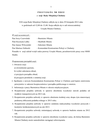 1 P R O T O K Ó Ł NR XXI/12 z sesji Rady Miejskiej Chełmży XXI sesja Rady Miejskiej Chełmży odbyła się w dniu 29 listopada 2012 roku w godzinach od 12,00 do 13,40. Sesja odbyła się w sali mieszczańskiej Urzędu Miasta Chełmży. _______________________________________________________________ W sesji uczestniczyli : Pan Jerzy Czerwiński - Burmistrz Miasta Pani Krystyna Lulka - Skarbnik Miasta Pan Janusz Wilczyński - Sekretarz Miasta Pan Mariusz Sobiecki - Komendant Komisariatu Policji w Chełmży Ponadto w sesji udział wzięli radca prawny Urzędu Miasta, przedstawiciele prasy oraz MMS Studio. Proponowany porządek sesji: 1. Otwarcie sesji: a) stwierdzenie quorum, b) wybór sekretarza obrad, c) przyjęcie porządku obrad, d) przyjęcie protokołu z ostatniej sesji. 2. Spotkanie z nowym Komendantem Komisariatu Policji w Chełmży pod kątem omówienia priorytetów w zakresie bezpieczeństwa i porządku publicznego w mieście. 3. Informacja z pracy Burmistrza Miasta w okresie międzysesyjnym. 4. Rozpatrzenie projektu uchwały w sprawie określenia wysokości stawek podatku od środków transportowych na 2013 rok. 5. Rozpatrzenie projektu uchwały w sprawie obniżenia średniej ceny skupu żyta stanowiącej podstawę obliczenia podatku rolnego w 2013 roku. 6. Rozpatrzenie projektu uchwały w sprawie ustalenia maksymalnej wysokości pożyczek i kredytów krótkoterminowych na rok 2013. 7. Rozpatrzenie projektu uchwały zmieniającej uchwałę w sprawie budżetu miasta na 2012 rok. 8. Rozpatrzenie projektu uchwały w sprawie określenia wysokości sumy, do której Burmistrz Miasta Chełmży może samodzielnie zaciągnąć zobowiązania. 2 9.Rozpatrzenie projektu uchwały w sprawie zwiększenia wartości majątku Zakładu Wodociągów i Kanalizacji w Chełmży. 10. Rozpatrzenie projektu uchwały w sprawie obwodów głosowania. 11. Interpelacje. 12. Odpowiedzi na interpelacje. 13. Wnioski i zapytania. 14. Odpowiedzi na wnioski i zapytania. 15. Oświadczenia. 16. Komunikaty. 17. Zamknięcie sesji. Ad. pkt 1 a) Otwarcia sesji dokonał Przewodniczący Rady Miejskiej Chełmży Pan Janusz Kalinowski i na podstawie listy obecności stwierdził, że jest quorum, gdyż na stan ustawowy 15 radnych obecnych było 13. Lista obecności stanowi załącznik do protokołu. b) Sekretarzem obrad w wyniku głosowania za 12, wstrz.1 wybrana została radna Małgorzata Polikowska. c) Proponowany porządek sesji został przyjęty jednogłośnie – 13 za. d) Protokół z XX sesji Rady Miejskiej Chełmży został przyjęty jednogłośnie – 13 za. Ad. pkt 2 Spotkanie z nowym Komendantem Komisariatu Policji w Chełmży pod kątem omówienia priorytetów w zakresie bezpieczeństwa i porządku publicznego w mieście. Radny Janusz Kalinowski Panie Burmistrzu! Wysoka Rado! 12 listopada 2012 roku Komendant Miejski Policji w Toruniu insp. Antoni Stramek w obecności Burmistrza Miasta Chełmży Pana Jerzego Czerwińskiego oraz wójtów gmin: Chełmża, Łysomice, Łubianka i Zławieś Wielka, podziękował Komendantowi Komisariatu Policji w Chełmży podkom. Wojciechowi Zacharskiemu za wieloletnią, sumienną i oddaną służbę społeczeństwu miasta i gminy Chełmża. W tym samym dniu insp. Antoni Stramek na to stanowisko powołał nowego komendanta, którym został nadkom. Mariusz Sobiecki. Nowy komendant służbę w Policji rozpoczął w 1991r. W kolejnych latach nadkom Mariusz Sobiecki 3 służył na podstawowych stanowiskach w pionie prewencji i kryminalnym. Doskonalił również swoje przygotowanie teoretyczne do pracy w tym obszarze działań Policji. Posiadana wiedza i wyniki uzyskiwane w pracy zawodowej oraz stosowne przeszkolenie resortowe spowodowało, iż przełożeni dostrzegli w nim potencjał, który należy odpowiednio wykorzystać. I tak: • w 2003 r. powierzono mu stanowisko Kierownika Referatu II Sekcji Kryminalnej Komisariatu Policji Bydgoszcz – Bartodzieje, • w 2006 r. po trzech latach zdobywania zawodowych doświadczeń został naczelnikiem tejże sekcji. • w 2007 r. został mianowany Naczelnikiem Sekcji Kryminalnej Komisariatu Policji Bydgoszcz – Śródmieście (największej jednostki w Bydgoszczy). • od 2009 r. do chwili obecnej pełnił służbę na stanowisku Naczelnika Wydziału Kryminalnego Komisariatu Policji Bydgoszcz – Szwederowo. Jego receptą na najlepsze działanie policji jest maksymalna współpraca ze społeczeństwem. Wyrażam przekonanie, iż nowy Komendant Komisariatu Policji w Chełmży może liczyć na dobrą współpracę zarówno ze strony Burmistrza Miasta Chełmży Pana Jerzego Czerwińskiego jak również Rady Miejskiej Chełmży i poszczególnych radnych w zakresie bezpieczeństwa i porządku publicznego na terenie naszego miasta. Panie Komendancie! Zdaję sobie sprawę z tego, iż w tak krótkim czasie nie zdołał Pan zapoznać się ze wszystkimi sprawami i tematami, którymi zajmuje się Komisariat Policji w Chełmży. Nie oczekuję również, że w tej chwili przedstawi nam Pan ocenę stanu bezpieczeństwa w mieście. Na to przyjdzie czas w późniejszym terminie. Natomiast pozwolę sobie zadać pytanie o priorytety w zakresie bezpieczeństwa i porządku publicznego na najbliższe miesiące. O ile pominąłem jakieś istotne szczegóły z Pańskiej kariery zawodowej to proszę o sprostowanie. Pan Mariusz Sobiecki Dziękuję bardzo. Nie wiedziałem, że tyle można o mnie powiedzieć. Bardzo dziękuję za zaproszenie. Rozmawiałem wcześniej z Panem Burmistrzem, Panem Wiceburmistrzem, z Przewodniczącym Rady Miejskiej. Moje zamierzenia są bardzo proste i transparentne. Uważam, że Policja w każdym miejscu w kraju, czy to jest duże czy małe miasto, powinna zajmować się przede wszystkim zwalczaniem przestępczości, głównie tej najbardziej dokuczliwej społecznie, czyli w zakresie włamań, kradzieży, uszkodzeń mienia, bójek, pobić, rozbojów. Policja musi działać w taki sposób, aby przede wszystkim poczucie bezpieczeństwa 4 na tere