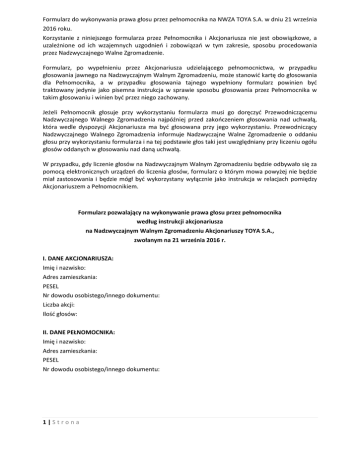 Formularz do wykonywania prawa głosu przez pełnomocnika na NWZA TOYA S.A. w dniu 21 września 2016 roku. Korzystanie z niniejszego formularza przez Pełnomocnika i Akcjonariusza nie jest obowiązkowe, a uzależnione od ich wzajemnych uzgodnień i zobowiązań w tym zakresie, sposobu procedowania przez Nadzwyczajnego Walne Zgromadzenie. Formularz, po wypełnieniu przez Akcjonariusza udzielającego pełnomocnictwa, w przypadku głosowania jawnego na Nadzwyczajnym Walnym Zgromadzeniu, może stanowić kartę do głosowania dla Pełnomocnika, a w przypadku głosowania tajnego wypełniony formularz powinien być traktowany jedynie jako pisemna instrukcja w sprawie sposobu głosowania przez Pełnomocnika w takim głosowaniu i winien być przez niego zachowany. Jeżeli Pełnomocnik głosuje przy wykorzystaniu formularza musi go doręczyć Przewodniczącemu Nadzwyczajnego Walnego Zgromadzenia najpóźniej przed zakończeniem głosowania nad uchwałą, która wedle dyspozycji Akcjonariusza ma być głosowana przy jego wykorzystaniu. Przewodniczący Nadzwyczajnego Walnego Zgromadzenia informuje Nadzwyczajne Walne Zgromadzenie o oddaniu głosu przy wykorzystaniu formularza i na tej podstawie głos taki jest uwzględniany przy liczeniu ogółu głosów oddanych w głosowaniu nad daną uchwałą. W przypadku, gdy liczenie głosów na Nadzwyczajnym Walnym Zgromadzeniu będzie odbywało się za pomocą elektronicznych urządzeń do liczenia głosów, formularz o którym mowa powyżej nie będzie miał zastosowania i będzie mógł być wykorzystany wyłącznie jako instrukcja w relacjach pomiędzy Akcjonariuszem a Pełnomocnikiem. Formularz pozwalający na wykonywanie prawa głosu przez pełnomocnika według instrukcji akcjonariusza na Nadzwyczajnym Walnym Zgromadzeniu Akcjonariuszy TOYA S.A., zwołanym na 21 września 2016 r. I. DANE AKCJONARIUSZA: Imię i nazwisko: Adres zamieszkania: PESEL Nr dowodu osobistego/innego dokumentu: Liczba akcji: Ilość głosów: II. DANE PEŁNOMOCNIKA: Imię i nazwisko: Adres zamieszkania: PESEL Nr dowodu osobistego/innego dokumentu: 1|Strona III. OBJAŚNIENIA: Niniejsza instrukcja została sporządzona na podstawie porządku obrad zgłoszonego przez Akcjonariuszy żądających zwołania Nadzwyczajnego Walnego Zgromadzenia Akcjonariuszy (o czym TOYA S.A. informowała raportem bieżącym nr 34/2016), planowanego na dzień 21 września 2016 r. Instrukcję dla pełnomocnika należy wypełnić tylko w przypadku, gdy udzielone pełnomocnictwo zobowiązuje pełnomocnika do głosowania zgodnie z instrukcją (a nie według uznania pełnomocnika). Akcjonariusze proszeni są o wydanie instrukcji poprzez wstawienie „X” w odpowiedniej rubryce. W przypadku gdy dane pole nie jest uzupełniane, miejsca wykropkowane należy przekreślić. W przypadku, gdy Akcjonariusz chce głosować odmiennie z posiadanych akcji, powinien wskazać w odpowiednim miejscu liczbę akcji oraz ilość głosów, z których pełnomocnik ma głosować „za”, „przeciw” lub „wstrzymać się od głosu”. W przypadku braku wskazania liczby akcji uznaje się, że pełnomocnik uprawniony jest do głosowania we wskazany sposób ze wszystkich akcji posiadanych przez Akcjonariusza. W żadnym przypadku suma akcji Spółki, których dotyczyć będzie instrukcja co do odmiennego głosowania z posiadanych akcji nie może przekroczyć liczby wszystkich akcji Spółki posiadanych i zarejestrowanych przez Akcjonariusza na Nadzwyczajnym Walnym Zgromadzeniu. Błędnie wypełniony formularz bądź złożony z niezaznaczonymi przez Pełnomocnika polami jednoznacznie określającymi wolę Pełnomocnika w danym głosowaniu, nie będzie brany w danym głosowaniu pod uwagę i uwzględniany w jego wynikach. Spółka zastrzega, że w przypadku posłużenia się przez Akcjonariusza i Pełnomocnika niniejszym formularzem nie będzie weryfikowana zgodność oddania głosu z treścią instrukcji w nim zawartej. Decydowało będzie oddanie lub nie oddanie głosu przez Pełnomocnika, także w przypadku, gdy dane zachowanie Pełnomocnika będzie sprzeczne z treścią instrukcji. Z uwagi na fakt, że Nadzwyczajne Walne Zgromadzenie Akcjonariuszy jest zwołane w związku z żądaniem Akcjonariuszy, do przedmiotowego żądania nie zostały dołączone projekty uchwał w przypadku posługiwania się przedmiotowym formularzem należy uzupełnić go o treść zgłoszonych uchwał. Każda z uchwał dla ułatwienia ewentualnego posługiwania się formularzem przez Pełnomocnika została umieszczona na osobnej stronie/kartce. Akcjonariusz i Pełnomocnik mogą wykorzystać tylko niektóre ze stron formularza według własnego uznania. 2|Strona IV. INSTRUKCJA GŁOSOWANIA: Uchwała nr 1 Nadzwyczajnego Walnego Zgromadzenia Akcjonariuszy TOYA S.A. z siedzibą we Wrocławiu z dnia 21 września 2016 roku w sprawie ___________________________________ §1 ___________________________________________________________________________ ___________________________________________________________________________ __________________________________________________________________________ §2 Uchwała wchodzi w życie z dniem _______________________. Instrukcja dla Pełnomocnika*: Oddanie głosu: ZA Oddanie głosu: PRZECIW Oddanie głosu: WSTRZYMUJĘ SIĘ Liczba akcji: Liczba akcji: Liczba akcji: ……………………………………… ……………………………………… ……………………………………… Liczba głosów: Liczba głosów: Liczba głosów: ……………………………………… ……………………………………… ……………………………………… ZGŁASZAM SPRZECIW CO DO UCHWAŁY Treść sprzeciwu*: * w przypadku nie wyrażania sprzeciwu/braku instrukcji, pole: Instrukcja dla Pełnomocnika/Treść sprzeciwu należy przekreślić. Akcjonariusz: ...............................................................................................................................................