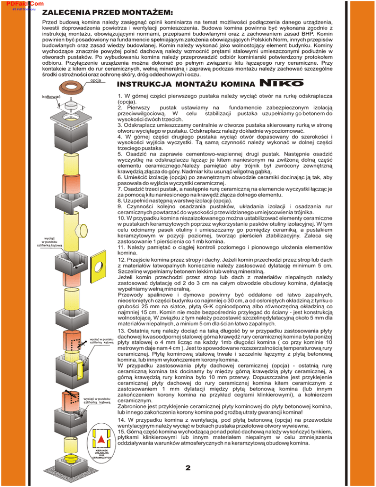 PDFaid.Com #1 Pdf Solutions opcja IKO 1. W górnej części pierwszego pustaka należy wyciąć otwór na rurkę odskraplacza (opcja). 2. Pierwszy pustak ustawiamy na fundamencie zabezpieczonym izolacją przeciwwilgociową. W celu stabilizacji pustaka uzupełniamy go betonem do wysokości dwóch trzecich. 3. Odskraplacz umieszczamy centralnie w otworze pustaka skierowany rurką w stronę otworu wyciętego w pustaku. Odskraplacz należy dokładnie wypoziomować. 4. W górnej części drugiego pustaka wyciąć otwór dopasowany do szerokości i wysokości wyjścia wyczystki. Tą samą czynność należy wykonać w dolnej części trzeciego pustaka. 5. Osadzić na zaprawie cementowo-wapiennej drugi pustak. Następnie osadzić wyczystkę na odskraplaczu łącząc je kitem naniesionym na zwilżoną dolną część elementu ceramicznego.Należy pamiętać aby trójnik był zwrócony zewnętrzną krawędzią złącza do góry. Nadmiar kitu usunąć wilgotną gąbką. 6. Umieścić izolację (opcja) po zewnętrznym obwodzie ceramiki docinając ją tak, aby pasowała do wyjścia wyczystki ceramicznej. 7. Osadzić trzeci pustak, a następnie rurę ceramiczną na elemencie wyczystki łącząc je za pomocą kitu naniesionego na krawędź złącza dolnego elementu. 8. Uzupełnić następną warstwę izolacji (opcja). 9. Czynności kolejno osadzania pustaków, układania izolacji i osadzania rur ceramicznych powtarzać do wysokości przewidzianego umiejscowienia trójnika. 10. W przypadku komina niezaizolowanego można ustabilizować elementy ceramiczne w pustakach keramzytowych poprzez wykorzystanie pasków otuliny izolacyjnej. W tym celu odcinamy pasek otuliny i umieszczamy go pomiędzy ceramiką, a pustakiem keramzytowym w pozycji poziomej, tworząc pierścień ztabilizacyjny. Zaleca się zastosowanie 1 pierścienia co 1 mb komina. 11. Należy pamiętać o ciągłej kontroli poziomego i pionowego ułożenia elementów komina. 12. Przejście komina przez stropy i dachy. Jeżeli komin przechodzi przez strop lub dach z materiałów łatwopalnych koniecznie należy zastosować dylatację minimum 5 cm. Szczelinę wypełniamy betonem lekkim lub wełną mineralną. Jeżeli komin przechodzi przez strop lub dach z materiałów niepalnych należy zastosować dylatację od 2 do 3 cm na całym obwodzie obudowy komina, dylatację wypełniamy wełną mineralną. Przewody spalinowe i dymowe powinny być oddalone od łatwo zapalnych, nieosłoniętych części budynku co najmniej o 30 cm, a od osłoniętych okładziną z tynku o grubości 25 mm na siatce, płytą G-K ognioodporną albo równorzędną okładziną co najmniej 15 cm. Komin nie może bezpośrednio przylegać do ściany - jest konstrukcją wolnostojącą. W związku z tym należy pozostawić szczelinędylatacyjną około 5 mm dla materiałów niepalnych, a minium 5 cm dla ścian łatwo zapalnych. 13. Ostatnią rurę należy dociąć na taką długość by w przypadku zastosowania płyty dachowej kwasoodpornej stalowej górna krawędź rury ceramicznej komina była poniżej płyty stalowej o 4 mm licząc na każdy 1mb długości komina ( co przy kominie 10 metrowym daje nam 4 cm ). Jest to spowodowane rozszerzalnością temperaturową rury ceramicznej. Płytę kominową stalową trwale i szczelnie łączymy z płytą betonową komina, lub innym wykończeniem korony komina. W przypadku zastosowania płyty dachowej ceramicznej (opcja) - ostatnią rurę ceramiczną komina tak docinamy by między górną krawędzią płyty ceramicznej, a górną krawędzią rury komina było 10 mm przerwy. Dopuszczalne jest przyklejenie ceramicznej płyty dachowej do rury ceramicznej komina kitem ceramicznym z zastosowaniem 1 mm dylatacji między płytą betonową komina (lub innym zakończeniem korony komina na przykład cegłami klinkierowymi), a kołnierzem ceramicznym. Zabronione jest przyklejenie ceramicznej płyty kominowej do płyty betonowej komina, lub innego zakończenia korony komina pod groźbą utraty gwarancji komina! 14. W przypadku komina z wentylacją, pod płytą betonową (opcja) na przewodzie wentylacyjnym należy wyciąć w bokach pustaka przelotowe otwory wywiewne. 15. Górną część komina wychodzącą ponad połać dachową należy wykończyć tynkiem, płytkami klinkierowymi lub innym materiałem niepalnym w celu zmniejszenia oddziaływania warunków atmosferycznych na keramzytową obudowę komina. 2