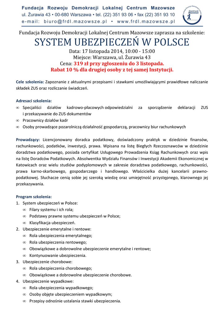 Fundacja Rozwoju Demokracji Lokalnej Centrum Mazowsze zaprasza na szkolenie: SYSTEM UBEZPIECZEŃ W POLSCE Data: 17 listopada 2014, 10:00 - 15:00 Miejsce: Warszawa, ul. Żurawia 43 Cena: 319 zł przy zgłoszeniu do 3 listopada. Rabat 10 % dla drugiej osoby z tej samej Instytucji. Cele szkolenia: Zapoznanie z aktualnymi przepisami i stawkami umożliwiającymi prawidłowe naliczanie składek ZUS oraz rozliczanie świadczeń. Adresaci szkolenia: • Specjaliści działów kadrowo-płacowych odpowiedzialni za sporządzenie deklaracji i przekazywanie do ZUS dokumentów • Pracownicy działów kadr • Osoby prowadzące pozarolniczą działalność gospodarczą, pracownicy biur rachunkowych ZUS Prowadzący: Licencjonowany doradca podatkowy, doświadczony praktyk w dziedzinie finansów, rachunkowości, podatków, inwestycji, prawa. Wpisana na listę Biegłych Rzeczoznawców w dziedzinie doradztwa podatkowego, posiada certyfikat Usługowego Prowadzenia Ksiąg Rachunkowych oraz wpis na listę Doradców Podatkowych. Absolwentka Wydziału Finansów i Inwestycji Akademii Ekonomicznej w Katowicach oraz wielu studiów podyplomowych w zakresie doradztwa podatkowego, rachunkowości, prawa karno-skarbowego, gospodarczego i handlowego. Właścicielka dużej kancelarii prawnopodatkowej. Słuchacze cenią sobie jej szeroką wiedzę oraz umiejętność przystępnego, klarownego jej przekazywania. Program szkolenia: 1. System ubezpieczeń w Polsce: • Filary systemu i ich rola; • Podstawy prawne systemu ubezpieczeń w Polsce; • Klasyfikacja ubezpieczeń. 2. Ubezpieczenie emerytalne i rentowe: • Rola ubezpieczenia emerytalnego; • Rola ubezpieczenia rentowego; • Obowiązkowe a dobrowolne ubezpieczenie emerytalne i rentowe; • Kontynuowanie ubezpieczenia. 3. Ubezpieczenie chorobowe: • Rola ubezpieczenia chorobowego; • Obowiązkowe a dobrowolne ubezpieczenie chorobowe. 4. Ubezpieczenie wypadkowe: • Rola ubezpieczenia wypadkowego; • Osoby objęte ubezpieczeniem wypadkowym; • Przepisy odnośnie ustalania stawki ubezpieczenia. 5. Składki w ubezpieczeniach społecznych: • Wysokość składek; • Terminy opłacania składek. 6. Zbieg tytułów do ubezpieczeń społecznych w różnych konfiguracjach. 7. Ubezpieczenie zdrowotne: • Rola ubezpieczenia zdrowotnego; • Wysokość składki i jej podstawa-ubezpieczenie zdrowotne członka rady nadzorczej; • Ubezpieczenie zdrowotne członków rodziny. 8. Składki w okresie niewykonywania pracy: • Czas niezdolności do pracy z powodu choroby lub wypadku; • Okres urlopu macierzyńskiego; • Przerwa w związku z urlopem wychowawczym; • Urlop bezpłatny. 9. Działalność gospodarcza a ubezpieczenie: • Przedsiębiorca; • Osoby współpracujące; • Przepisy preferencyjne i możliwość ich stosowania. 10. Fundusze: • Fundusz Pracy: rola i sposób podlegania; • Fundusz Gwarantowanych Świadczeń Pracowniczych: rola i sposób podlegania; • Fundusz Emerytur Pomostowych. 11. Praktyczne rozwiązywanie zadań z przedmiotowego zakresu z uwzględnieniem różnych stopni trudności. ZGŁOSZENIE SYSTEM UBEZPIECZEŃ W POLSCE Data: 17 listopada 2014, 10:00 - 15:00 Miejsce: Warszawa, ul. Żurawia 43 Cena: 319 zł przy zgłoszeniu do 3 listopada. Rabat 10 % dla drugiej osoby z tej samej Instytucji. Instytucja: ........................................................................................................................... Adres: ................................................................................................................................. NIP: ..................................................................................................................................... L.p. Imię i nazwisko Wydział tel. e-mail 1.......................................................................................................................................... 2.......................................................................................................................................... 3.......................................................................................................................................... ........................................................... podpis i pieczątka osoby delegującej Zgłoszenie na szkolenie Zgłoszenia prosimy przesyłać do 10 listopada 2014 r. fax: (22) 351 93 10, e-mail: [email protected] lub wybrać opcje zapisu przez stronę www.frdl.mazowsze.pl Przy zgłoszeniu w ramach Forów prosimy o wpisanie w uwagach: „Zgłoszenie w ramach Forum (nazwa odpowiedniego Forum)”. Ewentualną rezygnację ze szkolenia można zgłosić najpóźniej na dwa dni robocze przed szkoleniem. W przypadku niewykorzystania zgłoszonego uczestnictwa - Urząd będzie zobowiązany do sfinansowania 60% odpłatności za uczestnictwo i materiały. FRDL zastrzega sobie prawo odwołania szkolenia. Miejsce szkolenia: Warszawa, ul. Żurawia 43, Sala Konferencyjna FRDL. Lokalizacja 300 metrów od Metra Centrum. Cena: 319 zł netto przy zgłoszeniu do 3 listopada. Cena po 3 listopada to 369 zł. Rabat 10 % dla drugiej osoby z tej samej Instytucji. Zwolnienie z VAT w przypadku finansowania ze środków publicznych. W cenie materiały szkoleniowe, zaświadczenie, lunch oraz przerwy kawowe. Płatność przelewem, na podstawie faktury wystawionej w dniu szkolenia.
