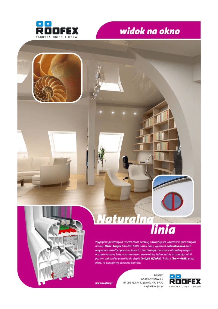 widok na okno Naturalna linia Wygląd współczesnych wnętrz coraz bardziej nawiązuje do wzorców inspirowanych naturą. Okna Roofex lini ideal 6000 passiv haus, wyróżnia naturalna linia oraz opływowe kształty oparte na łukach. Umożliwiają stworzenie atmosfery wnętrz naszych domów, bliższe naturalnemu srodowisku, jednocześnie utrzymując niski poziom wskaźnika przenikania ciepła (k=0,84 W/m2K) i hałasu (Rw>= 46dB) przez okno. To prawdziwe okna bez kantów. www.roofex.pl ROOFEX 72-005 Przecław 6 s. tel. 091 432 84 31 fax 091 432 84 30 [email protected]