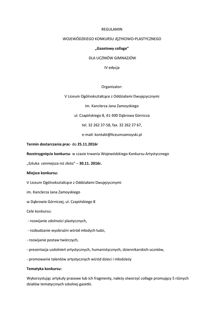 REGULAMIN WOJEWÓDZKIEGO KONKURSU JĘZYKOWO-PLASTYCZNEGO „Gazetowy collage” DLA UCZNIÓW GIMNAZJÓW IV edycja Organizator: V Liceum Ogólnokształcące z Oddziałami Dwujęzycznymi im. Kanclerza Jana Zamoyskiego ul. Czapińskiego 8, 41-300 Dąbrowa Górnicza tel. 32 262 37-58, fax. 32 262 27 67, e-mail: [email protected] Termin dostarczania prac- do 25.11.2016r Rozstrzygnięcie konkursu- w czasie trwania Wojewódzkiego Konkursu Artystycznego „Sztuka cenniejsza niż złoto” – 30.11. 2016r. Miejsce konkursu: V Liceum Ogólnokształcące z Oddziałami Dwujęzycznymi im. Kanclerza Jana Zamoyskiego w Dąbrowie Górniczej, ul. Czapińskiego 8 Cele konkursu: - rozwijanie zdolności plastycznych, - rozbudzanie wyobraźni wśród młodych ludzi, - rozwijanie postaw twórczych, - prezentacja uzdolnień artystycznych, humanistycznych, dziennikarskich uczniów, - promowanie talentów artystycznych wśród dzieci i młodzieży Tematyka konkursu: Wykorzystując artykuły prasowe lub ich fragmenty, należy stworzyć collage promujący 5 różnych działów tematycznych szkolnej gazetki. Uczestnicy: - uczniowie szkół gimnazjalnych uczestniczący w wykładzie, warsztacie w ramach „Akademii Wiedzy” organizowanej w V LO z Oddziałami Dwujęzycznymi im. Kanclerza Jana Zamoyskiego w Dąbrowie Górniczej oraz inni zainteresowani uczniowie. Warunki uczestnictwa: - prace mogą być tworzone indywidualnie lub w zespołach maksymalnie 3-osobowych (trzech uczniów) - organizator zastrzega sobie prawo do reprodukcji, ekspozycji prac w materiałach i publikacjach bez zgody autora i bez uiszczania autorowi należności finansowych, - organizator zastrzega sobie prawo bezpłatnego udostępniania nadesłanych prac zainteresowanym instytucjom, - nadsyłanie prac jest równoznaczne z przyjęciem warunków regulaminu. -zwycięzcy i ich opiekunowie zostaną poinformowani telefonicznie i zaproszeni po odbiór nagród i dyplomów Dla zwycięzców przewidziane są atrakcyjne nagrody. Serdecznie zapraszamy!!! Koordynatorzy mgr Agata Benduska mgr Anna Adamuszek KARTA ZGŁOSZENIA W o j e w ó d z k i K o n k u r s Językowo – Plastyczny „Gazetowy collage” IV edycja imię i nazwisko ucznia (uczniów) i wiek 1. …………………………………………......................................... 2. ………………………………………………………………………. 3. ………………………………………………………………………. dokładna nazwa szkoły: ................................................................................................. ................................................................................................. ................................................................................................. ................................................................................................ adres szkoły ................................................................................................ ................................................................................................ ................................................................................................ tel/fax ................................................................. e-mail szkoły ................................................................ imię i nazwisko opiekuna ................................................................