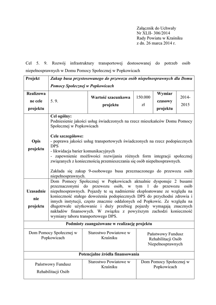 Załącznik do Uchwały Nr XLII- 306/2014 Rady Powiatu w Kraśniku z dn. 26 marca 2014 r. Cel 5. 9. Rozwój infrastruktury transportowej dostosowanej do potrzeb osób niepełnosprawnych w Domu Pomocy Społecznej w Popkowicach Projekt Zakup busa przystosowanego do przewozu osób niepełnosprawnych dla Domu Pomocy Społecznej w Popkowicach Realizowa ne cele 5. 9. projektu Wartość szacunkowa 150.000 projektu zł Wymiar czasowy projektu 20142015 Cel ogólny: Podniesienie jakości usług świadczonych na rzecz mieszkańców Domu Pomocy Społecznej w Popkowicach Opis projektu Uzasadnie nie projektu Cele szczegółowe: - poprawa jakości usług transportowych świadczonych na rzecz podopiecznych DPS - likwidacja barier komunikacyjnych - zapewnienie moŜliwości rozwijania róŜnych form integracji społecznej związanych z koniecznością przemieszczania się osób niepełnosprawnych. Zakłada się zakup 9-osobowego busa przeznaczonego do przewozu osób niepełnosprawnych. Dom Pomocy Społecznej w Popkowicach aktualnie dysponuje 2 busami przeznaczonymi do przewozu osób, w tym 1 do przewozu osób niepełnosprawnych. Pojazdy te są nadmiernie eksploatowane ze względu na konieczność stałego dowoŜenia podopiecznych DPS do przychodni zdrowia i innych instytucji, często znacznie oddalonych od Popkowic. Ze względu na długotrwałe uŜytkowanie i duŜy przebieg pojazdy wymagają znacznych nakładów finansowych. W związku z powyŜszym zachodzi konieczność wymiany taboru transportowego DPS. Podmioty zaangaŜowane w realizację projektu Dom Pomocy Społecznej w Popkowicach Starostwo Powiatowe w Kraśniku Państwowy Fundusz Rehabilitacji Osób Niepełnosprawnych Potencjalne źródła finansowania Państwowy Fundusz Rehabilitacji Osób Starostwo Powiatowe w Kraśniku Dom Pomocy Społecznej w Popkowicach Niepełnosprawnych Beneficjenci projektu Dom Pomocy Społecznej w Popkowicach i jego pensjonariusze, w tym szczególnie osoby niepełnosprawne. Efekty i korzyści realizacji projektu Uwarunko wania realizacji projektu Autorzy projektu Zakup busa przystosowanego do przewozu osób niepełnosprawnych przyczyni się do poprawy jakości usług świadczonych przez DPS na rzecz podopiecznych. W szczególności bus będzie wykorzystywany do przewozu mieszkańców na konsultacje zdrowotne oraz na uroczystości i imprezy integracyjne organizowane w zaprzyjaźnionych domach pomocy społecznej. Zakup busa w znaczący sposób ułatwi przeciwdziałanie powstawaniu barier komunikacyjnych wobec niepełnosprawnych mieszkańców DPS, przez co będzie słuŜyć wyrównywaniu ich szans równoprawnego udziału w Ŝyciu społecznym. Realizacja przedstawionego dofinansowania z PFRON. projektu Marek Klimek Dom Pomocy Społecznej w Popkowicach uzaleŜniona jest od uzyskania