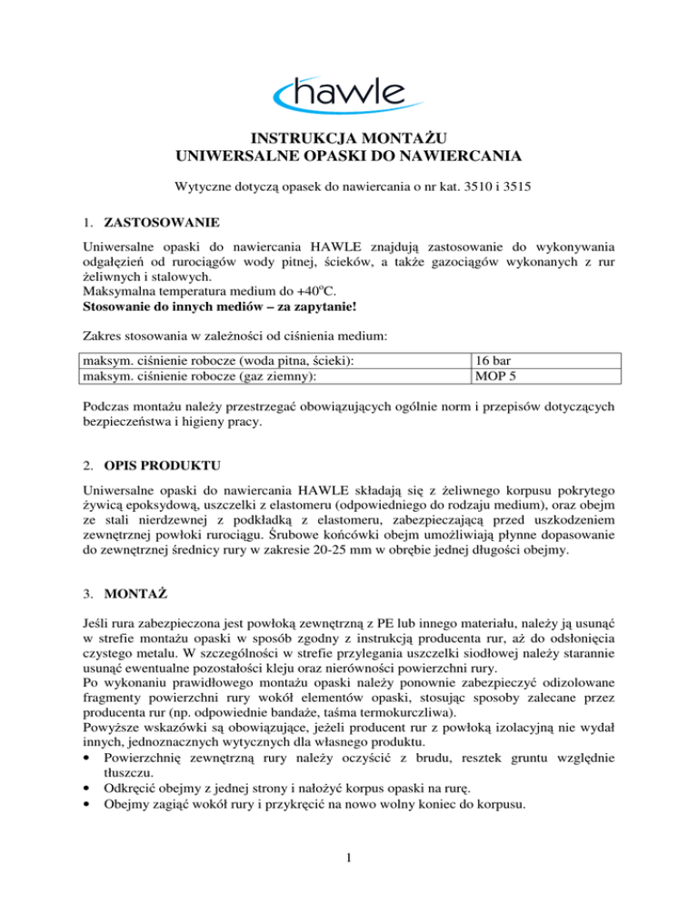 INSTRUKCJA MONTAŻU UNIWERSALNE OPASKI DO NAWIERCANIA Wytyczne dotyczą opasek do nawiercania o nr kat. 3510 i 3515 1. ZASTOSOWANIE Uniwersalne opaski do nawiercania HAWLE znajdują zastosowanie do wykonywania odgałęzień od rurociągów wody pitnej, ścieków, a także gazociągów wykonanych z rur żeliwnych i stalowych. Maksymalna temperatura medium do +40oC. Stosowanie do innych mediów – za zapytanie! Zakres stosowania w zależności od ciśnienia medium: maksym. ciśnienie robocze (woda pitna, ścieki): maksym. ciśnienie robocze (gaz ziemny): 16 bar MOP 5 Podczas montażu należy przestrzegać obowiązujących ogólnie norm i przepisów dotyczących bezpieczeństwa i higieny pracy. 2. OPIS PRODUKTU Uniwersalne opaski do nawiercania HAWLE składają się z żeliwnego korpusu pokrytego żywicą epoksydową, uszczelki z elastomeru (odpowiedniego do rodzaju medium), oraz obejm ze stali nierdzewnej z podkładką z elastomeru, zabezpieczającą przed uszkodzeniem zewnętrznej powłoki rurociągu. Śrubowe końcówki obejm umożliwiają płynne dopasowanie do zewnętrznej średnicy rury w zakresie 20-25 mm w obrębie jednej długości obejmy. 3. MONTAŻ Jeśli rura zabezpieczona jest powłoką zewnętrzną z PE lub innego materiału, należy ją usunąć w strefie montażu opaski w sposób zgodny z instrukcją producenta rur, aż do odsłonięcia czystego metalu. W szczególności w strefie przylegania uszczelki siodłowej należy starannie usunąć ewentualne pozostałości kleju oraz nierówności powierzchni rury. Po wykonaniu prawidłowego montażu opaski należy ponownie zabezpieczyć odizolowane fragmenty powierzchni rury wokół elementów opaski, stosując sposoby zalecane przez producenta rur (np. odpowiednie bandaże, taśma termokurczliwa). Powyższe wskazówki są obowiązujące, jeżeli producent rur z powłoką izolacyjną nie wydał innych, jednoznacznych wytycznych dla własnego produktu. • Powierzchnię zewnętrzną rury należy oczyścić z brudu, resztek gruntu względnie tłuszczu. • Odkręcić obejmy z jednej strony i nałożyć korpus opaski na rurę. • Obejmy zagiąć wokół rury i przykręcić na nowo wolny koniec do korpusu. 1 • • • Ustawić opaskę w docelowym położeniu, dokręcić śruby obejm na krzyż kluczem dynamometrycznym (moment 60-70 Nm, maks. 100 Nm). Nie używać przedłużek klucza! Zamontować zasuwę odcinającą, jeśli nawiercanie rury ma się odbyć pod ciśnieniem na czynnym przewodzie. Zasuwa musi być w położeniu w 100% otwartym. Przewiercić rurę zgodnie z instrukcją producenta aparatu do nawiercania. 4. KONSERWACJA Uniwersalne opaski do nawiercania HAWLE nie wymagają konserwacji w swoim okresie eksploatacji. 5. URUCHOMIENIE I BADANIE SZCZELNOŚCI Po zamontowaniu sprawdzić zgodnie z obowiązującymi przepisami szczelność rurociągu przed zasypaniem wykopu. Należy przestrzegać podanych maksymalnych wartości ciśnień roboczych w zależności od medium oraz zewnętrznej średnicy rury. Wszelkie dodatkowe pytania dotyczące doboru, montażu i eksploatacji prosimy kierować do: • właściwych terytorialnie Regionalnych Menedżerów Sprzedaży – nr telefonów dostępne na stronie internetowej: www.hawle.pl • działu Serwisu 24 godz. nr tel.: 609 550 550 • lub bezpośrednio do: Fabryka Armatury Hawle Spółka z o.o. 62-028 Koziegłowy ul. Piaskowa 9 Dział Marketingu Technicznego tel.: 61 81 11 409 tel.: 61 81 11 410 fax: 61 81 11 413 e-mail: [email protected] www.hawle.pl 2