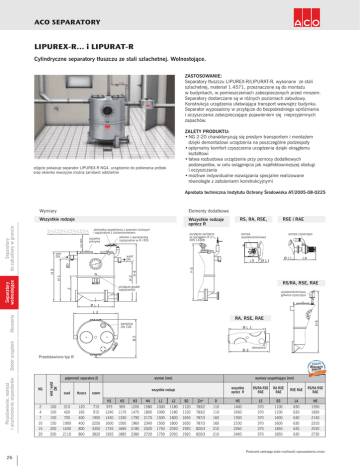 ACO SEPARATORY LIPUREX-R... i LIPURAT-R Cylindryczne separatory tłuszczu ze stali szlachetnej. Wolnostojące. ZASTOSOWANIE: Separatory tłuszczu LIPUREX-R/LIPURAT-R, wykonane ze stali szlachetnej, materiał 1.4571, przeznaczone są do montażu w budynkach, w pomieszczeniach zabezpieczonych przed mrozem. Separatory dostarczane są w różnych poziomach zabudowy. Konstrukcja urządzenia ułatwiająca transport wewnątrz budynku. Separator wyposażony w przyłącze do bezpośredniego opróżniania i oczyszczania zabezpieczające pojawieniem się nieprzyjemnych zapachów. ZALETY PRODUKTU: • NG 2-20 charakteryzują się prostym transportem i montażem dzięki demontażowi urządzenia na poszczególne podzespoły • optymalny komfort czyszczenia urządzenia dzięki okrągłemu kształtowi • łatwa rozbudowa urządzenie przy pomocy dodatkowych podzespołów, w celu osiągnięcia jak najefektowniejszej obsługi i oczyszczania • możliwe indywidualne rozwiązania specjalne realizowane równolegle z założeniami konstrukcyjnymi zdjęcie pokazuje separator LIPUREX-R NG4, urządzenie do pobierania próbek oraz okienko rewizyjne można zamówić oddzielnie Aprobata techniczna Instytutu Ochrony Środowiska AT/2005-08-0225 Elementy dodatkowe Wszystkie rodzaje Wszystkie rodzaje oprócz R Separatory do zabudowy w gruncie Wymiary Jednostka wypełnienia z zaworem kulowym i opcjonalnie z ciśnieniomierzem okienko z wycieraczką szczelna (opcjonalnie w R i RD) pokrywa wlot DN ... RSE i RAE pompa wysokociśnieniowa przyłącze sanitarne ze sprzęgłem R 21/2, DIN 14308 pompa czyszcząca Separatory wolnostojące wylot DN ... RS/RA, RSE, RAE przyłącze grzałki (opcjonalnie) Akcesoria wysokociśnieniowa gołwica czyszcząca RA, RSE, RAE wentylcja DN 100 sterowanie Przedstawiono typ R pojemność separatora [l] NG 2 4 7 10 15 20 wlot / wylot DN Dobór urządzeń Posadowienie, montaż i uruchomienie separatorów RS, RA, RSE, osad tłuszcz razem 100 100 150 150 200 200 210 420 705 1000 1630 2110 120 165 400 400 800 800 715 915 1950 2250 3350 3820 wymiar [mm] wymiary uzupełniające [mm] wszystkie oprócz R wszystkie rodzaje RS/RA RSE RAE RA RSE RAE RSE RAE RS/RA RSE RAE H1 H2 H3 H4 L1 L2 B2 Z/n* D H5 L5 B3 L4 H6 975 1240 1430 1600 1755 1935 905 1170 1330 1500 1685 1885 1205 1475 1790 1960 2180 2380 1580 1850 2170 2340 2520 2720 1000 1000 1500 1500 1750 1750 1180 1180 1800 1800 2050 2050 1120 1120 1650 1650 1920 1920 783/2 783/2 787/3 787/3 820/3 820/3 110 110 160 160 210 210 1400 1650 1930 2100 2260 2460 370 370 370 370 370 370 1100 1100 1600 1600 1850 1850 630 630 630 630 630 630 1550 1830 2140 2310 2530 2730 Producent zastrzega sobie możliwość wprowadzenia zmian. 26 ACO SEPARATORY Opis produktu LIPUREX-RD 1 stopień rozbudowy 2 7502.32.00 7502.62.00 4 7504.32.00 7504.62.00 7 7507.32.00 7507.62.00 10 7510.32.00 7510.62.00 15 7515.32.00 7515.62.00 20 7520.32.00 7520.62.00 LIPURAT-RS 2 stopień rozbudowy LIPURAT-RSE 2 stopień rozbudowy z pompą oczyszczającą LIPURAT-RS (2 stopień rozbudowy) • ręczne, wolne od nieprzyjemnych zapachów opróżnianie/ czyszczenie, poprzez bezpośrednie odsysanie i hydromechaniczne czyszczenie wysokociśnieniowe (175 bar) • niezbędne tylko przyłącze zimnej wody • z okienkiem rewizyjnym i jednostką wypełnienia (obsługa ręczna z użyciem zaworów kulowych) • możliwa przebudowa pompy oczyszczającej i do 3 poziomu zabudowy LIPURAT-RSE (2 stopień rozbudowy) • wszystko jak wyżej, dodatkowo manualna aktywacja pompy czyszczącej (w przypadku gdy zachodzi potrzeba przepompowania zawartości powyżej 6m wysokości) • możliwa przebudowa do 3 poziomu zabudowy Elementy uzupełniające: • urzadzenie do pobierania próbek ............................ strona 30/31 • układ przeciwzwrotny NG Obsługa prawostronna Obsługa lewostronna Elementy uzupełniające: • urzadzenie do pobierania próbek ............................ strona 30/31 • zdalne sterowanie ..................................................... strona 31 • układ przeciwzwrotny Obsługa lewostronna 2 7502.73.41 7502.73.31 7502.73.61 7502.73.51 4 7504.73.41 7504.73.31 7504.73.61 7504.73.51 7 7507.73.41 7507.73.31 7507.73.61 7507.73.51 10 7510.73.41 7510.73.31 7510.73.61 7510.73.51 15 7515.73.41 7515.73.31 7515.73.61 7515.73.51 20 7520.73.41 7520.73.31 7520.73.61 7520.73.51 Akcesoria LIPURAT-RA (3 stopień rozbudowy) • programowane i sterowane automatycznie, wolne od nieprzyjemnych zapachów opróżnianie/czyszczenie z hydromechanicznym czyszczeniem wysokociśnieniowym (175 bar) • niezbędne tylko przyłącze zimnej wody • z okienkiem rewizyjnym i jednostką wypełnienia (obsługa automatyczna z użyciem zaworów magnetycznych) • możliwa przebudowa pompy oczyszczającej LIPURAT-RAE (3 stopień rozbudowy) • wszystko jak wyżej, dodatkowo automatyczna aktywacja pompy czyszczącej (w przypadku gdy zachodzi potrzeba przepompowania zawartości powyżej 6m wysokości) Obsługa prawostronna Separatory wolnostojące LIPUREX-R Baza montażowa LIPURAT-RA 3 stopień rozbudowy NG Obsługa prawostronna Obsługa lewostronna LIPURAT-RAE 3 stopień rozbudowy z pompą oczyszczającą Obsługa prawostronna Obsługa lewostronna 2 7502.73.42 7502.73.32 7502.73.62 7502.73.52 4 7504.73.42 7504.73.32 7504.73.62 7504.73.52 7 7507.73.42 7507.73.32 7507.73.62 7507.73.52 10 7510.73.42 7510.73.32 7510.73.62 7510.73.52 15 7515.73.42 7515.73.32 7515.73.62 7515.73.52 20 7520.73.42 7520.73.32 7520.73.62 7520.73.52 *regularne terminy oczyszczania zgodne z normami DIN EN 1825 i DIN 4040-100 Dobór urządzeń Elementy uzupełniające: • urzadzenie do pobierania próbek, okienko rewizyjne i urządzenie napełniające ........................................ strona 30/31 • układ przeciwzwrotny NG Posadowienie, montaż i uruchomienie separatorów LIPUREX-RD (1 stopień rozbudowy) • wolne od nieprzyjemnych zapachów opróżnianie poprzez podłączanie do bezpośredniego odsysania zawartości • czyszczenie prz