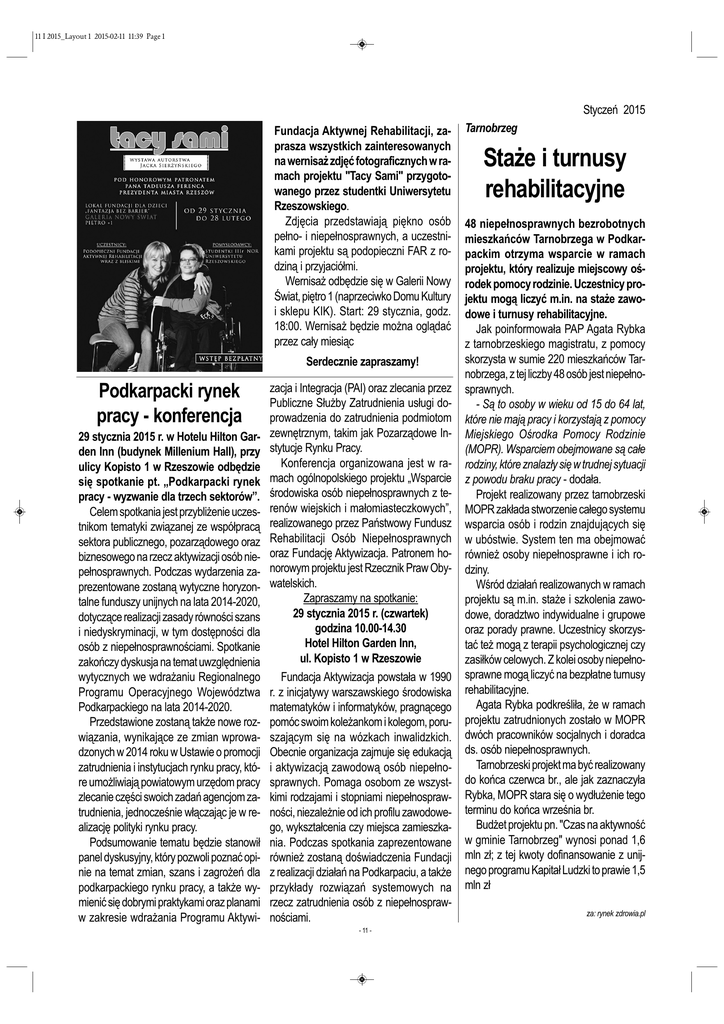 11 I 2015_Layout 1 2015-02-11 11:39 Page 1 Fundacja Aktywnej Rehabilitacji, zaprasza wszystkich zainteresowanych na wernisaż zdjęć fotograficznych w ramach projektu "Tacy Sami" przygotowanego przez studentki Uniwersytetu Rzeszowskiego. Zdjęcia przedstawiają piękno osób pełno- i niepełnosprawnych, a uczestnikami projektu są podopieczni FAR z rodziną i przyjaciółmi. Wernisaż odbędzie się w Galerii Nowy Świat, piętro 1 (naprzeciwko Domu Kultury i sklepu KIK). Start: 29 stycznia, godz. 18:00. Wernisaż będzie można oglądać przez cały miesiąc Podkarpacki rynek pracy - konferencja 29 stycznia 2015 r. w Hotelu Hilton Garden Inn (budynek Millenium Hall), przy ulicy Kopisto 1 w Rzeszowie odbędzie się spotkanie pt. „Podkarpacki rynek pracy - wyzwanie dla trzech sektorów”. Celem spotkania jest przybliżenie uczestnikom tematyki związanej ze współpracą sektora publicznego, pozarządowego oraz biznesowego na rzecz aktywizacji osób niepełnosprawnych. Podczas wydarzenia zaprezentowane zostaną wytyczne horyzontalne funduszy unijnych na lata 2014-2020, dotyczące realizacji zasady równości szans i niedyskryminacji, w tym dostępności dla osób z niepełnosprawnościami. Spotkanie zakończy dyskusja na temat uwzględnienia wytycznych we wdrażaniu Regionalnego Programu Operacyjnego Województwa Podkarpackiego na lata 2014-2020. Przedstawione zostaną także nowe rozwiązania, wynikające ze zmian wprowadzonych w 2014 roku w Ustawie o promocji zatrudnienia i instytucjach rynku pracy, które umożliwiają powiatowym urzędom pracy zlecanie części swoich zadań agencjom zatrudnienia, jednocześnie włączając je w realizację polityki rynku pracy. Podsumowanie tematu będzie stanowił panel dyskusyjny, który pozwoli poznać opinie na temat zmian, szans i zagrożeń dla podkarpackiego rynku pracy, a także wymienić się dobrymi praktykami oraz planami w zakresie wdrażania Programu Aktywi- Serdecznie zapraszamy! zacja i Integracja (PAI) oraz zlecania przez Publiczne Służby Zatrudnienia usługi doprowadzenia do zatrudnienia podmiotom zewnętrznym, takim jak Pozarządowe Instytucje Rynku Pracy. Konferencja organizowana jest w ramach ogólnopolskiego projektu „Wsparcie środowiska osób niepełnosprawnych z terenów wiejskich i małomiasteczkowych”, realizowanego przez Państwowy Fundusz Rehabilitacji Osób Niepełnosprawnych oraz Fundację Aktywizacja. Patronem honorowym projektu jest Rzecznik Praw Obywatelskich. Zapraszamy na spotkanie: 29 stycznia 2015 r. (czwartek) godzina 10.00-14.30 Hotel Hilton Garden Inn, ul. Kopisto 1 w Rzeszowie Fundacja Aktywizacja powstała w 1990 r. z inicjatywy warszawskiego środowiska matematyków i informatyków, pragnącego pomóc swoim koleżankom i kolegom, poruszającym się na wózkach inwalidzkich. Obecnie organizacja zajmuje się edukacją i aktywizacją zawodową osób niepełnosprawnych. Pomaga osobom ze wszystkimi rodzajami i stopniami niepełnosprawności, niezależnie od ich profilu zawodowego, wykształcenia czy miejsca zamieszkania. Podczas spotkania zaprezentowane również zostaną doświadczenia Fundacji z realizacji działań na Podkarpaciu, a także przykłady rozwiązań systemowych na rzecz zatrudnienia osób z niepełnosprawnościami. - 11 - Tarnobrzeg Styczeń 2015 Staże i turnusy rehabilitacyjne 48 niepełnosprawnych bezrobotnych mieszkańców Tarnobrzega w Podkarpackim otrzyma wsparcie w ramach projektu, który realizuje miejscowy ośrodek pomocy rodzinie. Uczestnicy projektu mogą liczyć m.in. na staże zawodowe i turnusy rehabilitacyjne. Jak poinformowała PAP Agata Rybka z tarnobrzeskiego magistratu, z pomocy skorzysta w sumie 220 mieszkańców Tarnobrzega, z tej liczby 48 osób jest niepełnosprawnych. - Są to osoby w wieku od 15 do 64 lat, które nie mają pracy i korzystają z pomocy Miejskiego Ośrodka Pomocy Rodzinie (MOPR). Wsparciem obejmowane są całe rodziny, które znalazły się w trudnej sytuacji z powodu braku pracy - dodała. Projekt realizowany przez tarnobrzeski MOPR zakłada stworzenie całego systemu wsparcia osób i rodzin znajdujących się w ubóstwie. System ten ma obejmować również osoby niepełnosprawne i ich rodziny. Wśród działań realizowanych w ramach projektu są m.in. staże i szkolenia zawodowe, doradztwo indywidualne i grupowe oraz porady prawne. Uczestnicy skorzystać też mogą z terapii psychologicznej czy zasiłków celowych. Z kolei osoby niepełnosprawne mogą liczyć na bezpłatne turnusy rehabilitacyjne. Agata Rybka podkreśliła, że w ramach projektu zatrudnionych zostało w MOPR dwóch pracowników socjalnych i doradca ds. osób niepełnosprawnych. Tarnobrzeski projekt ma być realizowany do końca czerwca br., ale jak zaznaczyła Rybka, MOPR stara się o wydłużenie tego terminu do końca września br. Budżet projektu pn. "Czas na aktywność w gminie Tarnobrzeg" wynosi ponad 1,6 mln zł; z tej kwoty dofinansowanie z unijnego programu Kapitał Ludzki to prawie 1,5 mln zł za: rynek zdrowia.pl