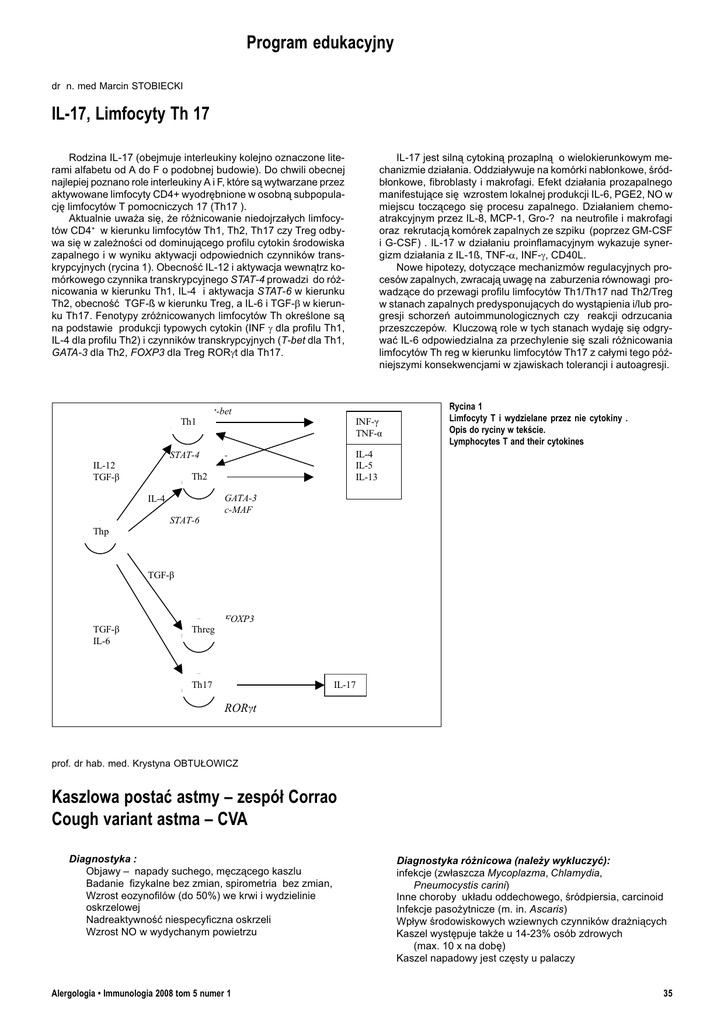 Program edukacyjny dr n. med Marcin STOBIECKI IL-17, Limfocyty Th 17 Rodzina IL-17 (obejmuje interleukiny kolejno oznaczone literami alfabetu od A do F o podobnej budowie). Do chwili obecnej najlepiej poznano role interleukiny A i F, które s¹ wytwarzane przez aktywowane limfocyty CD4+ wyodrêbnione w osobn¹ subpopulacjê limfocytów T pomocniczych 17 (Th17 ). Aktualnie uwa¿a siê, ¿e ró¿nicowanie niedojrza³ych limfocytów CD4+ w kierunku limfocytów Th1, Th2, Th17 czy Treg odbywa siê w zale¿noci od dominuj¹cego profilu cytokin rodowiska zapalnego i w wyniku aktywacji odpowiednich czynników transkrypcyjnych (rycina 1). Obecnoæ IL-12 i aktywacja wewn¹trz komórkowego czynnika transkrypcyjnego STAT-4 prowadzi do ró¿nicowania w kierunku Th1, IL-4 i aktywacja STAT-6 w kierunku Th2, obecnoæ TGF-ß w kierunku Treg, a IL-6 i TGF-b w kierunku Th17. Fenotypy zró¿nicowanych limfocytów Th okrelone s¹ na podstawie produkcji typowych cytokin (INF g dla profilu Th1, IL-4 dla profilu Th2) i czynników transkrypcyjnych (T-bet dla Th1, GATA-3 dla Th2, FOXP3 dla Treg RORgt dla Th17. Th1 t-bet STAT-4 IL-12 TGF-â Thp INF-ã TNF-á STAT-6 Rycina 1 Limfocyty T i wydzielane przez nie cytokiny . Opis do ryciny w tekcie. Lymphocytes T and their cytokines IL-4 IL-5 IL-13 - Th2 IL-4 IL-17 jest siln¹ cytokin¹ prozapln¹ o wielokierunkowym mechanizmie dzia³ania. Oddzia³ywuje na komórki nab³onkowe, ródb³onkowe, fibroblasty i makrofagi. Efekt dzia³ania prozapalnego manifestuj¹ce siê wzrostem lokalnej produkcji IL-6, PGE2, NO w miejscu tocz¹cego siê procesu zapalnego. Dzia³aniem chemoatrakcyjnym przez IL-8, MCP-1, Gro-? na neutrofile i makrofagi oraz rekrutacj¹ komórek zapalnych ze szpiku (poprzez GM-CSF i G-CSF) . IL-17 w dzia³aniu proinflamacyjnym wykazuje synergizm dzia³ania z IL-1ß, TNF-a, INF-g, CD40L. Nowe hipotezy, dotycz¹ce mechanizmów regulacyjnych procesów zapalnych, zwracaj¹ uwagê na zaburzenia równowagi prowadz¹ce do przewagi profilu limfocytów Th1/Th17 nad Th2/Treg w stanach zapalnych predysponuj¹cych do wyst¹pienia i/lub progresji schorzeñ autoimmunologicznych czy reakcji odrzucania przeszczepów. Kluczow¹ role w tych stanach wydajê siê odgrywaæ IL-6 odpowiedzialna za przechylenie siê szali ró¿nicowania limfocytów Th reg w kierunku limfocytów Th17 z ca³ymi tego póniejszymi konsekwencjami w zjawiskach tolerancji i autoagresji. GATA-3 c-MAF TGF-â TGF-â IL-6 Threg FOXP3 Th17 IL-17 RORãt prof. dr hab. med. Krystyna OBTU£OWICZ Kaszlowa postaæ astmy zespó³ Corrao Cough variant astma CVA Diagnostyka : Objawy napady suchego, mêcz¹cego kaszlu Badanie fizykalne bez zmian, spirometria bez zmian, Wzrost eozynofilów (do 50%) we krwi i wydzielinie oskrzelowej Nadreaktywnoæ niespecyficzna oskrzeli Wzrost NO w wydychanym powietrzu Alergologia Immunologia 2008 tom 5 numer 1 Diagnostyka ró¿nicowa (nale¿y wykluczyæ): infekcje (zw³aszcza Mycoplazma, Chlamydia, Pneumocystis carini) Inne choroby uk³adu oddechowego, ródpiersia, carcinoid Infekcje paso¿ytnicze (m. in. Ascaris) Wp³yw rodowiskowych wziewnych czynników dra¿ni¹cych Kaszel wystêpuje tak¿e u 14-23% osób zdrowych (max. 10 x na dobê) Kaszel napadowy jest czêsty u palaczy 35 Proponowane leczenie: Hamowanie odruchu kaszlu lignokaina, kodeina Hamowanie skurczu oskrzeli atropina, Berodual, Spiriva Rozszerzanie dróg oddechowych beta-mimetyki, teofilina Kortykosteroidowy aerozol (obni¿a wydzielanie NO i nadreaktywnoæ, zapobiega rozwojowi astmy u tych chorych co wystêpuje u 30% osób z CVA) Informacje dodatkowe: Rodzaj kaszlu: ostry do 3 tyg, podostry 3-8 tyg, przewlek³y > 8 tyg. Receptory kaszlowe jest ich 4 rodzaje: wolno adoptuj¹ce siê SAR szybko adoptuj¹ce siê RAR typu C i typu J Obecne s¹ w drogach oddechowych (max w p³ucach) op³ucnej, osierdziu, przeponie, otrzewnej, ¿o³¹dku, gardle i uchu zewnêtrznym ich pobudzenie powoduje kaszel Droga aferentna odruchu kaszlowego: ga³êzie nerwu b³êdnego, przepona, nerw trójdzielny, nerw jêzykowo-gard³owy orodek kaszlu: rdzeñ przed³u¿ony (³¹czy z orodkiem oddechowym i uk³adem nerwowym) Droga eferentna odruchu kaszlowego: jak aferentna oraz dodatkowo: miênie miêdzy¿ebrowe, mienie dróg oddechowych, gard³a i brzucha. Alergeny kontaktowe Nadtlenek benzoilu: Benzoil peroxide tak jak nadtlenek cyclohexamonu jest organicznym nadtlenkiem ³atwo ulegaj¹cym utlenianiu. Stosowany do utwardzania ¿ywic poliestrowych, do wybielania w³osów, tekstyliów, olei i maki dzia³a toksycznie, keratolitycznie, przeciwbakteryjnie Farby do w³osów: Hair dyes parafenylenodwuamina (czarna henna) g³ówny alergen mo¿na j¹ zast¹piæ przez: siarczan - paratoluenodwuaminy o-fenylenodwuaminê p-nitro-fenylenodwuaminê, p-nitroaminofenol dwie ostatnie substancje s¹ najs³absze jako alergeny dawaæ mo¿e reakcje krzy¿owe z in. substancjami para-, m.in. lekami znieczulaj¹cymi miejscowo, PAS, sulfonamidami; reakcja mo¿e wyst¹piæ przy pierwszym kontakcie Nadsiarczan amonu (ammonium persulphate) E 0306 stosowany we fryzjerstwie daje reakcje anafilaktyczne do testów p³atkowych stosujemy go w stê¿eniu 2,5% NH4]2S2O8 - polepszacz m¹ki [Hansen K., 1957, G.Thieme Verlag-Stuttgart, 205,226, 821] 36 Program edukacyjny
