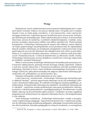 "Nowoczesne media w przestrzeniach edukacyjnych", pod red. Wojciecha Czerskiego i Rafała Wawera, Wydawnictwo UMCS, 2015 Wstęp Dynamiczny wzrost zainteresowania nowoczesnymi technologiami jest w ostatnich latach wyraźnie większy niż jeszcze dekadę temu. Związane jest to między innymi z tym, że różne grupy zawodowe, w tym nauczyciele, coraz częściej dostrzegają możliwości wspierania procesu kształcenia przez nowoczesne technologie informacyjno-komunikacyjne. Warte odnotowania jest również, że powszechnie stosowane, jeszcze do niedawna, w polskich szkołach komputery i rzutniki, zastępowane są między innymi przez tablety oraz tablice interaktywne. Wykorzystanie komputerów i technologii informacyjnych stanowi dla edukacji szansę odejścia od wąsko pojmowanego encyklopedyzmu (czyli przekazywania do zapamiętania dużych zasobów informacji), ku kształceniu umiejętności wykorzystywania wciąż pojawiających się nowych informacji lub odnajdowania tych, które są potrzebne. Dotyczy to większości dziedzin nauczania, zwłaszcza z zakresu nauk przyrodniczych i humanistycznych, w których kumulowane są olbrzymie zasoby wiedzy. Technologia informacyjna stwarza dodatkowe możliwości celowego żeglowania po źródłach i zasobach informacji1. Mimo iż nowoczesne technologie informacyjno-komunikacyjne przynoszą wiele korzyści edukacyjnych, generują również pewnego rodzaju zagrożenia. Jednym z nich jest szeroko opisywane w literaturze przedmiotu zjawisko przeładowania informacją. Zjawisko to bywa często skutkiem nieumiejętnego korzystania z technologii cyfrowych, gdzie pierwszorzędną rolę odgrywa operowanie informacją (pozyskiwanie ich, gromadzenie czy przetwarzanie, itp.). Niniejsza monografia została podzielona na trzy części. Część pierwsza, zatytułowana „Technologie informacyjno-komunikacyjne w edukacji szkolnej”, zawiera opracowania odnoszące się do roli technologii cyfrowych w przestrzeni edukacyjnej. W rozdziale otwierającym niniejszą publikację, zatytułowanym „Przygotowanie informatyczne studentów a kształcenie informatyczne w szkołach”, omówiona została problematyka nauczania przedmiotów informatycznych w szkołach gimnazjalnych i ponadgimnazjalnych. Przedstawione wyniki badań, odnoszą się do porównania opinii uczniów i studentów na temat zagadnień programowych realizowanych na zajęciach informatycznych z ich kompetencjami w tym zakresie. Autor kolejnego rozdziału pt. „Technologie informacyjne i media w przygotowaniu współczesnego pedagoga” zaprezentował historyczne i współczesne podejście do informatycznego kształcenia pedagogów, dokonując równocześnie porównania ofert kształcenia, kierunku pedagogika na różnych uczelniach, ze szczególnym 1 Sysło M. M.: Komputer w szkole, informatyka w szkole, XII Lublin, 11–14.IX. 1996. "Nowoczesne media w przestrzeniach edukacyjnych", pod red. Wojciecha Czerskiego i Rafała Wawera, Wydawnictwo UMCS, 2015 8 Wstęp uwzględnieniem mediów i technologii informacyjnych. Porównanie kultury medialnej adolescentów z procesem edukacji szkolnej jest tematem kolejnego rozdziału. Autorka, stawiając między innymi pytanie: czy dzisiejsza szkoła odpowiada współczesnym zapotrzebowaniom społecznym?, skupia się na zagadnieniu nadmiarowości informacyjnej oraz opisie komponentów kultury medialnej. Dalej w tekście synergicznie przedstawiony został raport z badań autorskich. Ostatni w tej części rozdział dotyczy podejścia do własnego „Ja” osób intensywnie korzystających z mediów. Na podstawie przeprowadzonych badań autor zauważa, że „nisko stechnicyzowana przestrzeń człowieka (z niewielką powszechnością mediów) sprzyja między innymi korzystnemu gospodarowaniu czasem, refleksji oraz świadomym wyborom życiowym”. Część drugą zatytułowaną „Nowoczesne technologie edukacyjne” otwiera rozdział przedstawiający obecne rozumienie multimediów oraz ich rolę w procesie kształcenia. W tekście podano również definicję fotografii dydaktycznej oraz jej miejsce w edukacji. Przedstawiono ponadto rolę fotografii z odniesieniem do zasad nauczania, jak również rodzaje i odmiany dydaktycznych zdjęć fotograficznych. Kolejny rozdział opisuje deklaracje i dokumenty Unii Europejskiej, programów świadczących o wadze, jaką przywiązuje się do transformacji ku ekonomii i społeczeństwu wiedzy. Zamieszczono rozważania, dotyczące kompetencji w globalizującym się świecie, koncentrującym się wokół kompetencji informacyjno-komunikacyjnych nauczycieli. Podkreślono powszechny obecnie dostęp młodych ludzi do informacji, jakie uzyskują dzięki Internetowi i innym mediom, stawiając współczesnego nauczyciela w innej, niespotykanej dotąd roli. Autorzy następnego rozdziału podnoszą zagadnienia najważniejszego etapu pracy logopedy – diagnozy logopedycznej. W podzielonym na dwie części tekście autorzy opisują zarówno teoretyczne podstawy prowadzenia tego etapu pracy z pacjentem, jak i praktyczne wskazówki. W drugiej części rozdziału zostały zaprezentowane dostępne na rynku multimedialne programy komputerowe, przeznaczone między innymi do prowadzenia diagnozy różnych rodzajów dysfunkcji. Trzecia część zatytułowana „Wyzwania dla technologii informacyjnej w edukacji” zawiera trzy rozdziały. Pierwszy rozdział dotyczy (nie)bezpiecznego wymiaru IT w edukacji. Autor podnosi bezpieczeństwo teleinformatyczne jako kwestie kluczowe we wszelkich zastosowaniach teleinformatyki. W tekście odnajdujemy wskazania, jak wielki wysiłek kładziony jest obecnie na informacyjne bezpieczeństwo w „usieciowionej” cywilizacji. Rozdział zatytułowany „Wykluczenie cyfrowe pokolenia 50+. Sprawozdanie z badań” dotyczy raportu z przeprowadzonych badań, skoncentrowanych na rozpoznaniu stopnia wykluczenia cyfrowego słuchaczy Uniwersytetu Trzeciego Wieku w czterech wymiarach: technologicznym, społecznym, kulturowym