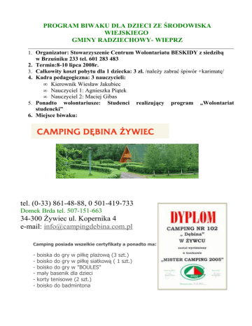 PROGRAM BIWAKU DLA DZIECI ZE ŚRODOWISKA WIEJSKIEGO GMINY RADZIECHOWY- WIEPRZ 1. Organizator: Stowarzyszenie Centrum Wolontariatu BESKIDY z siedzibą w Brzuśniku 233 tel. 601 283 483 Termin:8-10 lipca 2008r. Całkowity koszt pobytu dla 1 dziecka: 3 zł. /należy zabrać śpiwór +karimatę/ Kadra pedagogiczna: 3 nauczycieli: • Kierownik Wiesław Jakubiec • Nauczyciel 1: Agnieszka Piątek • Nauczyciel 2: Maciej Gibas Ponadto wolontariusze: Studenci realizujący program „Wolontariat studencki” Miejsce biwaku: 2. 3. 4. 5. 6. tel. (0-33) 861-48-88, 0 501-419-733 Domek Brda tel. 507-151-663 34-300 Żywiec ul. Kopernika 4 e-mail: [email protected] Camping posiada wszelkie certyfikaty a ponadto ma: - boiska do gry w piłkę plażową (3 szt.) boisko do gry w piłkę siatkową ( 1 szt.) boisko do gry w "BOULES" mały basenik dla dzieci korty tenisowe (2 szt.) boisko do badmintona Cele ogólne biwaku: - Świadome przestrzeganie poznanych zasad bhp – p.poż - wyrabianie wśród młodzieży postaw przyjaznych środowisku; - działania wychowawcze związane z kształtowaniem poczucia odpowiedzialności za zdrowie i bezpieczeństwo własne i innych; - integracja poprzez naukę, wypoczynek, zabawę; - poszerzanie wiedzy o funkcjonowaniu środowiska naturalnego; - rozbudzanie ciekawości poznawczej uczniów naszym regionem; - kształtowanie postawy szacunku dla dziedzictwa kulturowego; - wzmocnienie pozytywnego obrazu samego siebie; - prowadzenie zajęć edukacyjnych w warunkach pozaszkolnych; - aktywne spędzanie czasu na łonie natury; - efektywne współdziałanie w grupie; - nauka ważnych umiejętności życiowych: życzliwości, empatii, tolerancji i otwartości. Cele operacyjne: - znajomość i stosowanie poznanych zasad bezpieczeństwa w różnych sytuacjach; - lepsze poznanie naszego regionu wraz z jego fauną i florą; - poznanie zasad współżycia społecznego – wzajemna pomoc, asertywność, inne; - kształcenie nawyków higieny osobistej; - rozwijanie poczucia odpowiedzialności za swoje czyny i słowa; - nawiązywanie nowych znajomości; - znajomość i szacunek dla opiekunów oraz starszych, umiejętność odpowiedniego zachowania w zależności od miejsca i sytuacji (savoir vivre); Metody i formy pracy z dziećmi: - oparte na słowie (pogadanka, opowiadanie); - oparte na obserwacji (pokaz, demonstracja); - oparte na działaniu (zajęcia integracyjne grupy, działania twórcze, dokumentowanie); - aktywizujące (wycieczki, zajęcia w terenie, dyskusja, projekt) RAMOWY PROGRAM BIWAKU Data Dzień projektu 08.07.08 I 09.07.08 II 10.07.08 III Dzień tygodnia Przedpołudnie Popołudnie i wieczór 8:00 - Zbiórka dzieci przed budynkiem LKS, 8:20 – Wyjazd na Camping 8:50 - Przyjazd, zakwaterowanie młodzieży. Omówienie regulaminu Campingu DĘBINA – w tym przepisów dotyczących bezpiecznego pobytu (bhp/p.poż.) 9:30 - Zajęcia integracyjne – 13:00 - Obiad /catering/ 14:00 – Prezentacja regionu: „fauna i flora Beskidów” 15:00 - Zajęcia sportowe. 18:00 Przygotowanie do wspólnej kolacji. wtorek Kolacja /grill/ 19:00 - Wieczorek pogodny / każda grupa przygotowuje oryginalny program/ prowadzą studenciwolontariusze w ramach 21:00 - Toaleta wieczorna własnych autorskich programów 21:30 - Nocleg w namiotach zajęć animacyjnych. 11:00 – podwieczorek /owoce/ 13:00 - Obiad /catering/ 14:00 - Nauka piosenek 7:30 - Pobudka turystycznych 8:00 - 8:30 - Toaleta 16:00 - Wyjście na górę 8:30 -9:00 - Wspólne ( w 3 Grojec - pogadanka grupach) przygotowanie 18:30 - Przygotowanie do śniadania. Śniadanie. środa kolacji, wspólna kolacja 9:30 - Zajęcia interdyscyplinarne /ognisko/ ze studentami (realizacja 20:00 - Wieczorek pogodny / projektu z pomysłem – autorski program zajęć opracowany przez każda grupa przygotowuje oryginalny program/ studentów-wolontariuszy. 21:30 - Toaleta wieczorna 11:00 – podwieczorek /owoce/ 22:00 - Nocleg w namiotach Opcja 1: w razie ładnej pogody – przejście 7:30 - Pobudka spacerem z Żywca przez 8:00 - 8:30 - Toaleta Grojec do Wieprza /po 8:30 -9:00 - Wspólne ( w 3 drodze dzieci zjedzą suchy grupach) przygotowanie prowiant, odbędą się śniadania. Śniadanie. pogadanki, zabawy/ 9:30 - Zajęcia interdyscyplinarne ZAKOŃCZENIE BIWAKU ze studentami (realizacja ok. 17:00 przed budynkiem czwartek projektu z pomysłem – autorski program zajęć opracowany przez LKS w Wieprzu studentów-wolontariuszy. 11:00 – podwieczorek /słodycze/ 11:30 – pakowanie /zwijanie namiotów, sprzątanie, inne/ 12:00 - Ewaluacja zajęć; Opcja 2: w razie złej pogody - powrót do Wieprza autokarem. ZAKOŃCZENIE BIWAKU ok. 14:00 przed budynkiem LKS w Wieprzu. ZGODA RODZICÓW/PRAWNYCH OPIEKUNÓW UCZNIA Imię i nazwisko …………………………….…………. ………………., dnia …..lipca 2008r. Adres zamieszkania……………………………………. Telefon:………………………………………………… Do Prezesa Stowarzyszenia Centrum Wolontariatu BESKIDY Wiesława Jakubca Wyrażam zgodę na udział mojego dziecka …………………………………………………………… w zajęciach rekreacyjno – sportowych podczas biwaku w Campingu Dębina w Żywcu ul. Kopernika 4, w dniach od 8 lipca do 10 lipca br. organizowanych przez Centrum Wolontariatu BESKIDY z siedzibą w Brzuśniku 233 oraz studentów-wolontariuszy, realizujących projekty wakacyjne w Gimnazjum Publicznym nr2 w Wieprzu ramach piątej edycji programu „Wakacje z pomysłem 2008”. ………………………………….. Podpis