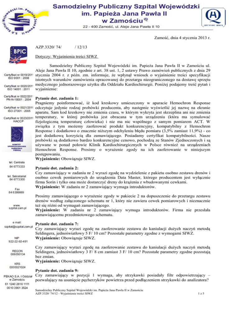 Zamość, dnia 4 stycznia 2013 r. AZP.3320/ 74/ / 12/13 Dotyczy: Wyjaśnienia treści SIWZ Samodzielny Publiczny Szpital Wojewódzki im. Papieża Jana Pawła II w Zamościu ul. Aleje Jana Pawła II 10, zgodnie z art. 38 ust. 1, 2 ustawy Prawo zamówień publicznych z dnia 29 stycznia 2004 r. z późn. zm. informuje, że wpłynął wniosek o wyjaśnienie treści specyfikacji istotnych warunków zamówienia opracowanej do przetargu nieograniczonego na dostawę sprzętu medycznego jednorazowego użytku dla Oddziału Kardiochirurgii. Poniżej podajemy treść pytań i wyjaśnienie: Pytanie dot. zadania 1: Pragniemy poinformować, iż kod kreskowy umieszczony w aparacie Hemochron Response odczytuje jedynie rodzaj probówki producenta, aby następnie wyświetlić jej nazwę na ekranie aparatu. Sam kod kreskowy nie zmienia czasu, w którym wykryta jest skrzeplina ani nie zmienia temperatury, w której probówka jest obracana w tym urządzeniu (która ma symulować fizjologiczną temperaturę człowieka) i nie ma nic wspólnego z samym pomiarem ACT. W związku z tym możemy zaoferować produkt konkurencyjny, kompatybilny z Hemochron Response i dodatkowo o znacznie niższym odchyleniu błędu pomiaru (3,5% zamiast 11,9%) - co jest dodatkową korzyścią dla zamawiającego. Posiadamy certyfikat kompatybilności. Nasze probówki są dodatkowo bardzo konkurencyjne cenowo, pochodzą ze Stanów Zjednoczonych i są używane w ponad połowie Klinik Kardiochirurgicznych w Polsce również na urządzeniach Hemochron Response. Prosimy o wyrażenie zgody na ich zaoferowanie w niniejszym postępowaniu. Wyjaśnienie: Obowiązuje SIWZ. Pytanie dot. zadania 2: Czy zamawiający w zadaniu nr 2 wyrazi zgodę na wydzielenie z pakietu osobno zestawu drenów i osobno cewek pomiarowych do urządzenia Data Master, którego producentem jest wyłącznie firma Sorin i tylko ona może dostarczyć dreny do krążenia z wbudowanymi cewkami. Wyjaśnienie: W zadaniu nr 2 zamawiający wymaga introduktorów. Prosimy zamawiającego o wyrażenie zgody w pakiecie 2 na dopuszczenie do przetargu zestawu drenów według załączonego schematu nr 1, który nie zawiera cewek pomiarowych i nieznacznie też się różni od wymagań zamawiającego. Wyjaśnienie: W zadaniu nr 2 zamawiający wymaga introduktorów. Firma nie przesłała zamawiającemu przedmiotowego schematu. Pytanie dot. zadania 7: Czy zamawiający wyrazi zgodę na zaoferowanie zestawu do kaniulacji dużych naczyń metodą Seldingera, jednoświatłowy 5 F/ 10 cm? Pozostałe parametry zgodne z wymogami SIWZ. Wyjaśnienie: Obowiązuje SIWZ. Czy zamawiający wyrazi zgodę na zaoferowanie zestawu do kaniulacji dużych naczyń metodą Seldingera, jednoświatłowy 3 F/ 8 cm zamiast 3 F/ 10 cm? Pozostałe parametry zgodne pozostają bez zmian. Wyjaśnienie: Obowiązuje SIWZ. Pytanie dot. zadania 9: Czy zamawiający w pozycji 1 wymaga, aby strzykawki posiadały filtr odpowietrzający – pozwalający na usunięcie pęcherzyków powietrza przed podłączeniem strzykawki do analizatora? Samodzielny Publiczny Szpital Wojewódzki im. Papieża Jana Pawła II w Zamościu AZP.3320/ 74/12 - Wyjaśnienie treści SIWZ 1z5 Wyjaśnienie: Zamawiający nie wymaga filtru odpowietrzającego. Pytanie dot. zadania 10: Prosimy o wyjaśnienie czy zamawiający oczekuje linii pojedynczych czy podwójnych? Wyjaśnienie: Zamawiający oczekuje linii pojedynczych. Czy zamawiający dopuści do przetargu system do monitorowania ciśnienia z wielorazowym przetwornikiem umieszczonym na płytce, który łączy się z kardiomonitorem za pomocą kabla interfejsowego zakończonego pinami lub otworami (w zależności od typu monitora)? Linie jednorazowe w tym systemie są połączone z przetwornikiem bez użycia kabli. Wyjaśnienie: Zamawiający nie dopuszcza linii z wielorazowym przetwornikiem. Pytanie dot. zadania 13 poz. 1: Czy zamawiający dopuści do zaoferowania elektrody bierne jednorazowego użytku pokryte wysokiej jakości hydrożelem prowadzącym, który gwarantuje prawidłowe przyleganie do ciała pacjenta przez cały czas trwania zabiegu, dzielone, powierzchnia przewodzenia: 110 cm², powierzchnia całkowita: 170 cm², wymiary 122 mm x 176 mm, kompatybilne z diatermią Valleylab Force FX? Prosimy o dopuszczenie do zaoferowania ilości 750 szt. tj. pełnych opakowań zbiorczych. Wyjaśnienie: Obowiązuje SIWZ. Zamawiający dopuszcza zaoferowanie pełnych opakowań zbiorczych pod warunkiem, że zostanie wyceniona ilość zapotrzebowana w SIWZ. Pytanie dot. zadania 15: W celu zaoferowania produktu w nowej, lepszej wersji od tego samego producenta (niż obecnie oferowanego zamawiającemu w ramach postępowania przetargowego), prosimy o dopuszczenie również igły sercowej 27 mm (wymagane 26 mm, które posiada starszy model) o wszystkich pozostałych parametrach z SIWZ. Wyjaśnienie: Tak, zamawiający dopuszcza długość 27 mm. Pytanie dot. zadania 16: Czy zamawiający w trosce o uczciwą konkurencję dopuści system równoważny do opisanego w SIWZ, pod warunkiem bezpłatnego użyczenia na czas trwania umowy niezbędnej ilości kanistrów i mocowników? System nasz charakteryzuje się łatwością i bezpieczeństwem użytkowania. Wkłady posiadają w pokrywie jedynie 2 króćce (pacjent, próżnia) o różnej średnicy, co uniemożliwia mylne podłączenia drenów. Każdy wkład wyposażony jest w filtr hydrofobowy i antybakteryjny. Dwa uchwyty wkładu w formie pętli znacznie ułatwiającej demontaż. Wkłady nie posiadają otworów do pobierania próbek. Wkłady kompatybilne są ze stelażami jezdnymi u wskazaniami w SIWZ. Wyjaśnienie: Obowiązuje SIWZ. Czy zamawiający wymaga aby każdy wkład posiadał nadrukowaną datę ważności na każdym wkładzie co jest uwarunkowane datą przydatności i skuteczności filtra antybakteryjnego i hydrofobowego? Wyjaśnienie: Obowiązuje SIWZ. Czy zamawiający wymaga aby każdy wkład posiadał dwa króćce o różnej średnicy co zapobiega mylnemu podłączeniu dre