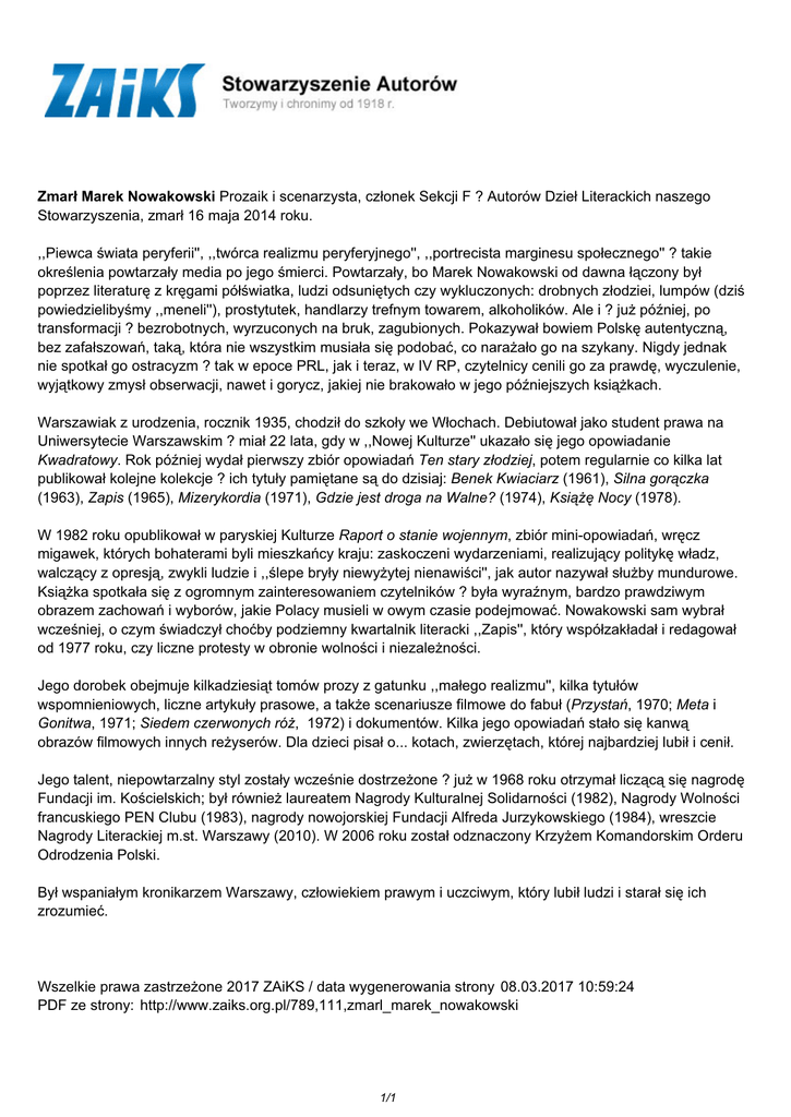 Zmarł Marek Nowakowski Prozaik i scenarzysta, członek Sekcji F ? Autorów Dzieł Literackich naszego Stowarzyszenia, zmarł 16 maja 2014 roku. ,,Piewca świata peryferii'', ,,twórca realizmu peryferyjnego'', ,,portrecista marginesu społecznego'' ? takie określenia powtarzały media po jego śmierci. Powtarzały, bo Marek Nowakowski od dawna łączony był poprzez literaturę z kręgami półświatka, ludzi odsuniętych czy wykluczonych: drobnych złodziei, lumpów (dziś powiedzielibyśmy ,,meneli''), prostytutek, handlarzy trefnym towarem, alkoholików. Ale i ? już później, po transformacji ? bezrobotnych, wyrzuconych na bruk, zagubionych. Pokazywał bowiem Polskę autentyczną, bez zafałszowań, taką, która nie wszystkim musiała się podobać, co narażało go na szykany. Nigdy jednak nie spotkał go ostracyzm ? tak w epoce PRL, jak i teraz, w IV RP, czytelnicy cenili go za prawdę, wyczulenie, wyjątkowy zmysł obserwacji, nawet i gorycz, jakiej nie brakowało w jego późniejszych książkach. Warszawiak z urodzenia, rocznik 1935, chodził do szkoły we Włochach. Debiutował jako student prawa na Uniwersytecie Warszawskim ? miał 22 lata, gdy w ,,Nowej Kulturze'' ukazało się jego opowiadanie Kwadratowy. Rok później wydał pierwszy zbiór opowiadań Ten stary złodziej, potem regularnie co kilka lat publikował kolejne kolekcje ? ich tytuły pamiętane są do dzisiaj: Benek Kwiaciarz (1961), Silna gorączka (1963), Zapis (1965), Mizerykordia (1971), Gdzie jest droga na Walne? (1974), Książę Nocy (1978). W 1982 roku opublikował w paryskiej Kulturze Raport o stanie wojennym, zbiór mini-opowiadań, wręcz migawek, których bohaterami byli mieszkańcy kraju: zaskoczeni wydarzeniami, realizujący politykę władz, walczący z opresją, zwykli ludzie i ,,ślepe bryły niewyżytej nienawiści'', jak autor nazywał służby mundurowe. Książka spotkała się z ogromnym zainteresowaniem czytelników ? była wyraźnym, bardzo prawdziwym obrazem zachowań i wyborów, jakie Polacy musieli w owym czasie podejmować. Nowakowski sam wybrał wcześniej, o czym świadczył choćby podziemny kwartalnik literacki ,,Zapis'', który współzakładał i redagował od 1977 roku, czy liczne protesty w obronie wolności i niezależności. Jego dorobek obejmuje kilkadziesiąt tomów prozy z gatunku ,,małego realizmu'', kilka tytułów wspomnieniowych, liczne artykuły prasowe, a także scenariusze filmowe do fabuł (Przystań, 1970; Meta i Gonitwa, 1971; Siedem czerwonych róż, 1972) i dokumentów. Kilka jego opowiadań stało się kanwą obrazów filmowych innych reżyserów. Dla dzieci pisał o... kotach, zwierzętach, której najbardziej lubił i cenił. Jego talent, niepowtarzalny styl zostały wcześnie dostrzeżone ? już w 1968 roku otrzymał liczącą się nagrodę Fundacji im. Kościelskich; był również laureatem Nagrody Kulturalnej Solidarności (1982), Nagrody Wolności francuskiego PEN Clubu (1983), nagrody nowojorskiej Fundacji Alfreda Jurzykowskiego (1984), wreszcie Nagrody Literackiej m.st. Warszawy (2010). W 2006 roku został odznaczony Krzyżem Komandorskim Orderu Odrodzenia Polski. Był wspaniałym kronikarzem Warszawy, człowiekiem prawym i uczciwym, który lubił ludzi i starał się ich zrozumieć. Wszelkie prawa zastrzeżone 2017 ZAiKS / data wygenerowania strony 08.03.2017 10:59:24 PDF ze strony: http://www.zaiks.org.pl/789,111,zmarl_marek_nowakowski 1/1