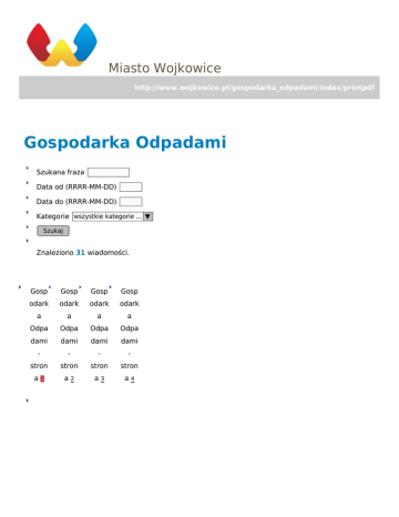 Miasto Wojkowice http://www.wojkowice.pl/gospodarka_odpadami/index/printpdf Gospodarka Odpadami Szukana fraza Data od (RRRR-MM-DD) Data do (RRRR-MM-DD) Kategorie wszystkie kategorie ... ▼ Szukaj Znaleziono 31 wiadomości. Gosp Gosp Gosp Gosp odark odark odark odark a a a a Odpa Odpa Odpa Odpa dami dami dami dami - - - - stron stron stron stron a1 a2 a3 a4 2016-06-30 kategoria: Stacjonarny Punkt Selektywnego Zbierania Odpadów Komunalnych Odpady Od 1 lipca 2016 roku właściciele nieruchomości zamieszkałych położonych na terenie Gminy Wojkowice mogą pozbywać się odpadów zbieranych selektywnie oddając je do stacjonarnego Punktu Selektywnego Zbierania Odpadów znajdującego się w Piekarach Śląskich przy ul. Kotuchy 3. 2016-04-26 ANALIZA STANU GOSPODARKI ODPADAMI KOMUNALNYMI ZA 2015 ROK DLA GMINY WOJKOWICE Cel i podstawowe założenia opracowania analizy stanu gospodarki odpadami. kategoria: Odpady 2015-07-27 ANALIZA STANU GOSPODARKI ODPADAMI KOMUNALNYMI kategoria: Odpady ZA 2014 ROK DLA GMINY WOJKOWICE 2015-07-27 Wykaz przedsiębiorców odbierających zużyty sprzęt elektryczny i elektroniczny na terenie Gminy Wojkowice z gospodarstw domowych kategoria: Odpady Na terenie gminy Wojkowice zużyty sprzęt elektryczny i elektroniczny z nieruchomości zamieszkałych objętych przez gminę zorganizowanym odbiorem odpadów odbierany jest przez PZOM Strach Spółka z o.o. Spółka komandytowa z siedzibą: 42-274 Konopiska, ul. Przemysłowa 7, zgodnie z harmonogramem odbioru odpadów. 2015-07-27 kategoria: Lokalizacja punktów selektywnej zbiórki Odpady Lokalizacja punktów selektywnej zbiórki baterii i akumulatorów małogabarytowych 2015-07-27 Miejsca zagospodarowania przez podmioty odbierające odpady komunalne w 2015 roku kategoria: Odpady Miejsca zagospodarowania przez podmioty odbierające odpady komunalne od właścicieli nieruchomości z tereny gminy Wojkowice zmieszanych odpadów komunalnych, odpadów zielonych oraz pozostałości z sortowania odpadów komunalnych przeznaczonych do składowania w 2015r. 2015-07-27 Informacja o osiągniętych przez Gminę Wojkowice wymaganych poziomach recyklingu, przygotowania do ponownego użycia i odzysku innymi metodami oraz ograniczenia masy odpadów ulegających biodegradacji przekazanych do składowania. kategoria: Odpady Osiągnięty w 2012r. poziom ograniczenia masy odpadów komunalnych ulegających biodegradacji przekazanych na składowisko – 0% Osiągnięty w 2013r. poziom ograniczenia masy odpadów komunalnych ulegających biodegradacji przekazanych na składowisko – 0,13% 2014-10-23 Przypomnienie o zmianie sposobu odbioru od właścicieli nieruchomości zamieszkałych odpadów niebezpiecznych kategoria: Odpady Odpady niebezpieczne w postaci chemikaliów, w tym farb, rozpuszczalników, odpadowych olejów oraz drobnego sprzętu elektrycznego i elektronicznego, powstające na danej nieruchomości zamieszkałej nie będą odbierane tak jak do tej pory sprzed nieruchomości, zbiórka tych odpadów będzie się odbywała poprzez tzw. 2014-08-04 Informacje o efektach kontroli gospodarki nieczystościami ciekłymi kategoria: Odpady Informujemy, że przeprowadzone dotychczas kontrole właścicieli nieruchomości w zakresie prowadzonej gospodarki nieczystościami ciekłymi oraz działania informacyjne i edukacyjne, w tym zakresie wpłynęły na zwiększenie ilości ścieków dowożonych do oczyszczalni. 2014-07-02 Informacja dotycząca odbioru odpadów komunalnych i harmonogramów kategoria: Odpady W związku z otrzymywanymi interwencjami, dotyczącymi harmonogramów odbioru odpadów komunalnych - dostarczonych przez nowego przedsiębiorcę (Prywatny Zakład Oczyszczania Miasta Waldemar Strach) w pierwszych dniach wymiany pojemników na ulicach: Gosp Gosp Gosp Gosp odark odark odark odark a a a a Odpa Odpa Odpa Odpa dami dami dami dami - - - - stron stron stron stron a1 a2 a3 a4