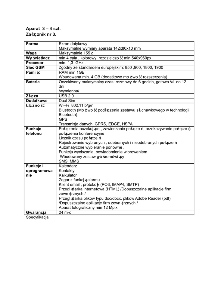 Aparat 3 – 4 szt. Za łącznik nr 3. Forma Waga Wy świetlacz Procesor Siec GSM Pami ęć Bateria Z łącza Dodatkowe Łąc zno ść Funkcje telefonu Funkcje i oprogramowa nie Gwarancja Specyfikacja Ekran dotykowy Maksymalne wymiary aparatu 142x80x10 mm Maksymalnie 155 g min.4 cala , kolorowy rozdzielczo ść min 540x960px min. 1,3 GHz , Zgodny ze standardem europejskim: 850 ,900, 1800, 1900 RAM min 1GB Wbudowana min. 4 GB (dodatkowo mo żliwo ść rozszerzenia) Oczekiwany maksymalny czas: rozmowy do 6 godzin, gotowo ści do 12 dni /wymienna/ USB 2.0 Dual Sim Wi–Fi 802.11 b/g/n Bluetooth (Mo żliwo ść pod łączenia zestawu s łuchawkowego w technologii Bluetooth) GPS Transmisja danych: GPRS, EDGE, HSPA Po łączenia oczekuj ące , zawieszanie po łącze ń, przekazywanie po łącze ń, po łączenia konferencyjne Licznik czasu po łącze ń Rejestrowanie wybranych , odebranych i nieodebranych po łącze ń Automatyczne wybieranie ponowne , Funkcja wyciszania, powiadomienie wibrowaniem Wbudowany zestaw g ło śnomówi ący SMS, MMS Kalendarz Kontakty Kalkulator Zegar z funkcj ą alarmu Klient email , protoko ły (PO3, IMAP4, SMTP) Przegl ądarka internetowa (HTML) /Dopuszczalne aplikacje firm zewn ętrznych / Przegl ądarka plików typu doc/docx, plików Adobe Reader (pdf) /Dopuszczalne aplikacje firm zewn ętrznych / Aparat fotograficzny min 12 Mpix. 24 m-c