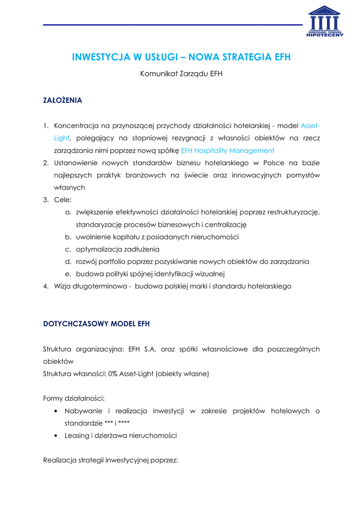 INWESTYCJA W USŁUGI – NOWA STRATEGIA EFH Komunikat Zarządu EFH ZAŁOŻENIA 1. Koncentracja oncentracja na przynoszącej przychody działalności hotelarskiej - model AssetLight,, polegający na stopniowej rezygnacji z własności obiektów na rzecz zarządzania nimi poprzez nową spółkę EFH Hospitality Management 2. Ustanowienie nowych standardów biznesu hotelarskiego w Polsce na bazie najlepszych praktyk branżowych na świecie oraz innowacyjnych pomysłów własnych 3. Cele: a. zwiększenie efektywności działalności hotelarskiej poprzez restrukturyzację, standaryzację ę procesów biznesowych i centralizację b. uwolnienie kapitału z posiadanych nieruchomości c. optymalizacja zadłużenia d. rozwój ozwój portfolio poprzez pozyskiwanie nowych obiektów któw do zarządzania e. budowa polityki spójnej identyfikacji wizualnej 4. Wizja długoterminowa - budowa polskiej marki i standardu hotelarskiego DOTYCHCZASOWY MODEL EFH Struktura organizacyjna: EFH S.A. oraz spółki s własnościowe dla poszczególnych obiektów Asset (obiekty własne) Struktura własności:: 0% Asset-Light Formy działalności: • Nabywanie i realizacja inwestycji w zakresie projektów hotelowych o standardzie *** i **** • Leasing i dzierżawa nieruchomości Realizacja strategii inwestycyjnej poprzez: - Nabywanie gotowych go obiektów - Przygotowanie obiektów inwestycyjnych do realizacji - Nabywanie i przygotowanie do realizacji inwestycji inwestycji biurowych Główne czynniki wpływu na dotychczasowe wyniki: • wzrost wartości portfela nieruchomości • koszty finansowania zewnętrznego NOWY MODEL EFH • Koncentracja na kluczowych kompetencjach hotelarskich – powołanie EFH Hospitality Management • Pozyskiwanie nowych hoteli do zarządzania • Podążanie za światowymi wiatowymi trendami - strategia Asset-Light • Uwolnienie kapitału ze spieniężenia własnych włas nieruchomości • Optymalizacja cja zadłużenia oraz kosztów finansowych Sposoby realizacji: • Maksymalizacja przychodów - Zwiększenie obłożenia i wykorzystania pełnego potencjału hoteli, łącznie z działalnością gastronomiczną poprzez centralizację sprzedaży i marketingu - Profesjonalne zarządzanie polityką cenową – stworzenie sieci obiektów zarządzanych wspólnie • Redukcja kosztów osobowych oraz eksploatacyjnych poprzez centralizację zakupów i standaryzację procedur operacyjnych • Optymalizacja ptymalizacja kosztów operacyjnych poprzez centralizację procedur biznesowych i wspólne zarządzanie w obszarach • - sprzedaży - systemu rezerwacji - kadr - księgowości - zakupów – wykorzystanie efektu skali Odejście od własności na rzecz zarządzania operacyjnego operacyjneg DOTYCHCZASOWE E DZIAŁANIA PODJĘTE W RAMACH ZMIANY MODELU BIZNESOWEGO • Powołanie EFH Hospitality Managemen Management - rozpoczęcie działań centralizacyjnych • Znacząca redukcja kosztów osobowych w hotelach w celu elastycznego dopasowania kosztów ztów do cyklicznych przychodów z działalności hotelarskiej • Opracowanie polityki cenowej oraz zarządzania ceną • Wymiana kadry zarządczej na poziomie hoteli • Rozbudowa zespołu operacyjnego w Centrali – pozyskanie specjalistów NOWA STRATEGIA EFH to: • Silniejsza marka – zaufanie Inwestorów i Gości • Szansa na biznesową ekspansję • Optymalizacja portfela nieruchomości Grupy Szczegółowy dokument zawierający prezentację Strategii EFH będzie do pobrania ze strony www.efh.com.pl w ciągu kilku dni. dni