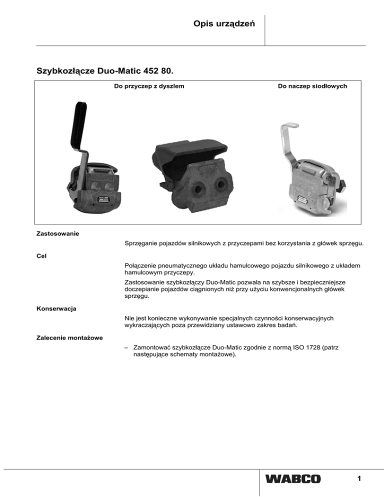 Opis urządzeń Szybkozłącze Duo-Matic 452 80. Do przyczep z dyszlem Do naczep siodłowych Zastosowanie Sprzęganie pojazdów silnikowych z przyczepami bez korzystania z główek sprzęgu. Cel Połączenie pneumatycznego układu hamulcowego pojazdu silnikowego z układem hamulcowym przyczepy. Zastosowanie szybkozłączy Duo-Matic pozwala na szybsze i bezpieczniejsze doczepianie pojazdów ciągnionych niż przy użyciu konwencjonalnych główek sprzęgu. Konserwacja Nie jest konieczne wykonywanie specjalnych czynności konserwacyjnych wykraczających poza przewidziany ustawowo zakres badań. Zalecenie montażowe – Zamontować szybkozłącze Duo-Matic zgodnie z normą ISO 1728 (patrz następujące schematy montażowe). 1 Opis urządzeń Schematy montażowe Do przyczep z dyszlem Do naczep siodłowych 2 Opis urządzeń Wymiary montażowe Do przyczep z dyszlem Przyłącza 1 Dopływ energii Legenda 4 Przyłącze sterowania A Część pojazdu silnikowego B Część przyczepy z dyszlem 3 Opis urządzeń Do naczep siodłowych Przyłącza Legenda 1 Dopływ energii 4 Przyłącze sterowania A B Część pojazdu silnikowego Część naczepy siodłowej Dane techniczne Do przyczep z dyszlem Numer katalogowy 452 802 009 0 Część pojazdu silnikowego Szybkozłącze 452 804 012 0 Część przyczepy z dyszlem Do naczep siodłowych 452 803 0050 Część naczepy siodłowej Nie 452 805 004 0 Część pojazdu silnikowego 452 802 007 0 Część naczepy siodłowej Nie Tak Maks. ciśnienie robocze 10 bar 10 bar Średnica nominalna 9 mm 9 mm powietrze powietrze -40 °C do +80 °C -40 °C do +80 °C Dopuszczalne medium Zakres temperatur Ciężar 4 1,0 kg 0,2 kg 1,0 kg 452 803 004 0 Część pojazdu silnikowego 0,3 kg 1,08 kg 1,17 kg Opis urządzeń Zasada działania W celu sprzęgnięcia przyczepy z dyszlem uchwyt ręczny (b) jest wciskany w dół, przy czym następuje otwarcie pokryw ochronnych (a i d). Część Duo-Matic przyczepy zostaje wprowadzona pod pokrywy ochronne, a uchwyt ręczny (b) zostaje ponownie zwolniony. Sprężyna skręcana (e) oddziaływuje na pokrywy ochronne (a i d) i dociska część przyczepy do automatycznych zaworów zamykających (c), przy czym następuje ich otwarcie, a występujące sprężone powietrze przedostaje się do przyczepy. W trakcie sprzęgania naczepy siodłowej uchwyt ręczny (b) jest wciskany w dół, przy czym następuje otwarcie pokryw ochronnych (a i d). Część Duo-Matic pojazdu silnikowego zostaje wprowadzona pod pokrywy ochronne, a uchwyt ręczny (b) zostaje ponownie zwolniony. Sprężyna skręcana (e) oddziaływuje na pokrywy ochronne (a i d) i dociska część pojazdu silnikowego do powierzchni stykowej. Automatyczne zawory odcinające (c) otwierają się, a sprężone powietrze przedostaje się do naczepy siodłowej. 5