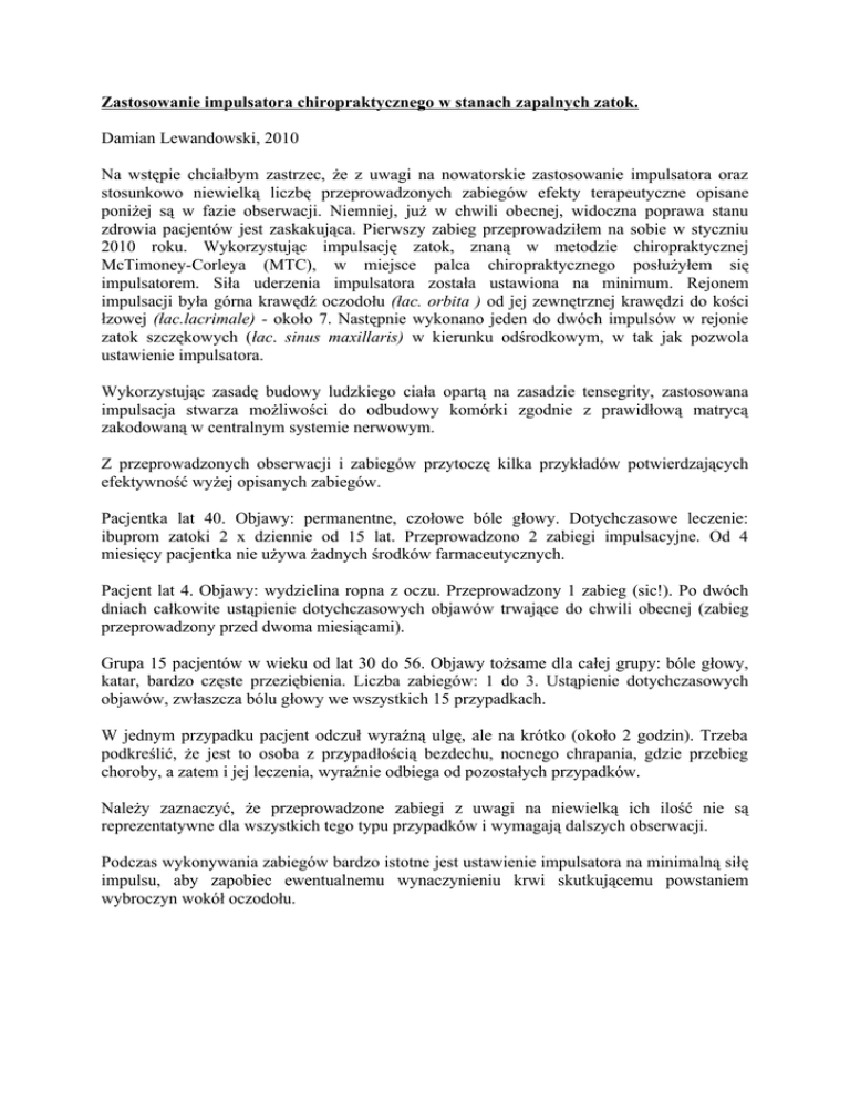 Zastosowanie impulsatora chiropraktycznego w stanach zapalnych zatok. Damian Lewandowski, 2010 Na wstępie chciałbym zastrzec, że z uwagi na nowatorskie zastosowanie impulsatora oraz stosunkowo niewielką liczbę przeprowadzonych zabiegów efekty terapeutyczne opisane poniżej są w fazie obserwacji. Niemniej, już w chwili obecnej, widoczna poprawa stanu zdrowia pacjentów jest zaskakująca. Pierwszy zabieg przeprowadziłem na sobie w styczniu 2010 roku. Wykorzystując impulsację zatok, znaną w metodzie chiropraktycznej McTimoney-Corleya (MTC), w miejsce palca chiropraktycznego posłużyłem się impulsatorem. Siła uderzenia impulsatora została ustawiona na minimum. Rejonem impulsacji była górna krawędź oczodołu (łac. orbita ) od jej zewnętrznej krawędzi do kości łzowej (łac.lacrimale) - około 7. Następnie wykonano jeden do dwóch impulsów w rejonie zatok szczękowych (łac. sinus maxillaris) w kierunku odśrodkowym, w tak jak pozwola ustawienie impulsatora. Wykorzystując zasadę budowy ludzkiego ciała opartą na zasadzie tensegrity, zastosowana impulsacja stwarza możliwości do odbudowy komórki zgodnie z prawidłową matrycą zakodowaną w centralnym systemie nerwowym. Z przeprowadzonych obserwacji i zabiegów przytoczę kilka przykładów potwierdzających efektywność wyżej opisanych zabiegów. Pacjentka lat 40. Objawy: permanentne, czołowe bóle głowy. Dotychczasowe leczenie: ibuprom zatoki 2 x dziennie od 15 lat. Przeprowadzono 2 zabiegi impulsacyjne. Od 4 miesięcy pacjentka nie używa żadnych środków farmaceutycznych. Pacjent lat 4. Objawy: wydzielina ropna z oczu. Przeprowadzony 1 zabieg (sic!). Po dwóch dniach całkowite ustąpienie dotychczasowych objawów trwające do chwili obecnej (zabieg przeprowadzony przed dwoma miesiącami). Grupa 15 pacjentów w wieku od lat 30 do 56. Objawy tożsame dla całej grupy: bóle głowy, katar, bardzo częste przeziębienia. Liczba zabiegów: 1 do 3. Ustąpienie dotychczasowych objawów, zwłaszcza bólu głowy we wszystkich 15 przypadkach. W jednym przypadku pacjent odczuł wyraźną ulgę, ale na krótko (około 2 godzin). Trzeba podkreślić, że jest to osoba z przypadłością bezdechu, nocnego chrapania, gdzie przebieg choroby, a zatem i jej leczenia, wyraźnie odbiega od pozostałych przypadków. Należy zaznaczyć, że przeprowadzone zabiegi z uwagi na niewielką ich ilość nie są reprezentatywne dla wszystkich tego typu przypadków i wymagają dalszych obserwacji. Podczas wykonywania zabiegów bardzo istotne jest ustawienie impulsatora na minimalną siłę impulsu, aby zapobiec ewentualnemu wynaczynieniu krwi skutkującemu powstaniem wybroczyn wokół oczodołu.