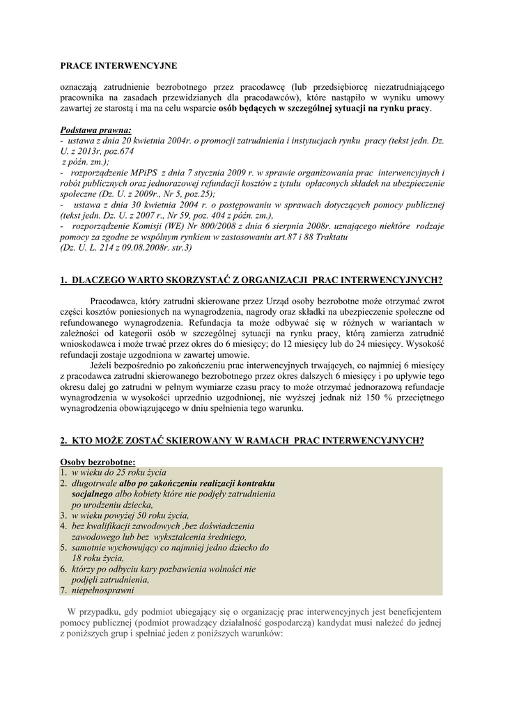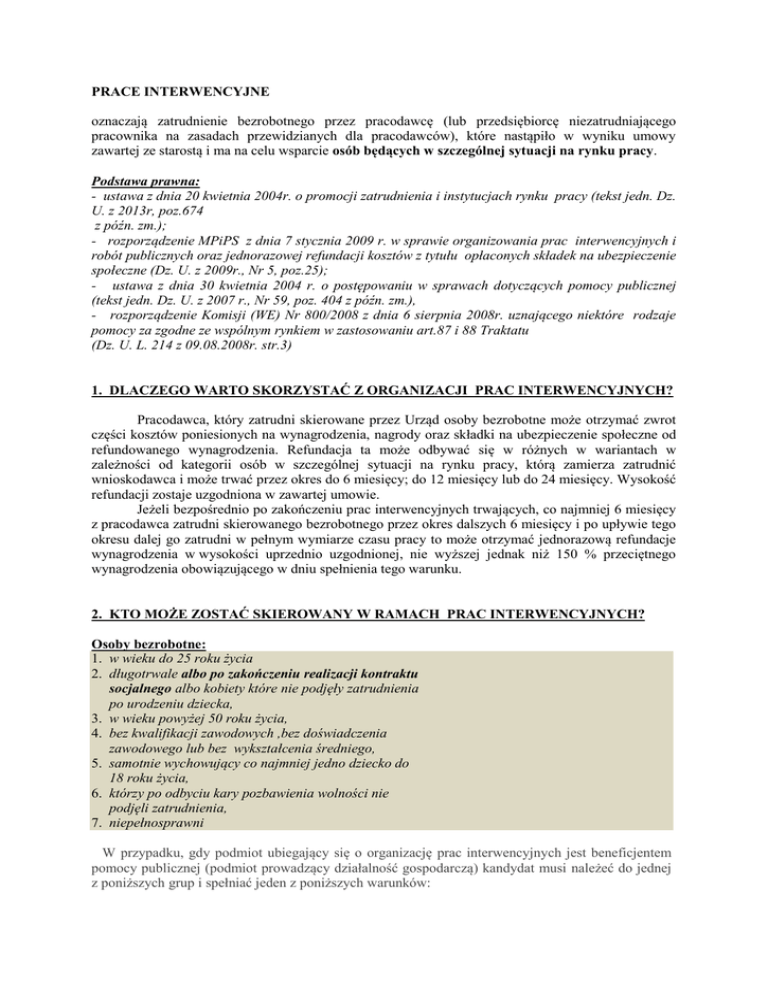 PRACE INTERWENCYJNE oznaczają zatrudnienie bezrobotnego przez pracodawcę (lub przedsiębiorcę niezatrudniającego pracownika na zasadach przewidzianych dla pracodawców), które nastąpiło w wyniku umowy zawartej ze starostą i ma na celu wsparcie osób będących w szczególnej sytuacji na rynku pracy. Podstawa prawna: - ustawa z dnia 20 kwietnia 2004r. o promocji zatrudnienia i instytucjach rynku pracy (tekst jedn. Dz. U. z 2013r, poz.674 z późn. zm.); - rozporządzenie MPiPS z dnia 7 stycznia 2009 r. w sprawie organizowania prac interwencyjnych i robót publicznych oraz jednorazowej refundacji kosztów z tytułu opłaconych składek na ubezpieczenie społeczne (Dz. U. z 2009r., Nr 5, poz.25); - ustawa z dnia 30 kwietnia 2004 r. o postępowaniu w sprawach dotyczących pomocy publicznej (tekst jedn. Dz. U. z 2007 r., Nr 59, poz. 404 z późn. zm.), - rozporządzenie Komisji (WE) Nr 800/2008 z dnia 6 sierpnia 2008r. uznającego niektóre rodzaje pomocy za zgodne ze wspólnym rynkiem w zastosowaniu art.87 i 88 Traktatu (Dz. U. L. 214 z 09.08.2008r. str.3) 1. DLACZEGO WARTO SKORZYSTAĆ Z ORGANIZACJI PRAC INTERWENCYJNYCH? Pracodawca, który zatrudni skierowane przez Urząd osoby bezrobotne może otrzymać zwrot części kosztów poniesionych na wynagrodzenia, nagrody oraz składki na ubezpieczenie społeczne od refundowanego wynagrodzenia. Refundacja ta może odbywać się w różnych w wariantach w zależności od kategorii osób w szczególnej sytuacji na rynku pracy, którą zamierza zatrudnić wnioskodawca i może trwać przez okres do 6 miesięcy; do 12 miesięcy lub do 24 miesięcy. Wysokość refundacji zostaje uzgodniona w zawartej umowie. Jeżeli bezpośrednio po zakończeniu prac interwencyjnych trwających, co najmniej 6 miesięcy z pracodawca zatrudni skierowanego bezrobotnego przez okres dalszych 6 miesięcy i po upływie tego okresu dalej go zatrudni w pełnym wymiarze czasu pracy to może otrzymać jednorazową refundacje wynagrodzenia w wysokości uprzednio uzgodnionej, nie wyższej jednak niż 150 % przeciętnego wynagrodzenia obowiązującego w dniu spełnienia tego warunku. 2. KTO MOŻE ZOSTAĆ SKIEROWANY W RAMACH PRAC INTERWENCYJNYCH? Osoby bezrobotne: 1. w wieku do 25 roku życia 2. długotrwale albo po zakończeniu realizacji kontraktu socjalnego albo kobiety które nie podjęły zatrudnienia po urodzeniu dziecka, 3. w wieku powyżej 50 roku życia, 4. bez kwalifikacji zawodowych ,bez doświadczenia zawodowego lub bez wykształcenia średniego, 5. samotnie wychowujący co najmniej jedno dziecko do 18 roku życia, 6. którzy po odbyciu kary pozbawienia wolności nie podjęli zatrudnienia, 7. niepełnosprawni W przypadku, gdy podmiot ubiegający się o organizację prac interwencyjnych jest beneficjentem pomocy publicznej (podmiot prowadzący działalność gospodarczą) kandydat musi należeć do jednej z poniższych grup i spełniać jeden z poniższych warunków: grupa osób będąca w szczególnie niekorzystnej sytuacji: 1. osoby bez stałego zatrudnienia za wynagrodzeniem w okresie ostatnich sześciu miesięcy, 2. osoby niemające wykształcenia ponadgimnazjalnego lub zawodowego, 3. osoby w wieku ponad 50 lat, 4. osoby dorosłe mieszkające samotnie, mające na utrzymaniu co najmniej jedną osobę, 5. członkowie mniejszości etnicznej w państwie członkowskim, którzy w celu zwiększenia szans na uzyskanie dostępu do stałego zatrudnienia muszą poprawić znajomość języka, uzupełnić szkolenia zawodowe lub zwiększyć doświadczenie zawodowe. grupa osób będąca w bardzo niekorzystnej sytuacji: 1. osoby pozostające w rejestrze bezrobotnych, przez co najmniej 24 miesiące Pracownik zatrudniony przez beneficjenta pomocy publicznej w ramach pomocy w formie subsydiów płacowych na rekrutację pracowników znajdujących się: - w szczególnie niekorzystnej sytuacji jest uprawniony do nieprzerwanego zatrudnienie przez okres 12 miesięcy, - w bardzo niekorzystnej sytuacji przez okres 24 miesięcy, a pracodawca może rozwiązać umowę o pracę tylko w przypadku naruszenia przez pracownika obowiązków pracowniczych. 3. JAKI JEST TRYB ORGANIZOWANIA PRAC INTERWENCYJNYCH? złożenie kompletnego i prawidłowo wypełnionego wniosku o organizację prac interwencyjnych, zaopiniowanie wniosku przez komisję powołaną Zarządzeniem Dyrektora PUP, powiadomienie wnioskodawcy (w terminie do 30 dni) o podjętej decyzji, w przypadku uwzględnienia wniosku zawarcie umowy o organizację prac interwencyjnych, wydanie osobie bezrobotnej skierowania, zawarcie umowy o pracę ze skierowaną osobą.. 4. NIE MOŻNA ZORGANIZOWAĆ PRAC INTERWENCYJNYCH, JEŻELI PRACODAWCA: - znajduje się w trudnej sytuacji ekonomicznej w rozumieniu art.1 pkt7 Rozporządzenia Komisji (WE) Nr 800/2008 z dnia 06.08.2008r., uznającego niektóre rodzaje pomocy za zgodne ze wspólnym rynkiem w zastosowaniu art. 87 i 88 Traktatu (Dz. Urz. UE L 214 z 09.08.2008 str. 3) oraz Wytycznych wspólnotowych dotyczących pomocy państwa w celu ratowania i restrukturyzacji zagrożonych przedsiębiorstw (Dz. Urz. UE C 244 z 01.10.2004, str. 2). Prace interwencyjne nie mogą być organizowane przez pracodawców będących: 1) 2) 3) 4) 5) 6) partiami lub organizacjami politycznymi; posłami lub senatorami na potrzeby biur poselskosenatorskich; organizacjami związków zawodowych, z wyjątkiem upoważnionych do prowadzenia pośrednictwa pracy związkowych biur pracy oraz klubów pracy; organizacjami pracodawców, z wyjątkiem upoważnionych do prowadzenia pośrednictwa pracy biur oraz klubów pracy; urzędami naczelnych i centralnych organów administracji państwowej; kościołami lub związkami wyznaniowymi, z wyłączeniem osób prawnych i jednostek organizacyjnych, o których mowa w art. 3 ust. 3 pkt 1 ustawy z dnia 24 kwietnia 2003r. o działalności pożytku publicznego i o wolontariacie (Dz. U. Nr 96, poz. 873, z późn. zm.; 7) przedstawicielstwami państw obcych. SZCZEGÓŁOWE INFORMACJE ORAZ POMOC PRZY WYPE