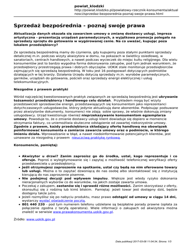powiat_klodzki http://powiat.klodzko.pl/powiatowy-rzecznik-konsumenta/aktual nosci/sprzedaz-bezposrednia-poznaj-swoje-prawa.html Sprzedaż bezpośrednia - poznaj swoje prawa Aktualizacja danych okazała się zawarciem umowy o zmianę dostawcy usługi, impreza artystyczna - prezentacją urządzeń paramedycznych, a wyjątkowa promocja polegała na sprzedaży sprzętu do gotowania w wygórowanej cenie. Na co uważać, kupując poza lokalem przedsiębiorcy? Ze sprzedażą bezpośrednią mamy do czynienia, gdy kupujemy poza stałymi punktami sprzedaży detalicznej m.in. podczas wizyty akwizytora w domu, na pokazach w świetlicy osiedlowej, w sanatoriach, centrach handlowych, a nawet podczas wycieczek do miejsc kultu religijnego. Dla wielu konsumentów jest to bardzo wygodna forma dokonywania zakupów, pod tym jednak warunkiem, że przedsiębiorcy przestrzegają prawa i dobrych obyczajów. UOKiK stale monitoruje przedsiębiorców zajmujących się sprzedażą bezpośrednią. W toku jest 16 postępowań dotyczących podmiotów działających w tej branży. Działania Urzędu dotyczą sprzedaży m.in. wyrobów paramedycznych, garnków, urządzeń do gotowania, pościeli oraz sprzedaży energii elektrycznej i usług telekomunikacyjnych. Niezgodne z prawem praktyki Wśród najczęściej kwestionowanych praktyk związanych ze sprzedażą bezpośrednią jest ukrywanie tożsamości przedsiębiorcy i handlowego celu działań. Przykładem mogą być wizyty przedstawicieli sprzedawców energii, przedstawiających się konsumentom jako reprezentanci dotychczasowych usługodawców, którzy jedynie aktualizują dane abonentów. Podpisując podsuwane przez akwizytorów dokumenty, konsumenci nie zdają sobie sprawy, że właśnie dokonują zmiany usługodawcy. Urząd kwestionuje również nieprzekazywanie konsumentom egzemplarza umowy. Powoduje to, że o zmianie dostawcy usługi klient dowiaduje się dopiero w momencie otrzymania faktury, co uniemożliwia skuteczne odstąpienie od zawartej niekorzystnie umowy. Zgodnie z prawem, każdy przedsiębiorca składający ofertę handlową ma obowiązek poinformować konsumenta o zamiarze zawarcia umowy oraz o podmiocie, w którego imieniu działa. Wprowadzanie w błąd, a nawet niedoinformowanie potencjalnych klientów, jest uznawane za niezgodną z prawem nieuczciwą praktykę rynkową. Konsumencie, pamiętaj: Akwizytor u drzwi? Zanim zaprosisz go do środka, ustal, kogo reprezentuje i co oferuje. Poproś o wylegitymowanie się i zapytaj o możliwość telefonicznej weryfikacji oferty przedstawiciela u przedsiębiorcy. Jeśli otrzymujesz zaproszenie na spotkanie, ustal czy będą na nim oferowane towary lub usługi. Można o to zapytać dzwoniącą do nas osobę albo skontaktować się z instytucją kierującą do nas zaproszenie pisemne. Nie podejmuj decyzji pod wpływem impulsu . Większe jest wtedy ryzyko dokonania nieracjonalnych wyborów co do warunków, na jakich zostaje zawarta umowa. Poczekaj z zakupem, zastanów się i sprawdź różne możliwości. Zanim skorzystasz z oferty, skonsultuj się z rodziną lub kimś bliskim. Pamiętaj: jeżeli towar jest dostępny dziś, będzie dostępny także jutro. Jeżeli rozmyślisz się po nabyciu produktu, masz prawo odstąpić od umowy w ciągu 14 dni, wystarczy wysłać oświadczenie pocztą. 801 440 220 - pod tym numerem telefonu udzielane są bezpłatne porady prawne (opłata za połączenie zgodna z taryfą operatora). Wiele informacji o zakupach od akwizytora można znaleźć w serwisie www.prawakonsumenta.uokik.gov.pl. Źródło: www.uokik.gov.pl Data publikacji 2017-03-08 11:04:34, Strona: 1/3 powiat_klodzki http://powiat.klodzko.pl/powiatowy-rzecznik-konsumenta/aktual nosci/sprzedaz-bezposrednia-poznaj-swoje-prawa.html Data publikacji 2017-03-08 11:04:35, Strona: 2/3 powiat_klodzki http://powiat.klodzko.pl/powiatowy-rzecznik-konsumenta/aktual nosci/sprzedaz-bezposrednia-poznaj-swoje-prawa.html Data publikacji 2017-03-08 11:04:35, Strona: 3/3