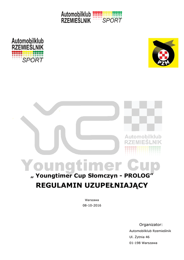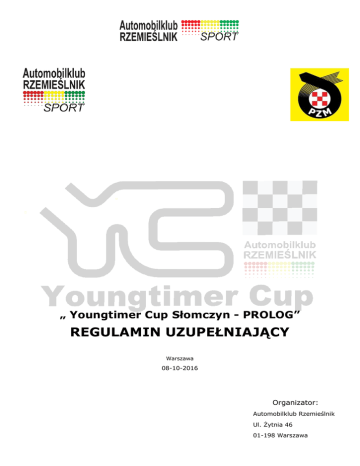„ Youngtimer Cup Słomczyn - PROLOG” REGULAMIN UZUPEŁNIAJĄCY Warszawa 08-10-2016 Organizator: Automobilklub Rzemieślnik Ul. Żytnia 46 01-198 Warszawa SPIS TREŚCI: 1. USTALENIA OGÓLNE 2. ORGANIZACJA 3. ZGŁOSZENIA 4. UBEZPIECZENIE 5. NUMERY IDENTYFIKACYJNE 6. REKLAMA 7. ODBIÓR ADMINISTRACYJNY 8. ZAPOZNANIE Z TRASĄ 9. BADANIA KONTROLNE 10. OPONY 11. ODPRAWA UCZESTNIKÓW 12. PRZEBIEG IMPREZY 13. PROCEDURA STARTU 14. POMIAR CZASU 15. META KJS 16. BEZPIECZEŃSTWO 17. IDENTYFIKACJA OSÓB OFICJALNYCH PODCZAS YTC 18. NAGRODY 19. PROTESTY 20. KARY 21. POSTANOWIENIA KOŃCOWE Impreza Youngtimer Cup Słomczyn - PROLOG (zwany dalej YTC) zostanie przeprowadzony zgodnie z postanowieniami: Międzynarodowego Kodeksu Sportowego FIA, Regulaminu Sportowego Rajdów Regionalnych FIA wraz z załącznikami, Regulaminu Konkursowej Jazdy Samochodem, Regulaminu Ochrony Środowiska w Sportach Motorowych, Ustawy „Prawo o ruchu drogowym”, niniejszego regulaminu uzupełniającego. Modyfikacje, zmiany i/lub uzupełnienia do niniejszego regulaminu uzupełniającego będą publikowane wyłącznie w numerowanych i datowanych komunikatach ogłaszanych przez Dyrektora imprezy. Otwarcie listy zgłoszeń 19.09.2016 Zamknięcie listy zgłoszeń 05.10.2016 Odbiór administracyjny 08.10.2016 godz. 7:00-9:00 Badanie kontrolne BK 1 08.10.2016 godz. 7:15-9:15 Odprawa uczestników 08.10.2016 godz. 9:30 Przejazd zapoznawczy (zapoznanie z trasą) 08.10.2016 godz. 9:45 Start 08.10.2016 godz. 10:00 Meta 08.10.2016 godz. 16:00 Opublikowanie końcowej klasyfikacji prowizorycznej 08.10.2016 godz. 16:30 Rozdanie nagród 08.10.2017 godz. 17:00 1. USTALENIA OGÓLNE 1.1. Miejsce i termin imprezy Impreza odbędzie się w dniu 08.10.2016 na torze kartingowym w Słomczynie k. Grójca 1.2. Nazwa i ranga imprezy YTC rozgrywany jest jako impreza typu „Rally sprint”, i nie zawiera elementów jazdy okrężnej, punktów kontroli czasu PKC, nie jest również wymagany udział pilota. 1.3. Numer wizy ZO PZM Numer wizy S/251/2016 wydana przez OKSS PZM w Warszawie w dniu 14.07.2016. 1.4. Lokalizacja biura Biuro znajdować się będzie do dnia 07.10.2016 pod adresem Żytnia 46, 01-198 Warszawa w godzinach 8-16 W dniu imprezy na terenie toru kartingowego w Słomczynie, pod adresem Słomczyn 66 – zgodnie z lokalizacją na planie. 1.5. Lokalizacja startu i mety Start –Tor kartingowy w Słomczynie Meta – Tor kartingowy w Słomczynie godz. 10:00 godz. 16:00 1.6. Charakterystyka Impreza zostanie przeprowadzona w ciągu jednego dnia. Na trasie zlokalizowane będą 4 próby. Nawierzchnia prób : asfalt Długość trasy: 10km (4 próby o długości <2,5km) Ze względu na brak jazdy okrężnej, organizator nie przewidział książki drogowej 1.7. Ukończenie/sklasyfikowanie w YTC nie uprawnia do uzyskania licencji sportu samochodowego stopnia RN. 2. ORGANIZACJA 2.1. Nazwa organizatora Automobilklub Rzemieślnik 2.2. Adres Ul. Żytnia 46, 01-198 Warszawa tel. (22) 652-00-15 www.ak-rzemieslnik.pl e-mail: [email protected] 2.3. Władze Osoby oficjalne Dyrektor imprezy Radosław Chrzanowski Kierownik zabezpieczenia Jakub Mroczkowski Kierownik próby sportowej Szymon Waśkowski Kierownik biura Monika Miałkowska Kierownik chronometrażu / komisji obliczeń Michał Kulik Kierownik badania kontrolnego Piotr Sankiewicz 3. ZGŁOSZENIA 3.1. Załoga 3.1.1. Załogę stanowią: Wyłącznie kierowca lub kierowca i pilot. Kierowca musi posiadać prawo jazdy kategorii B (lub licencję sportu samochodowego), a pilot ukończone 17 lat. 3.1.2. Kierowca posiadający licencję sportu samochodowego, niezależnie od pojemności skokowej pojazdu, będzie klasyfikowany w klasie „GOŚĆ” 3.1.3. Pilot nie może prowadzić samochodu podczas imprezy. W przypadku stwierdzenia prowadzenia samochodu przez pilota, załoga zostanie wykluczona. 3.2. Obowiązki załogi Do obowiązków załogi należy: 3.2.1. Obecność na odprawie uczestników 3.2.2. Przejazd prób imprezy w kolejności określonej przez organizatora. 3.2.3. Odbycie wszystkich prób w zapiętych pasach bezpieczeństwa, zapiętych kaskach ochronnych, z włączonymi światłami mijania lub światłami do jazdy dziennej (jeżeli samochód jest w nie wyposażony) oraz zamkniętymi szybami i szyberdachem. Nieprzestrzeganie powyższych przepisów pociągnie za sobą karę do wykluczenia włącznie. 3.3. Procedura zgłoszeń 3.3.1. Uczestnik zamierzający wziąć udział w YTC musi przesłać do dnia 05.10.2016 do godz. 24:00 wypełnione zgłoszenie w wersji elektronicznej. Zgłoszenie będzie dostępne na stronie organizatora www.ak-rzemieslnik.pl , 3.3.2. Oryginał zgłoszenia musi być podpisany przez wszystkich członków załogi w trakcie odbioru administracyjnego 3.3.3. Zgłoszenie zostanie przyjęte tylko w przypadku, gdy towarzyszyć mu będzie pokwitowanie wpłaty pełnej kwoty wpisowego. 3.3.4. Przez fakt podpisania zgłoszenia załoga przyjmuje do wiadomości, że startuje w imprezie na własną odpowiedzialność i zrzeka się wszelkich praw do odszkodowań za straty wynikłe podczas imprezy. Zrzeczenie to dotyczy FIA, PZM, organizatora, osób oficjalnych występujących w imprezie i innych uczestników. 3.3.5. Organizator ma prawo nie przyjęcia zgłoszenia, szczególnie w przypadkach: - nieetycznego zachowanie - nieczytelnego zgłoszenia. 3.3.6. Jeżeli limit zgłoszonych załóg nie zostanie przekroczony, uczestnik może się zgłosić w dniu imprezy, bezpośrednio w biurze zawodów. W takim przypadku wpisowe będzie przyjmowane wyłącznie w formie gotówkowej 3.4. Limit zgłoszonych załóg 3.4.1. Limit zgłoszonych załóg wynosi 120załóg 3.4.2. W przypadku zgłoszenia więcej niż 120 załóg o przyjęciu decydować będzie kolejność wpływu zgłoszeń. Zgłoszenia bez wpłaty wpisowego nie będą przyjmowane. O przyjęciu większej ilości załóg decyduje Dyrektor Imprezy. 3.5. Pojazdy dopuszczone Do udziału w YTC dopuszcza się: Samochody osobowe w rozumieniu Ustawy „Prawo o ruchu dro