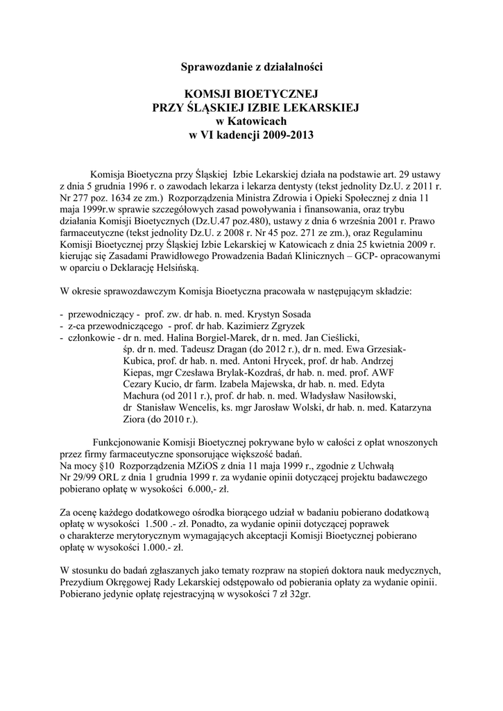 Komisji Bioetycznej przy Śląskiej Izbie Lekarskiej w Katowicach z dnia 25 kwietnia 2009 r.