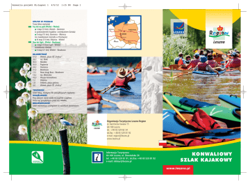 konwalia projekt PL:Layout 1 4/5/12 1:15 PM Page 1 SPŁYW W PIGUŁCE Trasa (dwa warianty) Trzy dni na pętli (Wieleń - Wieleń) I etap (13 km); Wieleń - Dominice (z przewożeniem kajaków i zwiedzaniem Górska) II etap (15 km); Dominice - Błotnica (ze zwiedzaniem kościoła w Przemęcie) III etap (13 km); Olejnica - Wieleń Dwa dni (Lgiń - Wieleń - Boszkowo) I etap (13 km); Lgiń - Wieleń (zwiedzanie Górska) II etap (21 km); Wieleń - Boszkowo GDAŃSK BERLIN WARSZAWA POZNAŃ LESZNO WROCŁAW PRAGA KRAKÓW KILOMETRAŻ 37,0 33,7 30,4 26,9 24,2 21,2 17,1 13,2 10,3 7,2 1,8 0,0 Wieleń, plaża OŻ „Krokus” Jez. Białe Miastko Papiernia Dominice Boszkowo Most drogi Bucz - Boszkowo Jez. Błotnickie Wyspa Konwaliowa Olejnica Osłonin, plaża gminna Wieleń, plaża OŻ „Krokus” TRUDNOŚĆ Szlak łatwy, dostępny dla początkujących kajakarzy. UCIĄŻLIWOŚĆ Przy niższym stanie wody szczególnie uciążliwe może być przepłynięcie przez Jez. Miałkie. MALOWNICZOŚĆ Szlak malowniczy szczególnie na odcinkach jeziorowych. Organizacja Turystyczna Leszno-Region ul. Kazimierza Karasia 15 64-100 Leszno tel. +48 65 529 82 34 tel./fax +48 65 529 81 92 e-mail: [email protected] www.leszno.pl Informacja Turystyczna 64-100 Leszno, ul. Słowiańska 24 tel. +48 65 529 81 91, tel./fax +48 65 529 81 92 e-mail: [email protected] KONWALIOWY SZLAK KAJAKOWY konwalia projekt PL:Layout 1 4/5/12 1:15 PM Page 2 Ruszamy na szlak! Dzień drugi Dzień trzeci Z terenu Ośrodka Żeglarskiego „Krokus”, zarządzanego przez Fundację „Tratwa” z Wrocławia, wypływamy na Jez. Wieleńskie i kierujemy się w jego prawą stronę, by po 2 km dopłynąć do dużej zatoki, zwanej Jez. Trzytoniowym i przy jego prawym brzegu (od naszej lewej ręki) osiągnąć ujęcie skanalizowanej Strugi Kaszczorskiej. Przedostajemy się na Jez. Breńskie, z którego od razu kierujemy się w lewo na kolejne Jez. Białe. Stąd przez przewężenie zasnute trzcinami wpływamy na Jez. Miałkie, które stanowi poważne wyzwanie dla kajakarzy. Niezmiernie płytkie w okresie letnim utrudnia posuwanie się do przodu nawet wprawnym osadom. Należy płynąć wzdłuż jego prawego brzegu (w przeciwnym kierunku - lewego) i w żadnej mierze nie opuszczać kajaka! Po pół godzinie wpływamy w kolejny odcinek Strugi Kaszczorskiej i docieramy do miejsca odpoczynku, przed mostem drogowym koło wsi Miastko. (Tu na łące możemy zostawić kajaki i udać się na zwiedzanie odległej o 2 km galerii drewnianych rzeźb Mariana Murka w Górsku). Po kilku minutach wpływamy na malowniczo usytuowane jez. Lincjusz, do którego z naszej prawej strony uchodzi Struga Kaszczorska, zwana wyżej Starą Rzeką. Tworzy ona atrakcyjny szlak kajakowy z Jezior Lgińskich o łącznej długości do mostu w Miastku 6,5 km, który stanowi także, alternatywną do opisywanej, trasę spływu na odcinku Lgiń (plaża gminna) - Wieleń. Płynąc w przeciwnym do opisywanego kierunku możemy zaplanować spływ na dwa dni, pomijając uciążliwości związane z przewożeniem i przenoszeniem kajaków na odcinku Papiernia - most kolejowy w Boszkowie. My jednak udajemy się w głąb jez. Brzeźnie. Brzeg jeziora otacza pas trzcin, z którego wystają prywatne pomosty wędkarskie. Mała plaża na końcu jez. Brzeźnie należy do Hufca ZHP z Legnicy, który nie wpuszcza na swój rozległy teren przybyszów z wody. Przez trzciny dopływamy płytkim, zarośniętym kanałem do mostu ziemnej drogi obok zabudowań dawnego leśnictwa Papiernia. Stąd musimy kajaki przewieźć na odległość 2,5 km drogą przez lasy do wsi Dominice, położonej na skraju Jez. Dominickiego. Po drodze mijamy jez. Maszynek, położone bardzo malowniczo w głębi lasu z lewej strony drogi. W Dominicach możemy zanocować w schronisku młodzieżowym lub na zapleczu plaży gminnej. Znajdziemy tu również sklep i bar. Możemy też po zostawieniu kajaków powrócić na nocleg do Wielenia, traktując ten dzień jako pierwszy etap spływu o długości 13 km. Wypływamy na zatłoczone żaglówkami i deskami surfingowymi Jez. Dominickie i zdążamy do widocznej z daleka wielkiej plaży publicznej w Boszkowie. Powinna wypływać stąd Struga Boszkowska, ale obecnie kanał przy jeziorze jest częściowo zasypany, a jaz nie sprawia wrażenia sprawnego. Dostatecznie głęboką wodę znajdziemy dopiero za wiaduktem kolejowym. Z tego powodu przenosimy kajaki na odległość 300 m, aby pokonać górą wysoki nasyp torów czynnej linii kolejowej Wolsztyn - Leszno. Po wodowaniu ze stromego brzegu, dalej bez przeszkód odpływamy skanalizowaną Strugą Boszkowską do Jez. Wielkiego, a następnie wybagrowanym kanałem do Jez. Buckiego. Jezioro jest płytkie, ale jego pokonanie nie przedstawia dużych trudności. Pod mostem Bucz Boszkowo kajaki przeprowadzamy uważnie przez betonowe płyty i osiągamy Jez. Boszkowskie. Z niego płyniemy długim odcinkiem Kanału Błotnickiego z jednym dogodnym wyjściem z wody na lewy brzeg przed czwartym mostem (drugi murowany), przy wysokich drzewach. Kanał doprowadza nas do Jez. Błotnickiego, pierwszego z rynnowego ciągu ośmiu Jezior Przemęckich, zakończonych jeziorami Wieleńskim i Trzytoniowym. W końcu jeziora po naszej prawej ręce znajdziemy malutką plażę z łodziami wędkarskimi i kajakami klubu z Błotnicy. Doskonałe miejsce na odpoczynek. Naprzeciwko z jeziora wypływa Kanał Przemęcki, którym pod wiaduktem kolejowym docieramy do Jez. Przemęckiego Małego. Gęsta moczarka oraz grążele pokrywają część tafli jeziornej, ale nie czyni to przeszkody w poruszaniu się do przodu. Płyniemy na wprost wysokich wieżyc kościoła pocysterskiego w Przemęcie, aż do widocznego w trzcinach wypływu. Szybko docieramy do mostu drogowego, przy którym zbudowano schodki do wyjścia z wody, niestety okolone barierkami, co uniemożliwia wyciągnięcie kajaków. Wychodzimy więc wcześniej na łąkę prawego brzegu w celu zwiedzenia tego cennego zabytku barokowej sztuki sakr