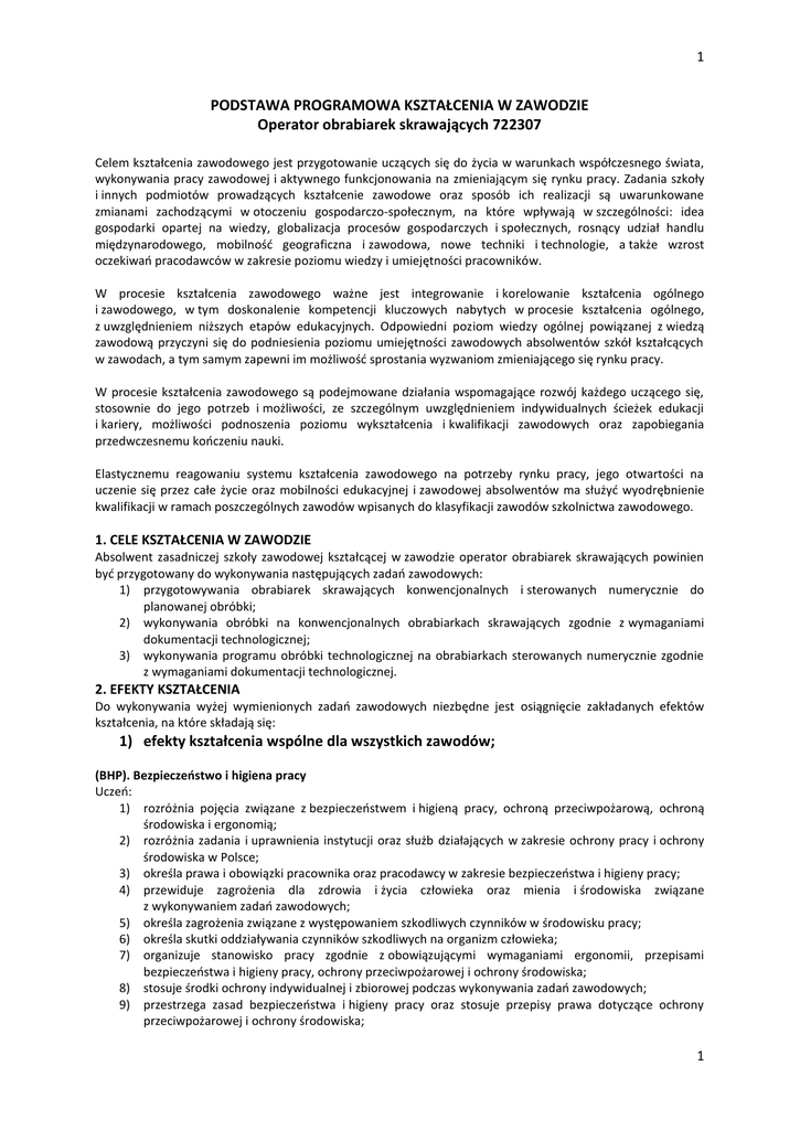 1 PODSTAWA PROGRAMOWA KSZTAŁCENIA W ZAWODZIE Operator obrabiarek skrawających 722307 Celem kształcenia zawodowego jest przygotowanie uczących się do życia w warunkach współczesnego świata, wykonywania pracy zawodowej i aktywnego funkcjonowania na zmieniającym się rynku pracy. Zadania szkoły i innych podmiotów prowadzących kształcenie zawodowe oraz sposób ich realizacji są uwarunkowane zmianami zachodzącymi w otoczeniu gospodarczo-społecznym, na które wpływają w szczególności: idea gospodarki opartej na wiedzy, globalizacja procesów gospodarczych i społecznych, rosnący udział handlu międzynarodowego, mobilność geograficzna i zawodowa, nowe techniki i technologie, a także wzrost oczekiwań pracodawców w zakresie poziomu wiedzy i umiejętności pracowników. W procesie kształcenia zawodowego ważne jest integrowanie i korelowanie kształcenia ogólnego i zawodowego, w tym doskonalenie kompetencji kluczowych nabytych w procesie kształcenia ogólnego, z uwzględnieniem niższych etapów edukacyjnych. Odpowiedni poziom wiedzy ogólnej powiązanej z wiedzą zawodową przyczyni się do podniesienia poziomu umiejętności zawodowych absolwentów szkół kształcących w zawodach, a tym samym zapewni im możliwość sprostania wyzwaniom zmieniającego się rynku pracy. W procesie kształcenia zawodowego są podejmowane działania wspomagające rozwój każdego uczącego się, stosownie do jego potrzeb i możliwości, ze szczególnym uwzględnieniem indywidualnych ścieżek edukacji i kariery, możliwości podnoszenia poziomu wykształcenia i kwalifikacji zawodowych oraz zapobiegania przedwczesnemu kończeniu nauki. Elastycznemu reagowaniu systemu kształcenia zawodowego na potrzeby rynku pracy, jego otwartości na uczenie się przez całe życie oraz mobilności edukacyjnej i zawodowej absolwentów ma służyć wyodrębnienie kwalifikacji w ramach poszczególnych zawodów wpisanych do klasyfikacji zawodów szkolnictwa zawodowego. 1. CELE KSZTAŁCENIA W ZAWODZIE Absolwent zasadniczej szkoły zawodowej kształcącej w zawodzie operator obrabiarek skrawających powinien być przygotowany do wykonywania następujących zadań zawodowych: 1) przygotowywania obrabiarek skrawających konwencjonalnych i sterowanych numerycznie do planowanej obróbki; 2) wykonywania obróbki na konwencjonalnych obrabiarkach skrawających zgodnie z wymaganiami dokumentacji technologicznej; 3) wykonywania programu obróbki technologicznej na obrabiarkach sterowanych numerycznie zgodnie z wymaganiami dokumentacji technologicznej. 2. EFEKTY KSZTAŁCENIA Do wykonywania wyżej wymienionych zadań zawodowych niezbędne jest osiągnięcie zakładanych efektów kształcenia, na które składają się: 1) efekty kształcenia wspólne dla wszystkich zawodów; (BHP). Bezpieczeństwo i higiena pracy Uczeń: 1) rozróżnia pojęcia związane z bezpieczeństwem i higieną pracy, ochroną przeciwpożarową, ochroną środowiska i ergonomią; 2) rozróżnia zadania i uprawnienia instytucji oraz służb działających w zakresie ochrony pracy i ochrony środowiska w Polsce; 3) określa prawa i obowiązki pracownika oraz pracodawcy w zakresie bezpieczeństwa i higieny pracy; 4) przewiduje zagrożenia dla zdrowia i życia człowieka oraz mienia i środowiska związane z wykonywaniem zadań zawodowych; 5) określa zagrożenia związane z występowaniem szkodliwych czynników w środowisku pracy; 6) określa skutki oddziaływania czynników szkodliwych na organizm człowieka; 7) organizuje stanowisko pracy zgodnie z obowiązującymi wymaganiami ergonomii, przepisami bezpieczeństwa i higieny pracy, ochrony przeciwpożarowej i ochrony środowiska; 8) stosuje środki ochrony indywidualnej i zbiorowej podczas wykonywania zadań zawodowych; 9) przestrzega zasad bezpieczeństwa i higieny pracy oraz stosuje przepisy prawa dotyczące ochrony przeciwpożarowej i ochrony środowiska; 1 2 10) udziela pierwszej pomocy poszkodowanym w wypadkach przy pracy oraz w stanach zagrożenia zdrowia i życia. (PDG). Podejmowanie i prowadzenie działalności gospodarczej Uczeń: 1) stosuje pojęcia z obszaru funkcjonowania gospodarki rynkowej; 2) stosuje przepisy prawa pracy, przepisy prawa dotyczące ochrony danych osobowych oraz przepisy prawa podatkowego i prawa autorskiego; 3) stosuje przepisy prawa dotyczące prowadzenia działalności gospodarczej; 4) rozróżnia przedsiębiorstwa i instytucje występujące w branży i powiązania między nimi; 5) analizuje działania prowadzone przez przedsiębiorstwa funkcjonujące w branży; 6) inicjuje wspólne przedsięwzięcia z różnymi przedsiębiorstwami z branży; 7) przygotowuje dokumentację niezbędną do uruchomienia i prowadzenia działalności gospodarczej; 8) prowadzi korespondencję związaną z prowadzeniem działalności gospodarczej; 9) obsługuje urządzenia biurowe oraz stosuje programy komputerowe wspomagające prowadzenie działalności gospodarczej; 10) planuje i podejmuje działania marketingowe prowadzonej działalności gospodarczej; 11) optymalizuje koszty i przychody prowadzonej działalności gospodarczej. (JOZ). Język obcy ukierunkowany zawodowo Uczeń: 1) posługuje się zasobem środków językowych (leksykalnych, gramatycznych, ortograficznych oraz fonetycznych), umożliwiających realizację zadań zawodowych; 2) interpretuje wypowiedzi dotyczące wykonywania typowych czynności zawodowych artykułowane powoli i wyraźnie, w standardowej odmianie języka; 3) analizuje i interpretuje krótkie teksty pisemne dotyczące wykonywania typowych czynności zawodowych; 4) formułuje krótkie i zrozumiałe wypowiedzi oraz teksty pisemne umożliwiające komunikowanie się w środowisku pracy; 5) korzysta z obcojęzycznych źródeł informacji. (KPS). Kompetencje personalne i społeczne Uczeń: 1) przestrzega zasad kultury i etyki; 2) jest kreatywny i konsekwentny w realizacji zadań; 3) przewiduje skutki podejmowanych działań; 4) jest otwarty na zmiany; 5) potrafi