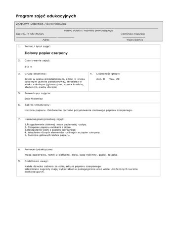 Program zajęć edukacyjnych ZIOŁOWY DZBANEK / Ewa Nisiewicz _______________________________________________________________________________________________________________________ Nazwa obiektu / nazwisko prowadzącego Sąpy 20, 14-420 Młynary warmińsko-mazurskie __________________________________ ______________ ___________________ Adres Województwo 1. Temat / tytuł zajęć: Ziołowy papier czerpany 2. Czas trwania zajęć: 2-3 h 3. Grupa docelowa: dzieci w wieku przedszkolnym, dzieci w wieku szkolnym (szkoła podstawowa), młodzież w wieku szkolnym (gimnazjum, szkoła średnia, studenci), osoby dorosłe 5. 4. Liczebność grupy: min. 8 max. 20 Prowadzący zajęcia: Ewa Nisiewicz 6. Zakres tematyczny: Historia papieru. Omówienie techniki pozyskiwania ziołowego papieru czerpanego. 7. Harmonogram/przebieg zajęć: 1.Przygotowanie ziołowej masy papierowej –pulpy. 2. Czerpanie papieru ramkami z sitem. 3.Odszączenie wody z papieru czerpanego. 4. Wtapianie różnych elementów roślinnych w papier czerpany. 5. Suszenie gotowych kartek papieru. 8. Pomoce dydaktyczne: masa papierowa, ramki z siatkami, zioła, susz roślinny, gąbki, żelazko. 9. Dodatkowe uwagi: Każde dziecko zabiera ze sobą arkusz papieru czerpanego. Właściciele zagrody mają wykształcenie pedagogiczne oraz wiele ukończonych kursów doskonalących.